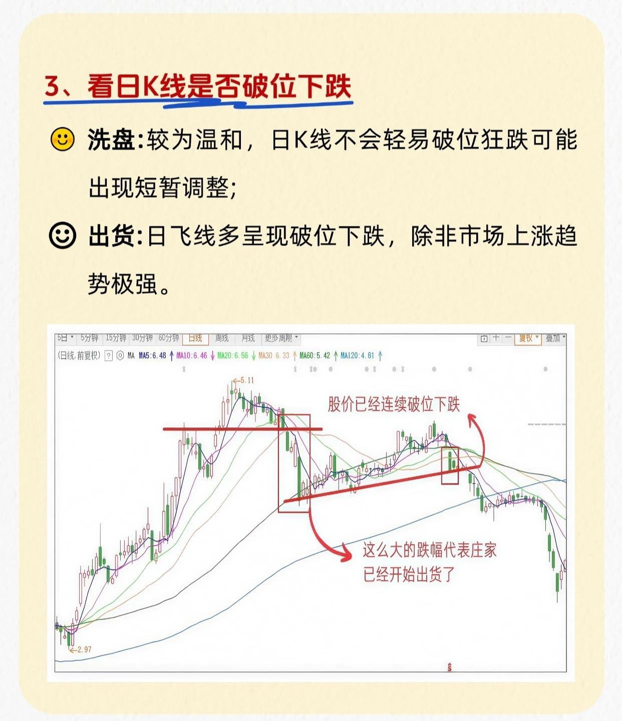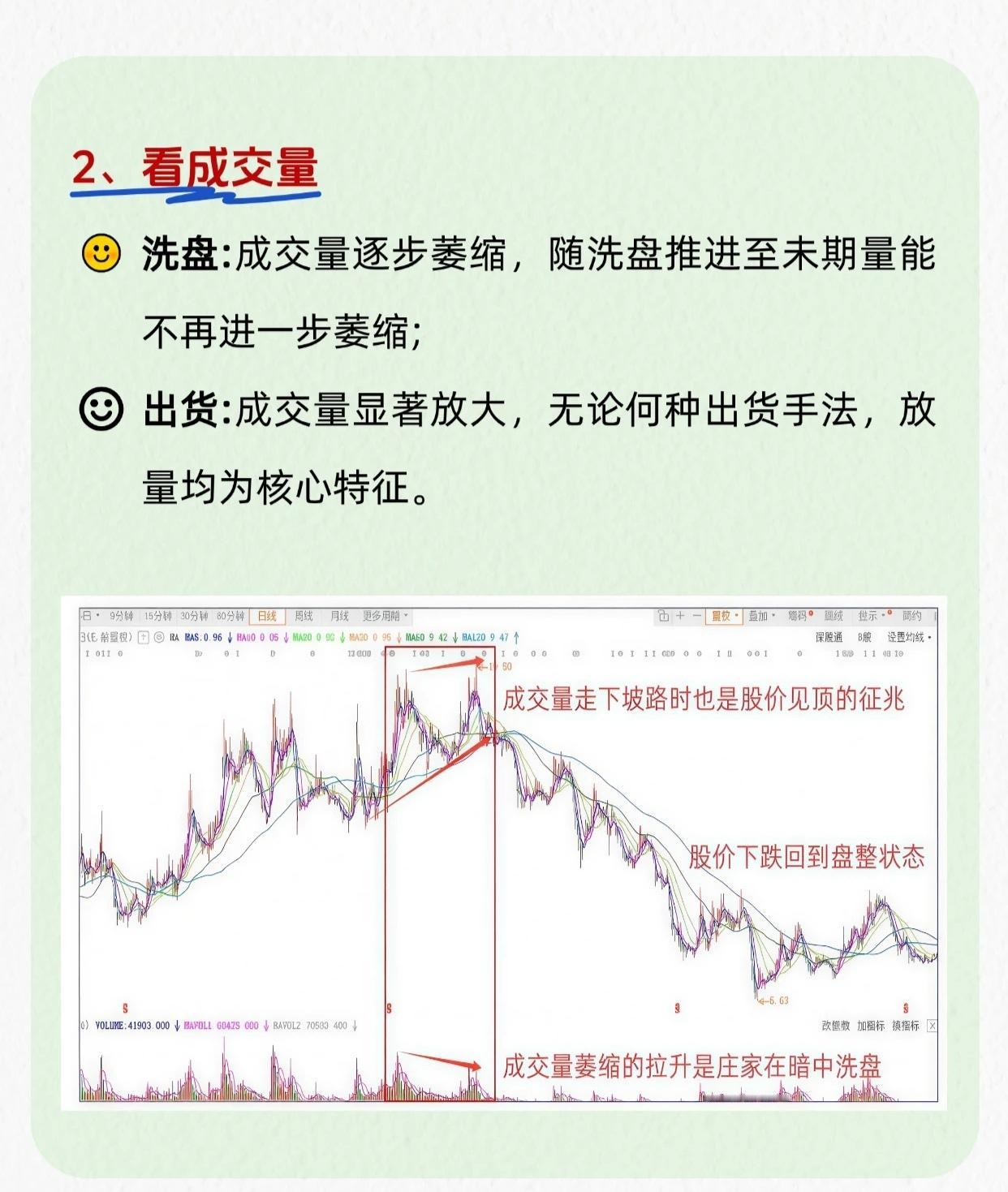 四招判断庄家洗盘还是出货: 1. 看均线 - 洗盘:均线可能短期向下破位,但长期均线无明显下降。 - 出货:均线随出货明显向下发散。 2. 看成交量 - 洗盘:成交量逐步萎缩,末期不再萎缩。 - 出货:成交量显著放大,放量是核心特征。 3. 看日K线是否破位下跌 - 洗盘:较温和,不会轻易破位狂跌,可能有短暂调整。 - 出货:多呈破位下跌(除非市场极强)。 4. 看庄家是否护盘 - 洗盘:庄家会护盘,在关键位置维持股价。 - 出货:不护盘,均线失支撑,股价放量跌破。
