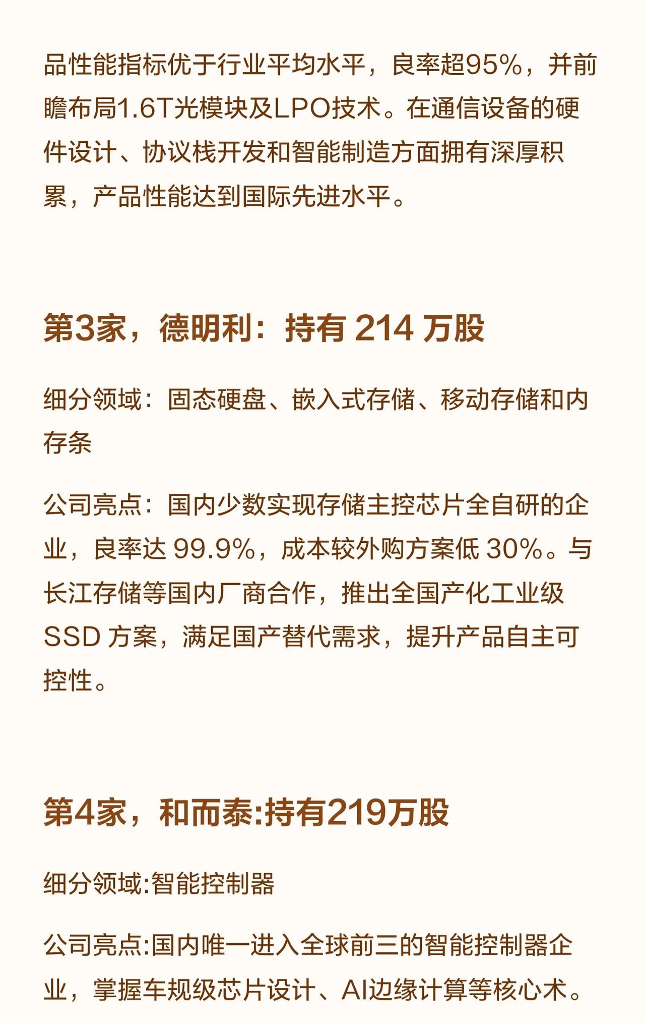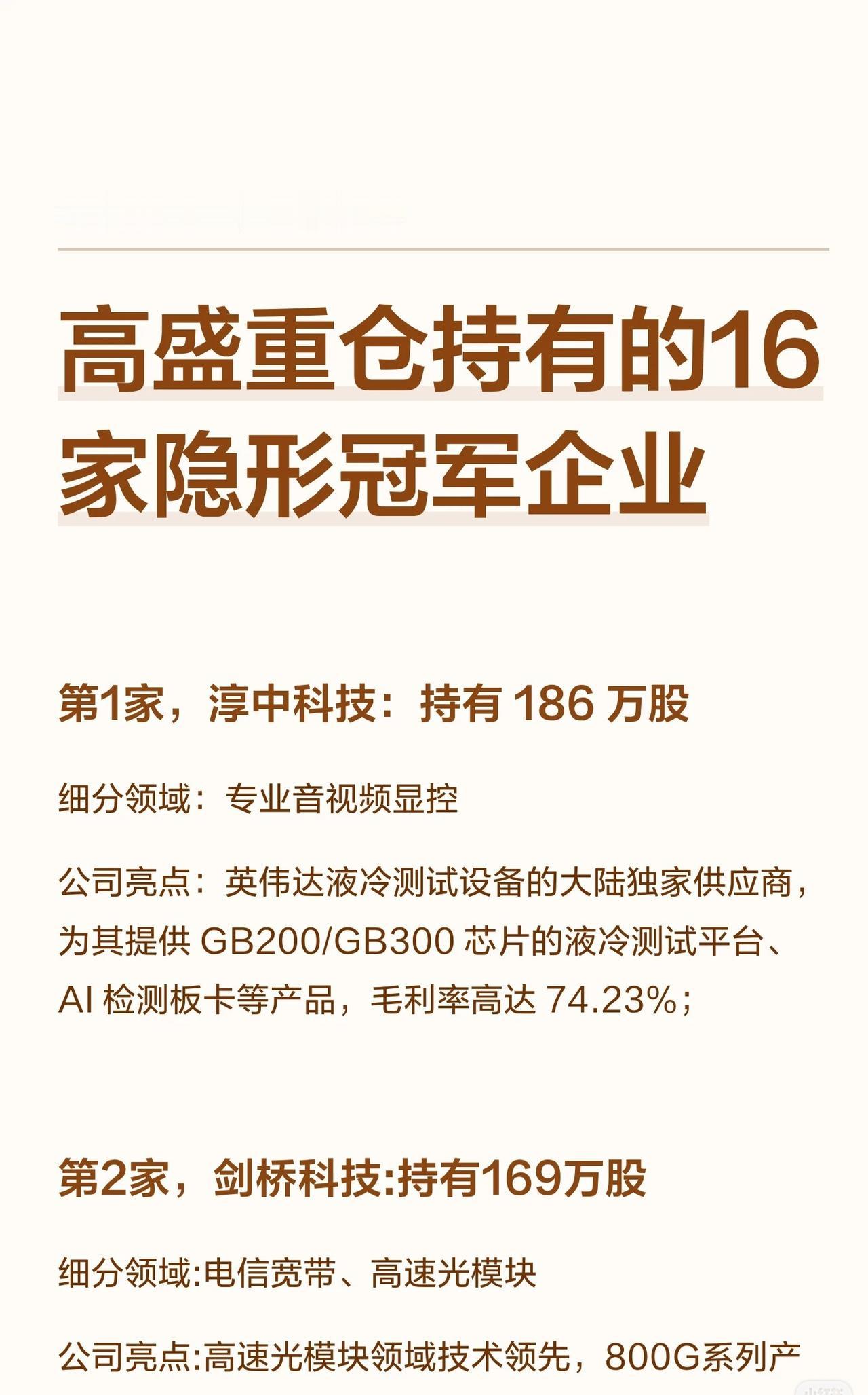 高盛重仓持有的16家隐形冠军企业,涵盖专业音视频显控、电信宽带、存储、智能控制器、建筑设计、新能源等多个细分领域,列举了每家企业的持股数量、核心业务及技术亮点(如淳中科技为英伟达液冷测试设备大陆独家供应商、华工科技800G光模块全球第三等)。