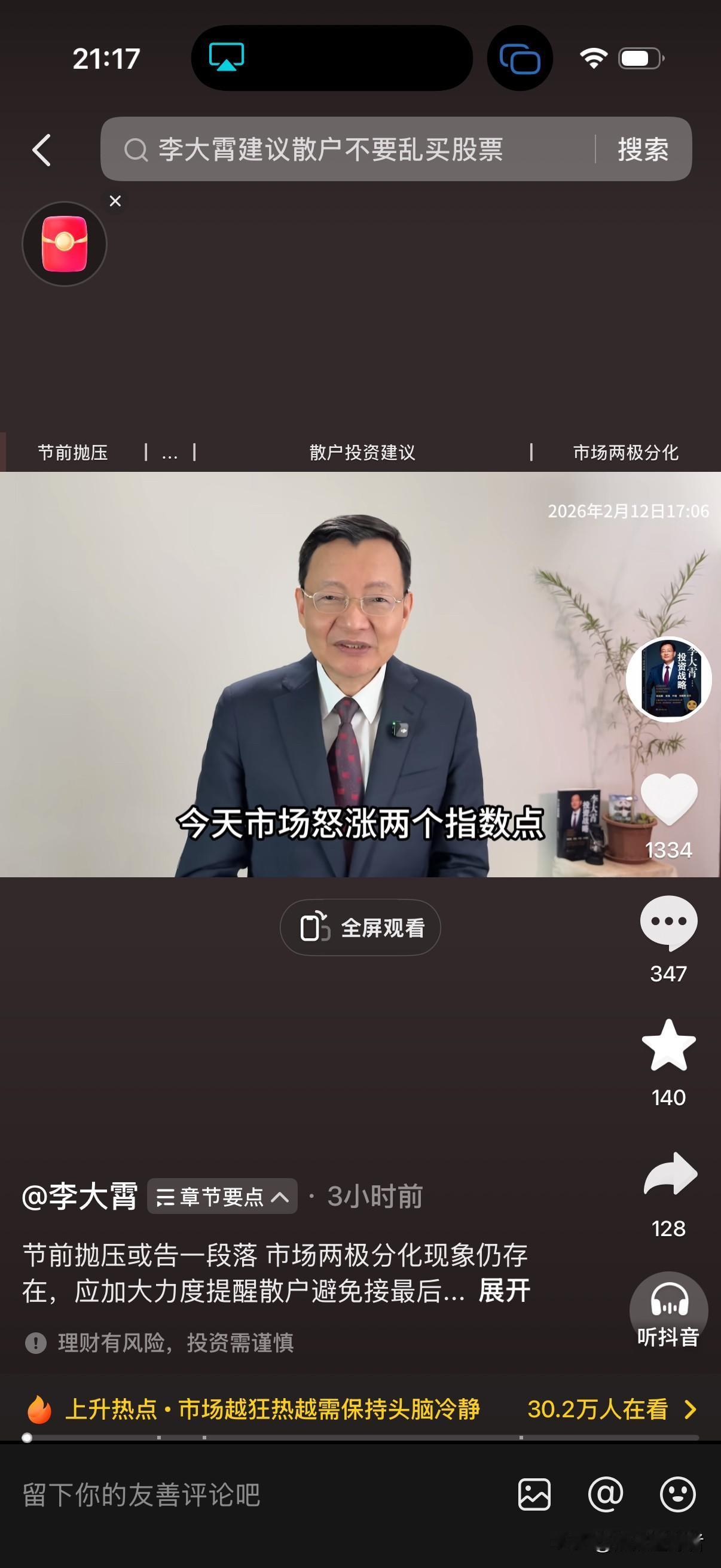 今天下午收盘后,经济学家李大霄更新视频对市场走势进行解读。李大霄说,今天市场上扬2个指数点,指数呈现出相当不错的格局,涨幅达0.05%,表现颇为亮眼。成交量相比昨天稍有放大,节前有资金需求的投资者已在今天完成抛售,因为明天卖出股票已无法在节前拿到资金。由此可见,A股节前最大的抛售压力已然结束。假期期间市场的所有波动,将取决于外围市场的表现。 尽管指数上涨,但待涨的股票家数达到3273家,市场又恢复了一贯的走势。今天机构买入733亿,散户卖出76.5亿,涨停股票有70家,跌停股票23家。 在视频中,李大霄还提醒散户,切勿接最后一棒,比如一直买不进的股票,当能够买进时或许就是最后一棒;此外,不要购买次新股,也不要买入被处罚的股票。
