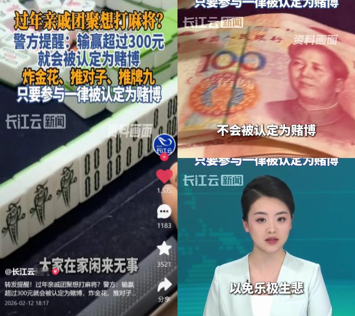 亲友打麻将超300元算赌博? 最近帽子叔叔的春节提醒把不少人整懵了,说亲友打麻将输赢超300元就认定赌博,炸金花这类玩法参与就算。 但这300元压根没定成全国统一标准,仅仅是北京的个人赌资门槛,各地的裁量基准差得老远。 就说这事儿多容易误导人!北京的规定被广泛转发,大家就以为全国都得卡300元,过年凑一桌麻将都得先数着兜里的钱? 明明《治安管理处罚法》根本没定全国统一数,都是各地自己定的,上海200元起,深圳要500,还有地方允许亲友少量输赢不算赌。 凭啥北京的标准就成了全国模板?这不明摆着执行尺度模糊吗? 大家担心的哪里是赌,分明是好好的年俗娱乐被误伤!过年跟亲戚打个麻将,难道还要先查本地的赌资红线? 说白了,这就是管理边界和传统年俗的博弈。真希望各地相关单位能更接地气,别让大家过年连个放松的娱乐都要提心吊胆,你们那儿有这顾虑吗?