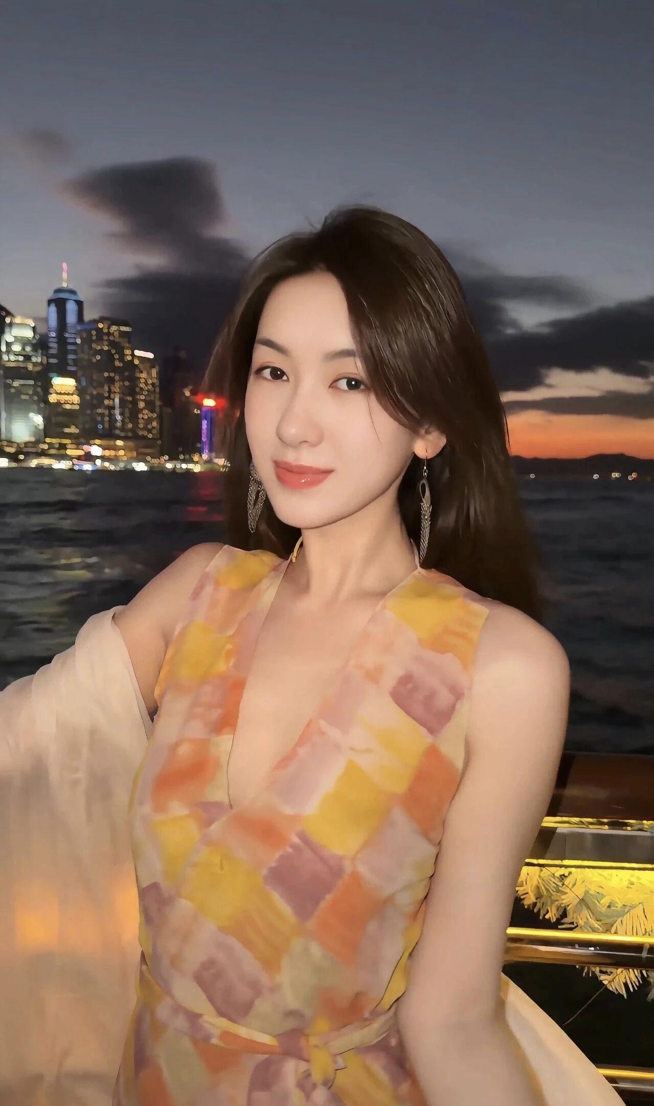 黄昏下的都市夜景,与她优雅的背影相映成趣。