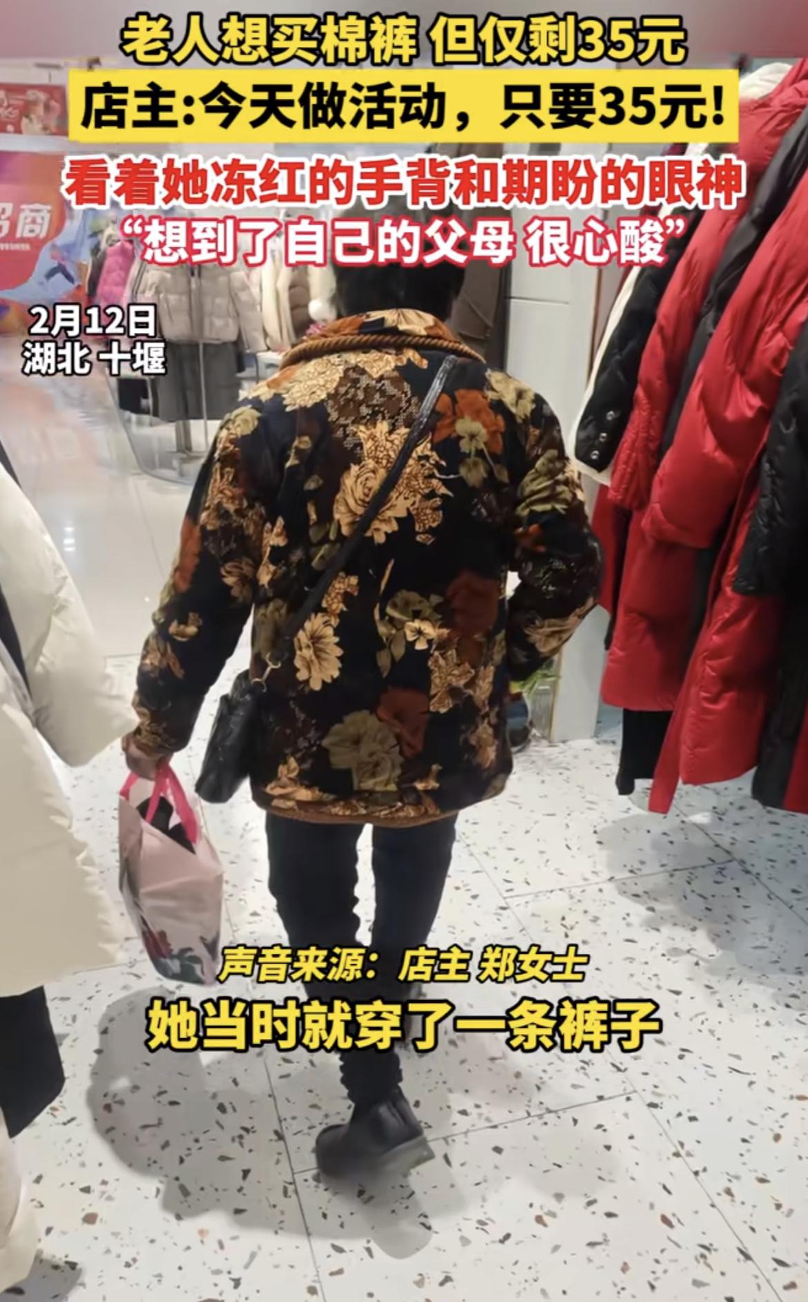 泪目!七旬老人捏着35元想买棉裤,女店主一句话,暖透整个冬天​‎͏  湖北十堰一家女装店里,一位七旬老人盯着一条加绒棉裤看了很久, 她反复摩挲舍不得放手,后来鼓足勇气小声问:我只有35元,够不够? 这条棉裤标价199元,成本都远不止35元。可店主郑女士看着老人单薄的裤子和局促的模样,心里一酸,立刻笑着说:今天做活动,正好35元。 老人是独居低保户,生活费仅100元,连过冬的厚裤子都舍不得买。 店主说,自己也有老人,看不得老人家受冷,生意再难,也想让她暖一点、体面一点。 真正的善良从不大张旗鼓,而是悄悄护住别人的尊严,不声不响送出温暖。不施舍、不张扬,用一句“做活动”,给了老人最踏实的过冬安心。 这世间最动人的,从来不是惊天壮举,而是普通人心里藏着的那一份心软与善意。 愿每一个在寒冬里艰难前行的人,都能被这样温柔以待。你身边有没有这样默默暖心的人? 人间温暖