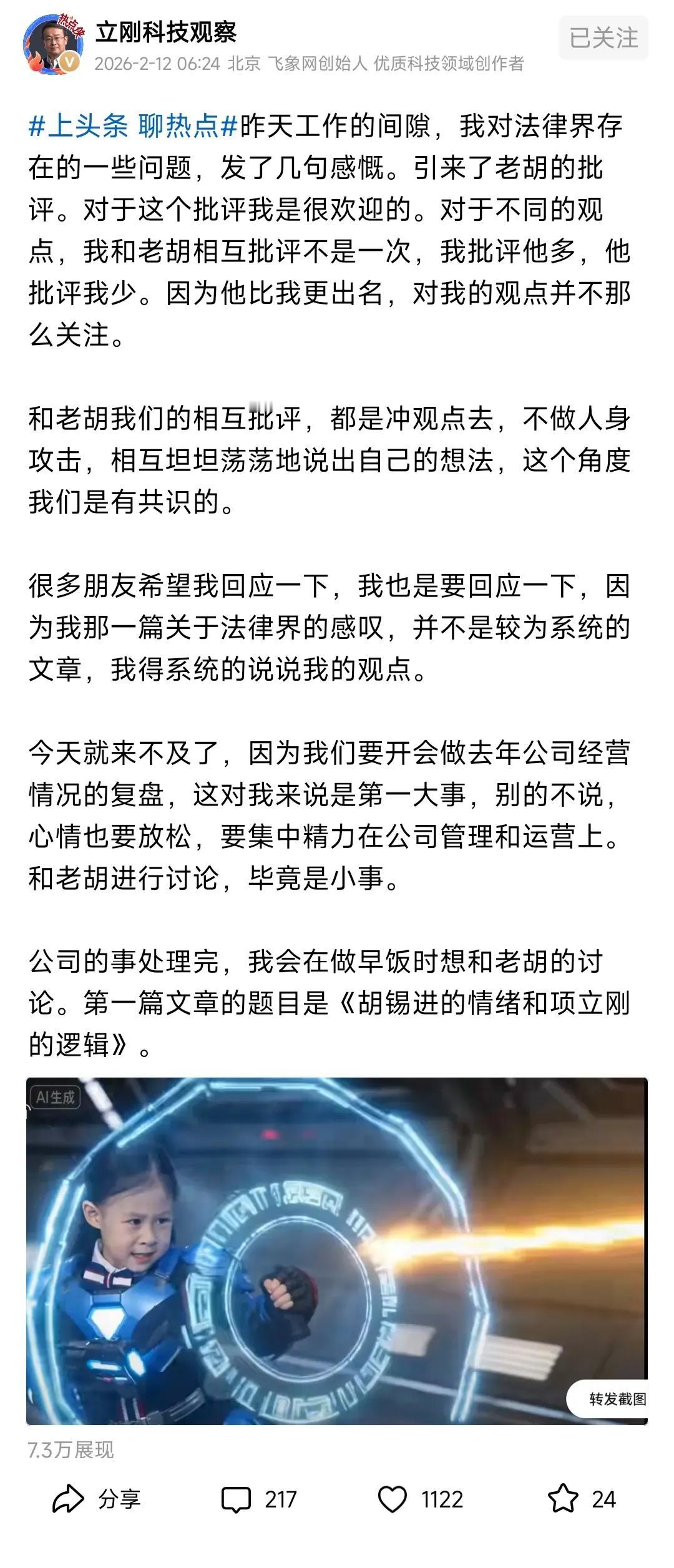 过年期间有好戏看了!项立刚和胡锡进准备开整! 起因嘛,我想大家都是知道的,只要关注了他们二位。就算没有关注他们,因这两人都是平台上的大V,而且胡锡进曾经也是头条的大∨,只不过现在转战微博,所以他们二人之间发生的事情第一时间都会传遍整个网络。 项立刚发文称中国法律界急需整顿。胡锡进对此不以为然,首先站出来反驳项立刚,认为他的观点非常偏激,显示出项立刚在法律方面知识的欠缺! 项立刚今天也说了,对胡锡进的批评,他是非常欢迎的,大家就事论事,不做人身攻击没有问题。这两天他很忙,等他忙完手上的事情,他就会与胡锡进就这个问题深入探讨一下,而且第一篇文章的标题他都已经想好了,估计接下来项立功又会像前一段时间炮轰罗永浩那样叫板胡锡进,所以各位吃瓜群众,大家就准备好瓜子花生矿泉水,坐等好戏开锣!