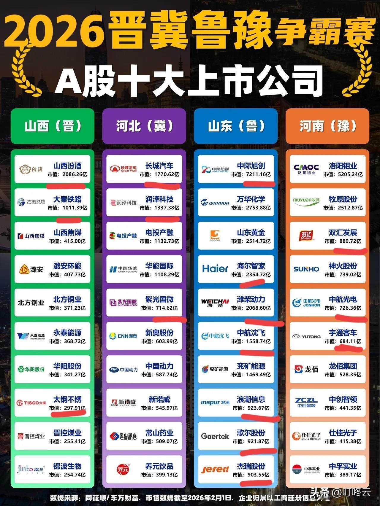 2026王者争霸赛,正式开打!晋冀鲁豫四省A股市值排行榜前十名揭秘!市值反映投资价值、市场竞争力!山西的汾酒家喻户晓!河北的长城汽车也是知名企业!山东的中际旭创遥遥领先!河南的洛阳钼业家里有矿!@叮咚云 解读分析:标红色的代表各省的科技创新实力,未来更有发展前景!你觉得各省都有哪些硬核实力?哪些企业更有发展前景?欢迎评论区补充和留言 交流讨论相关话题![强][强][招财进宝][招财进宝] 欢迎关注@叮咚云 将优先为粉丝职业规划指导,为你定制最适合的就业择业方案!欢迎留言交流讨论。[来看我][来看我] 免责声明:图片来自网络,仅供参考!