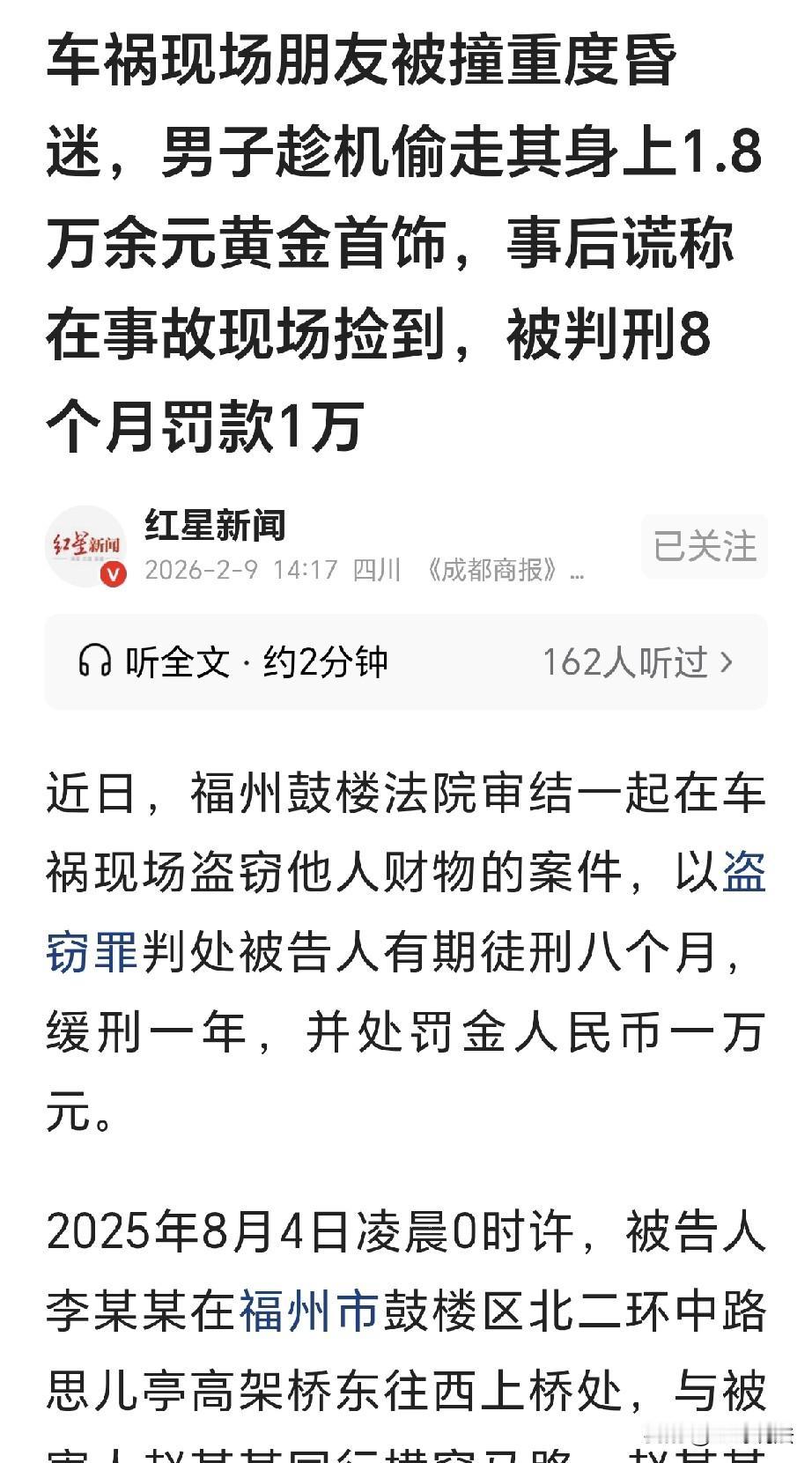 “还是人吗?”福建福州,一男子和朋友横穿马路,一辆轿车将朋友撞飞出去,朋友重伤昏迷,司机赶忙报警求助,报完警后司机又忙着放三角警示牌,只有男子守在朋友身旁,谁知他不怀好意,见朋友昏迷,立刻摘下朋友的金项链金手链藏进他自己包里,事后,家属发现金首饰丢了,扬言要是找不到就报警,男子害怕了,结果令人意想不到, 李某和赵某是好朋友,俩人经常在一起吃饭喝酒,2025年8月4日凌晨,俩人外出后结伴而行,走到一个路口,俩人想要横穿满路。 谁知路上车多,天也已经黑透了,路上灯光昏暗,周围变得视线模糊。 俩人并肩共行,慢慢往马路对面走去,谁知突然之间,一辆小轿车飞驰而过。 轿车因为速度太过,瞬间就到了俩人跟前,赵某来不及躲避,一下就被撞的飞了出去,只听见砰的一声,赵某跌到了地面。 赵某瞬间就血流如注,他重伤昏迷,车主谢某被吓坏了,他没有料到,半夜三更还会有人横穿马路。 可事故已经发生,他立刻踩刹车停下,当他看到地上的赵某重度昏迷,谢某立刻就吓得发抖。 他手续无措,哆哆嗦嗦拿出手机报警,他不敢看赵某的伤情,不由得往外走了几步。 他打完电话,又踉踉跄跄去车后摆放三角牌警示,而此时此刻,只有李某蹲在昏迷的赵某身旁。 然而他没有丝毫悲痛,反而在心里打起坏主意。 他目光冷漠,落在赵某脖颈间的金项链上,那黄金项链闪着幽光,昏暗中依然发着光亮。 他顿时起了歹心,他扭头一看,司机正忙着放警示三角牌子,根本顾不上看他。 他迅速摘下赵某项链,又扯下赵某左手腕上12克重的黄金手链,他将两件首饰塞进包里,然后面带悲伤,假装心里十分的难过。 不大一会,急救车警车呼啸而至,立刻将重伤的赵某送进医院救治。 家属得到了消息,急匆匆就赶到了医院,医生赶忙进行了施救,赵某依旧昏迷不醒。 经过一番手术,赵某被送进了病房,这时家属才发现,他常年带着得金项链不见了。 那条项链重10.195g,黄金手链重12.616g,这两项加起来20多客,不但价值昂贵,还是赵某最心爱之物。 家属就奇怪了,即便是撞伤,也不至于把项链撞开,何况脖子上没有划伤的痕迹,难道是被人摘走了不成? 至于这个人是谁,那就说不清了。 因为中间有很多人都在场,到了医院,更是人多手杂。 可家属一想,他们都不可能,因为众目睽睽之下,伤者就是焦点,谁会这个时候动手偷盗财物? 家属有了怀疑,他们表示,如果找不到就会报警调查。 李某一听心里就慌了,他回到家里,越想越怕。 他拿出那条金项链交给家属,说这是他在车祸现场找到了项链。 李某的表情十分别扭,家属越想越觉得怀疑,要是在车祸现场丢失,这么久的时间了早就被人拾走了。 可是这时,家属发现赵某手腕处的金手链也不见了,这一下家属就更加怀疑是被人做了手脚。 家属再次追问李某,李某更加慌了,他当时没说什么,第二天一早,他就把金手链交还给了家属。 他说金手链是在自己清理麻将桌时发现的,但是这样的说法,怎么就感觉不太对头。 之后家属报警,非要查出来是怎么回事,金项链金首饰到底是如何丢失,怎么好巧不巧,两样首饰都在李某手中? 经过调查,发现事故发生后只有李某在赵某身边旁停留过。 面对警方的询问,李某终于崩溃,交代了全部犯罪的事实。 经过鉴定,被盗的22.811克黄金首饰按当日金价计算,总价值18363元。 李某痛哭流涕,后悔自己一时的贪念,他把金首饰已经还给了赵某家属,他希望家属能够网开一面。 家属经过考虑,既然金首饰已经失而复得,他们也不想过多的追究,家属选择了原谅,给他出具了谅解书。 《刑法》第264条规定,盗窃罪要求行为人以非法占有为目的,秘密窃取公私财物,数额较大或多次盗窃。 李某趁好友赵某重伤昏迷,司机报警无暇顾及之际,秘密摘取赵某价值18,363元的黄金首饰,符合“秘密窃取”的构成要件。 尽管李某与赵某是朋友关系,但财物所有权属于赵某所有,李某的行为未获允许,主观上具有非法占有金首饰的目的。 因此法院认为,李某的行为已经构成了盗窃罪。 但是鉴于李某已经将项链退还给了赵某家属,并如实供述了犯罪事实,愿意认罪认罚,并取得了赵某家属谅解。 因此法院进行了综合评估,最终判处李某有期徒刑8个月,缓刑一年,并处罚金人民币10000元。 莫伸手,伸手必被抓,李某因为一时的贪念,造成大祸,偷鸡不成蚀把米,全是贪心惹得祸! 对此,你怎么看?