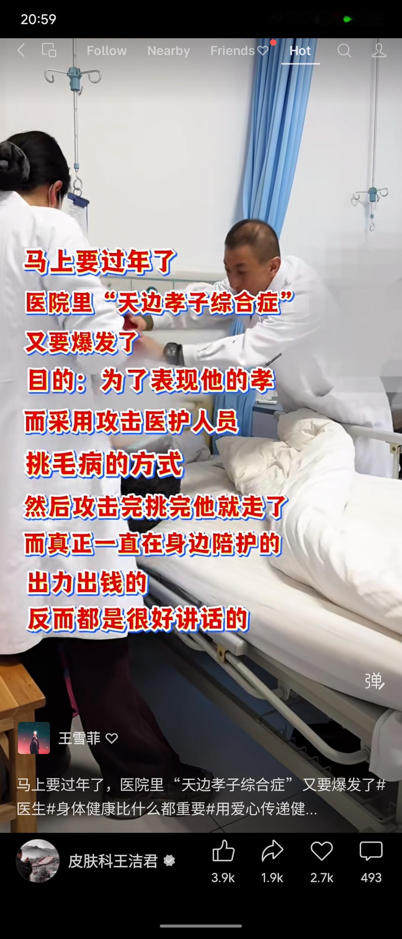 “天边孝子”过年涌向医院,通过挑剔医护来表现自己孝顺,闹完就走。真正长期陪护、出钱出力的家属,反而都很低调好说话。