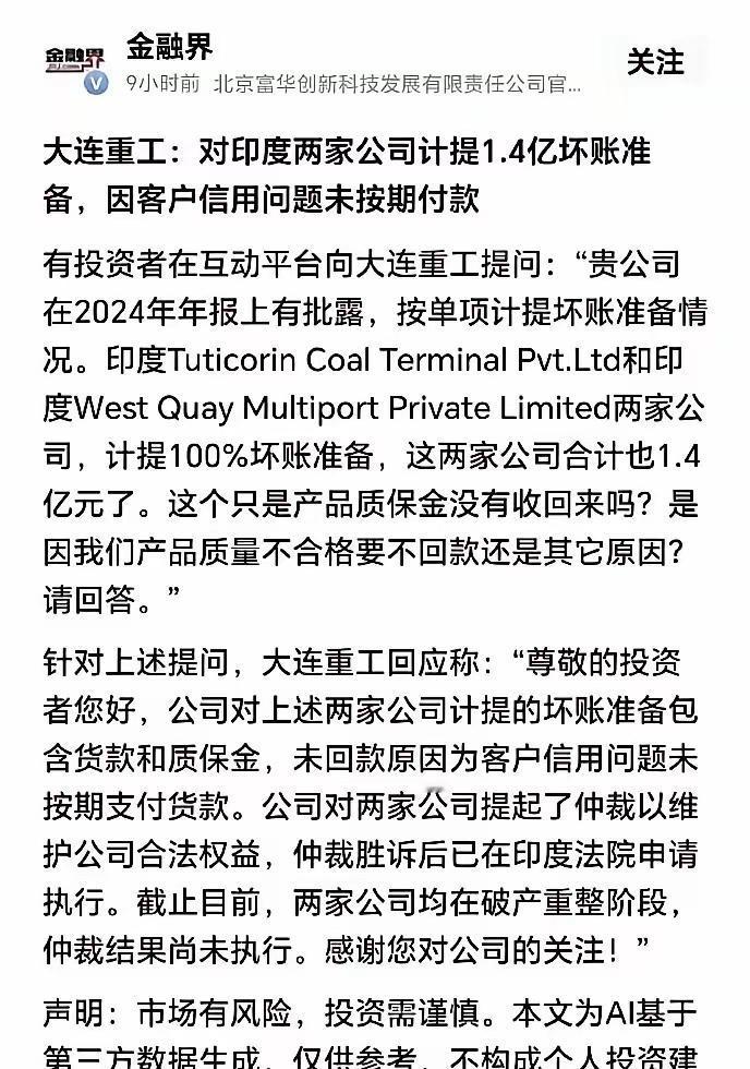真的气到无语!大连重工1.4亿在印度直接打水漂,赢了官司也拿不回一分钱,这亏吃得太憋屈! 多少企业在印度栽过跟头,套路早就人尽皆知,偏偏还有人不当回事。 大连重工把设备完好交付、正常运行,没任何质量问题。 货款加质保金一共1.4亿,对方拖着不付,直接申请破产玩金蝉脱壳。 咱们这边仲裁胜诉、法律程序走得明明白白。 可在印度,赢了文书不等于拿到钱,破产重组一搞,债权直接被架空。 外贸圈早就有铁律:和印度做生意,不见信用证、不见全款,绝对不能发货。 这不是谨慎,是保命的常识。 国企的每一分钱,都是国家和人民的资产。 明知市场风险极高,还不做足风控,出了事绝不能一句“市场风险”就翻篇。 这不是个案,是长期不警醒、不吸取教训的结果。 多少中企在印度被拖欠、被罚款、被收割,血的教训堆成山。 真正该反思的,不只是一单生意的得失。 而是海外风控必须硬起来,国有资产守护必须严起来。 不能再抱着侥幸心理,更不能把常识当耳旁风。 吃一堑必须长一智,否则下次还会踩同样的坑。 出海求发展没错,但底线是守住钱袋子。 对高风险市场,宁可少接单,也不能拿巨资去赌。 大家觉得,和印度做生意,最该守住的底线是什么? 评论区聊聊你的看法,给更多出海企业提个醒!