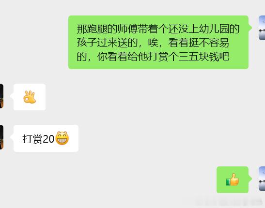 晚上小舅子的丈母娘做了葱花肉,小舅子叫跑腿给我家送过来,那跑腿的师傅带着个还没上幼儿园的孩子过来送的,唉,看着心酸,我又不是个特别擅长面对面交际的人,一时不知道说什么合适、怕伤着人家的心。刚微信上让小舅子给他额外打赏点,我小舅子也挺大气的。世道艰辛,每一个努力活着的人都值得尊重。
