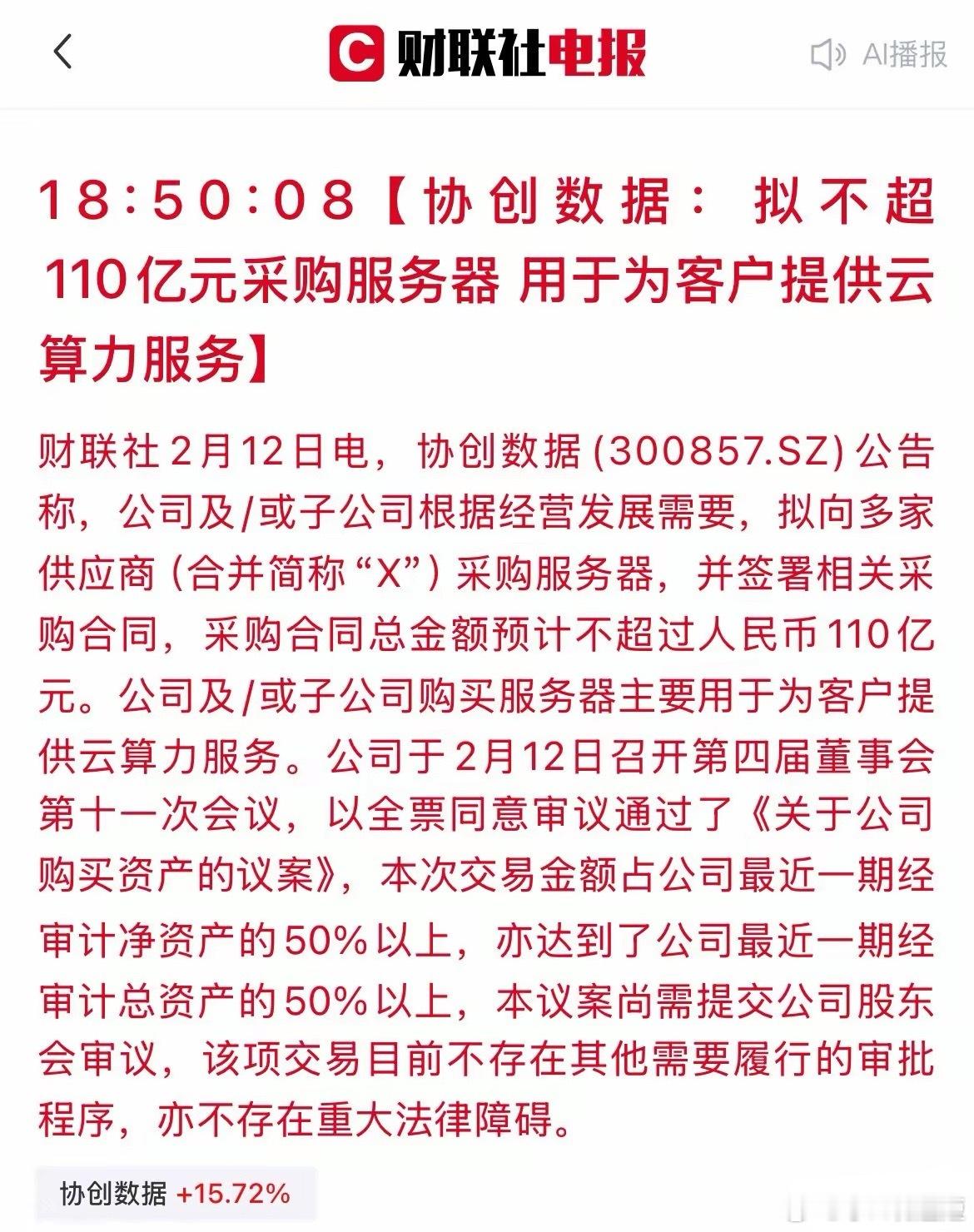 算力赛道再爆天量订单!协创数据110亿“扫购”服务器,谁将接下大单?刚刚,协创数据发布公告称:公司拟向多家供应商采购服务器,总金额不超过110亿元,全部用于云算力服务。这已是协创数据自2025年以来第6次披露大额服务器采购计划!·2025年3月:不超30亿·2025年5月:不超40亿·2025年8月:不超12亿·2025年10月:不超40亿·2025年12月:不超90亿·2026年2月:不超110亿(本次)截至目前,协创数据累计披露的服务器采购金额已超322亿元,持续加码云算力服务布局。本次110亿元采购将直接拉动服务器整机、光模块、液冷散热等全产业链需求。核心受益方向梳理:1. 服务器整机·相关个股:中科曙光、浪潮信息、紫光股份、拓维信息、神州数码、光华软件等。2. 液冷每台必备,刚性强。·相关个股:英维克、飞荣达、川润股份、麦格米特、高澜股份、申菱环境、同飞股份等。3. 光模块集群越大,内部互联需求越强。·相关个股:光迅科技、天孚通信、中际旭创、太辰光、新易盛等。4. 算力芯片AI服务器的性能核心在于GPU。·相关个股:海光信息、寒武纪、龙芯中科、景嘉微等。5. 连接器与PCB服务器内部密密麻麻的板卡,离不开高速连接器和高多层。连接器:立讯精密、电连技术、意华股份等。PCB:沪电股份、深南电路、生益电子等。A股市场股市第一线