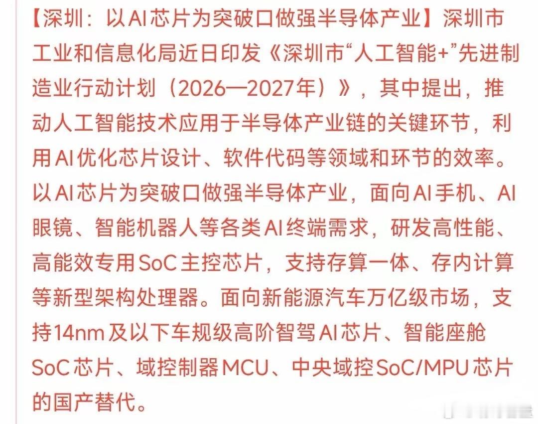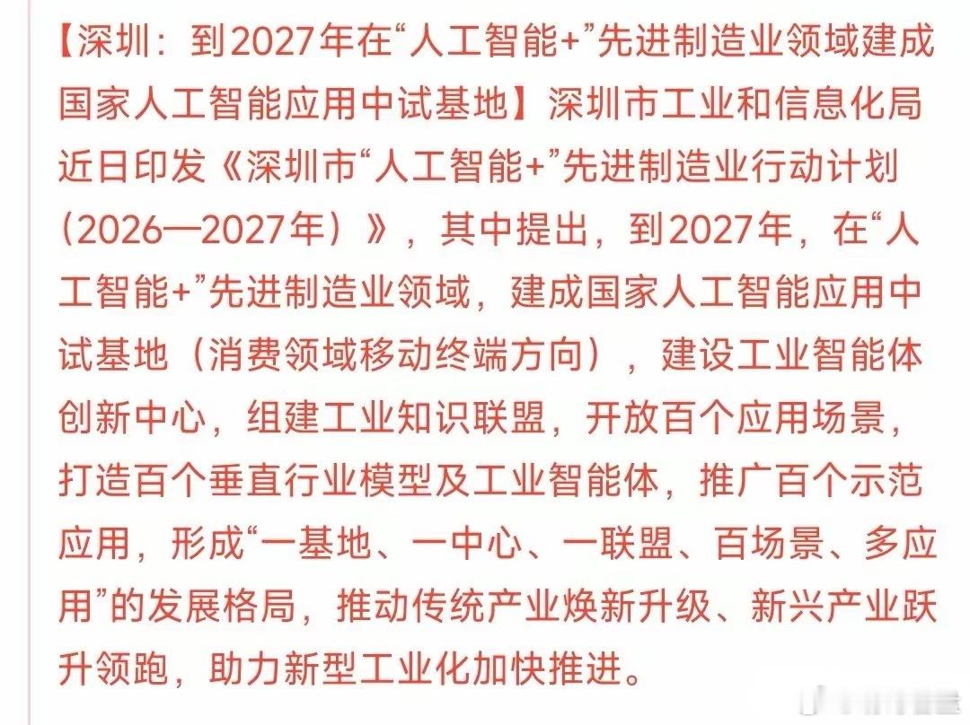 科技股大利好消息来了,明天科技股板块基本稳了深圳连发两条利好,涉及人工智能和半导体产业,就是给2026年定下了目标。人工智能:到2027年,建成人工智能中试基地。半导体:推动人工智能应用于半导体产业链的关键环节。这是整个2026年的目标,是必须要完成的,其中很多公司都会受益,这种建设需要很多人工智能的基建配套,譬如服务器,算力等等。科技股板块今年以来已经涨了13.11%,如果没有意外今年科技股的牛市将会继续,只不过会分化很严重,市场紧缺的继续往上走,市场饱和的就要调整了。