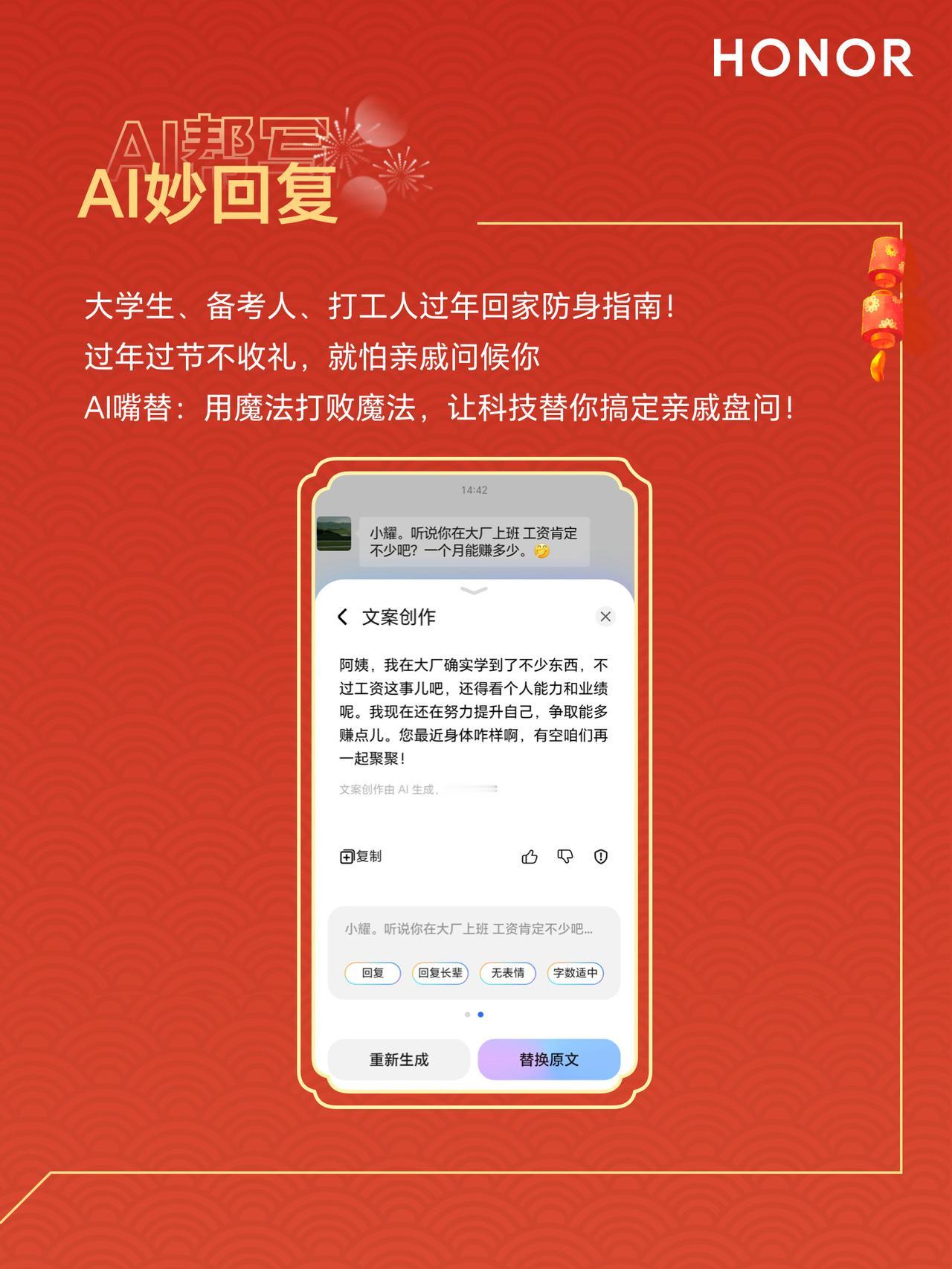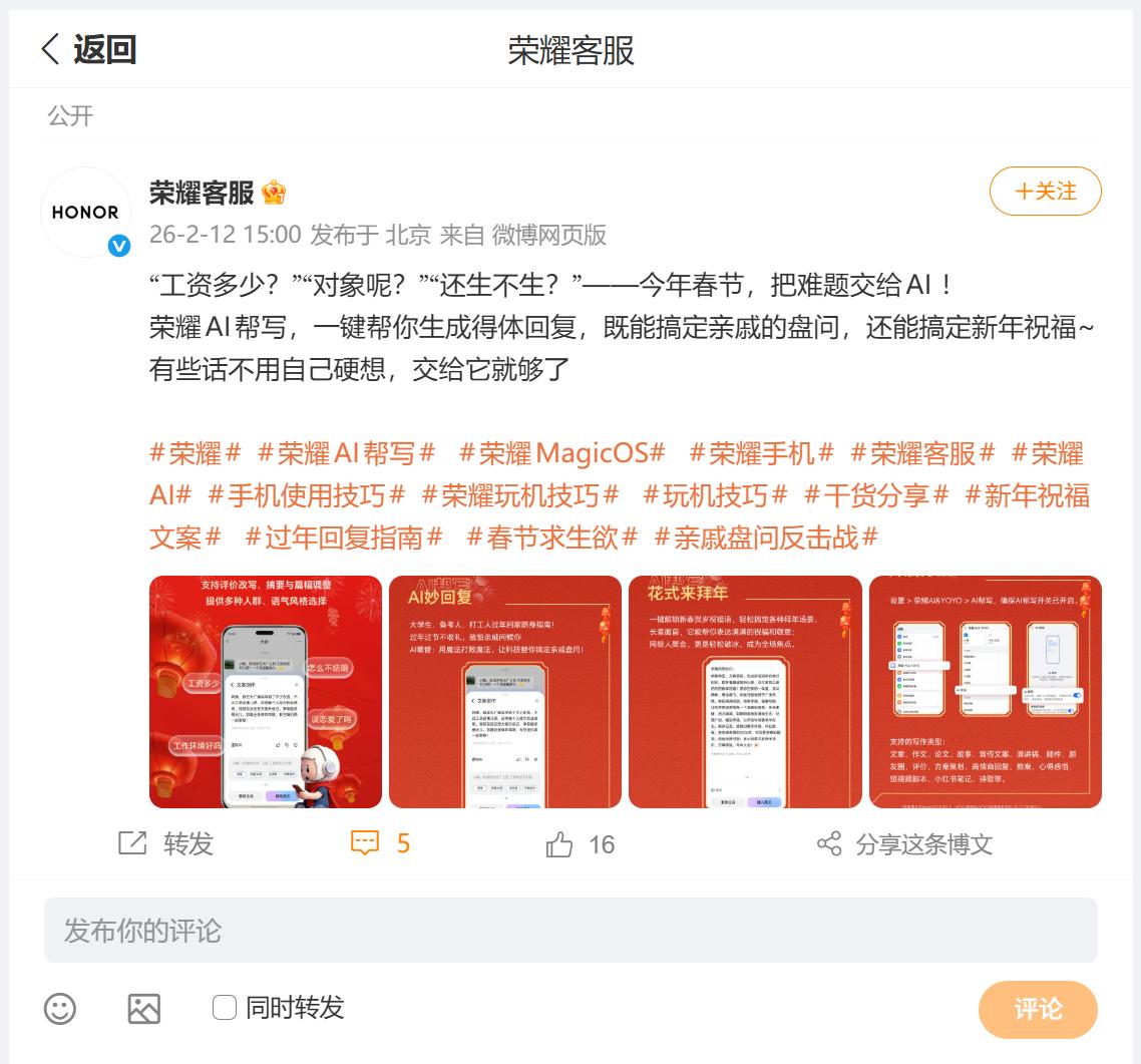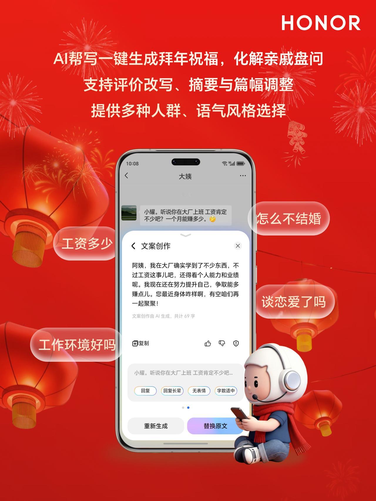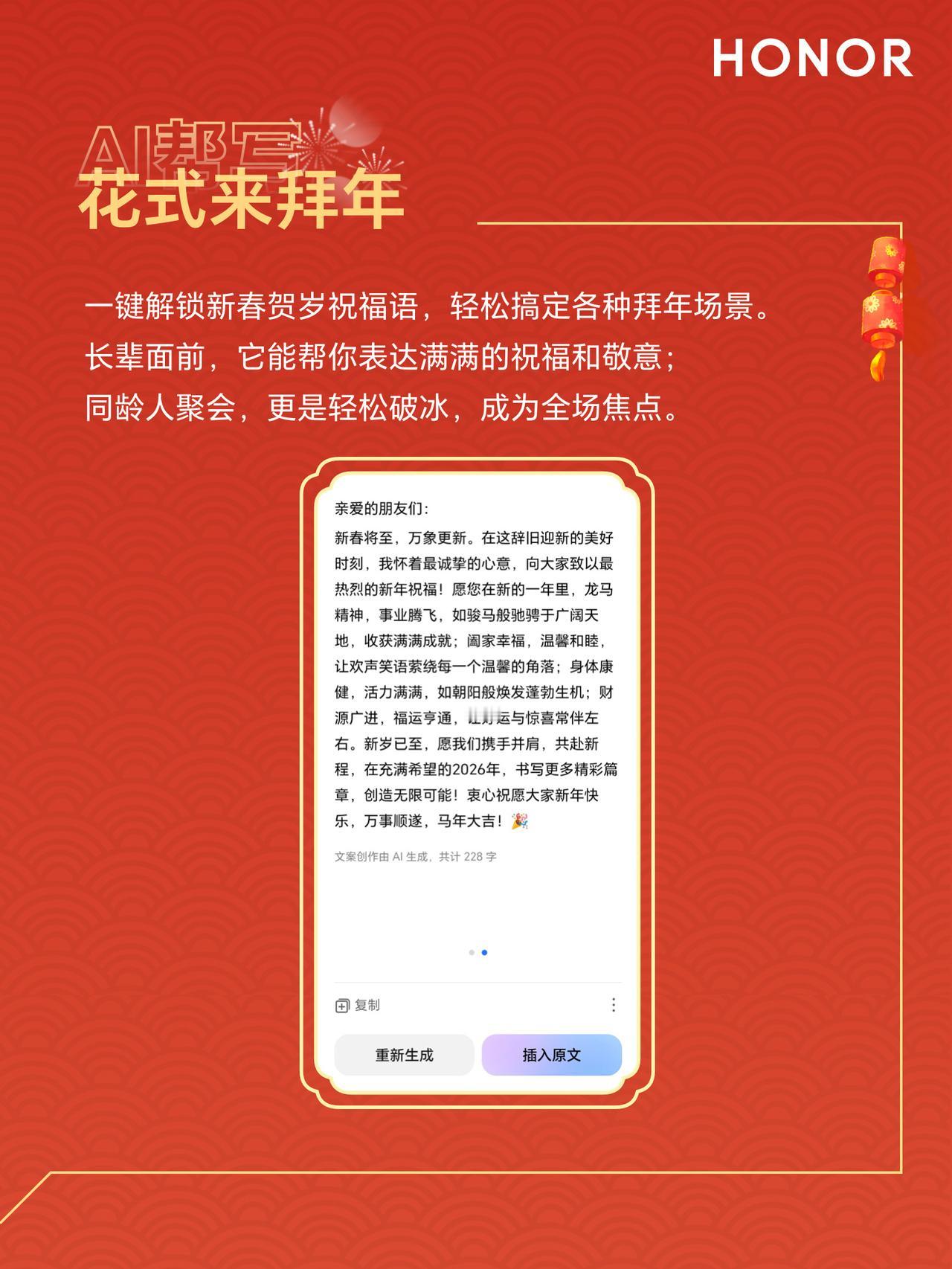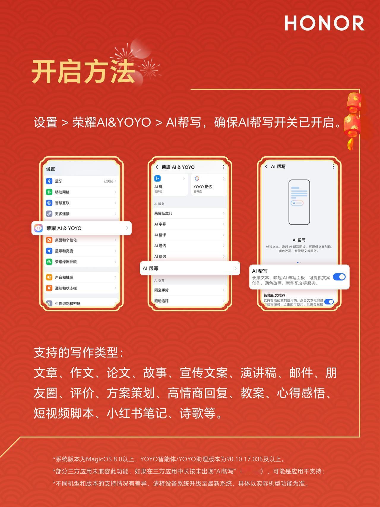 今年春节的时候,小伙伴在准备发送拜年短信、和亲戚聊天的时候,没有什么思路怎么办呢?其实还是可以通过荣耀MagicOS 10的AI去完成这些事情,荣耀客服通过一组图文,介绍了荣耀AI帮写的功能,而且一键生成出得体的内容,大家说方不方便? AI帮写的功能,开启还是蛮方便的,从设置>荣耀AI&YOYO>AI帮写,就能够确保AI帮写的功能已经启用。帮写的内容也是蛮多的例如文章、作文、论文、故事等等内容,当然对于拜年短信、高情商回复也是不在话下的,避免出现聊天尴尬的情况出现。 荣耀AI帮写支持评价改写、摘要与篇幅调整,我看了看,居然还支持语气和风格的选择。现在只需关注 @超逸谈科技 并转发此微头条,2026年02月14日,将由 选出1位粉丝包邮送出暖暖杯55度礼品装,说不定下一个中奖的就是你哟抽奖详情