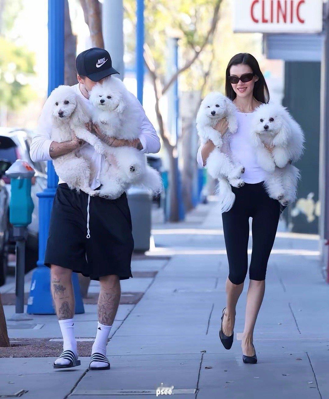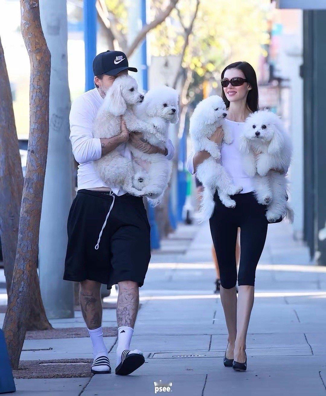 贝克汉姆大儿子布鲁克林与妻子妮可拉·佩尔茨新街拍,两人手上抱着的四只狗狗抢镜十足!!