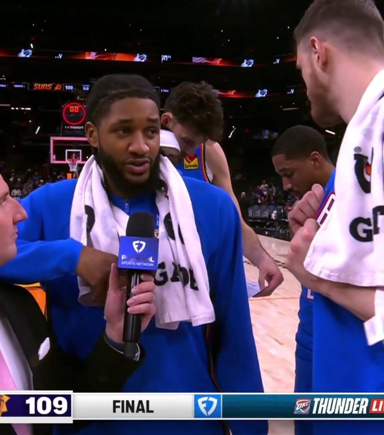 今天赛后太阳助教穆斯卡拉(和仔涛畅聊过版)与雷霆的老队友们打招呼,然后采访以赛亚乔的时候多尔特鬼鬼祟祟拿着应该是数据统计表走到后面,几个人就地聊起来