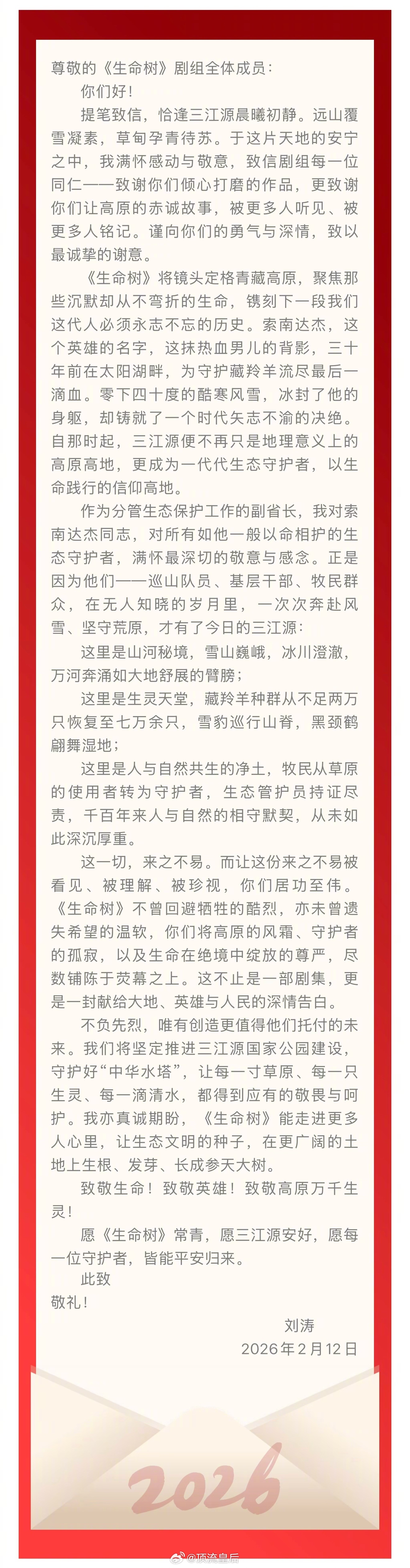 青海省政府副省长刘涛致生命树剧组这就是拍摄生命树的意义啊,让更多人看到了青海,致敬高原,敬畏生命,铭记英雄!杨紫以及生命树全体创作人员,你们都超棒的。你们呈现了了一个具有重大意义的优秀作品!
