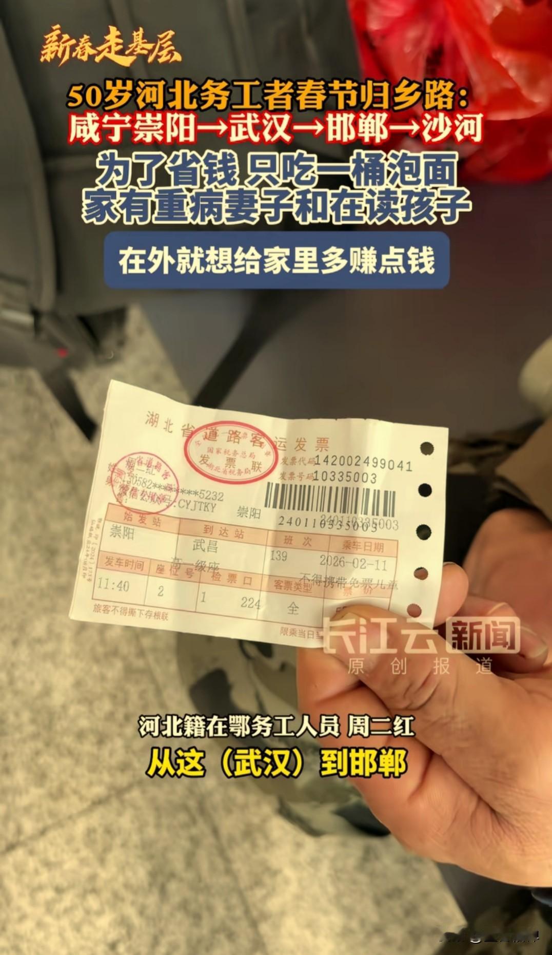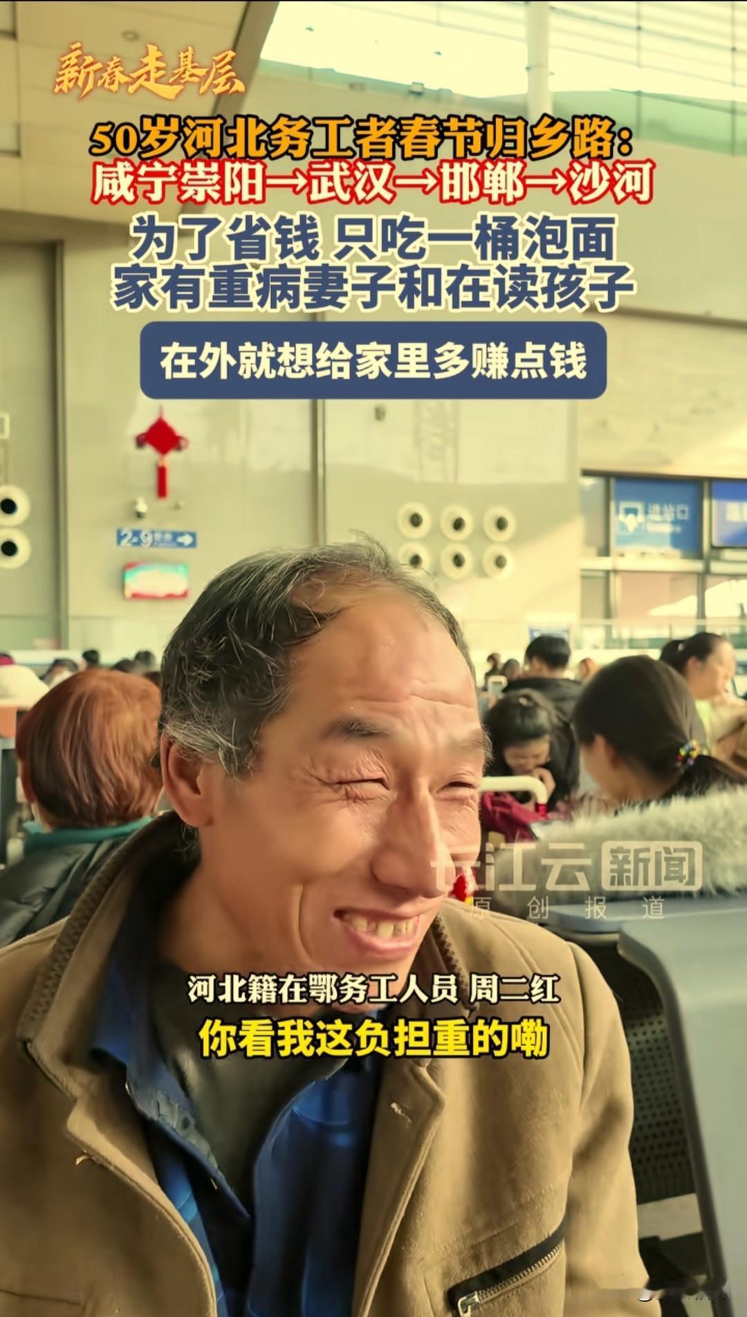 人生哪能多如意,谁不都是在努力奋斗呢!近日在湖北武汉武昌火车站,记者采访了一位50岁河北籍大哥,他一个人在咸宁务工,这次春节回家他要辗转三趟车(崇阳→武汉→邯郸→沙河)才能到家。 他叫周二红,河北沙河人,在咸宁安装太阳能板,负责把周围的草清理干净。他说今年刚出来干了半年多,由于手有毛病,干不了重活,这个工作他可以做,一天一百来块钱。 在车站他只吃了一桶泡面,说能省就省点,孩子还小在上学,老婆得了尿毒症,有时候还要透析,他的负担也很重,就想着出来赚点钱回家。 他说早点回家,沙哑的话语里,藏着一个普通男人的责任和艰辛,也藏着最朴素的回家期盼。他这一路辗转,是多少打工人的春节啊。一桶泡面,装的不是饭,是对家的念想。一张车票,载的不是人,是对团圆的盼头。 愿每一个在外打拼的人,都能平平安安到家,吃上一口热乎的年夜饭。 来源:长江云新闻