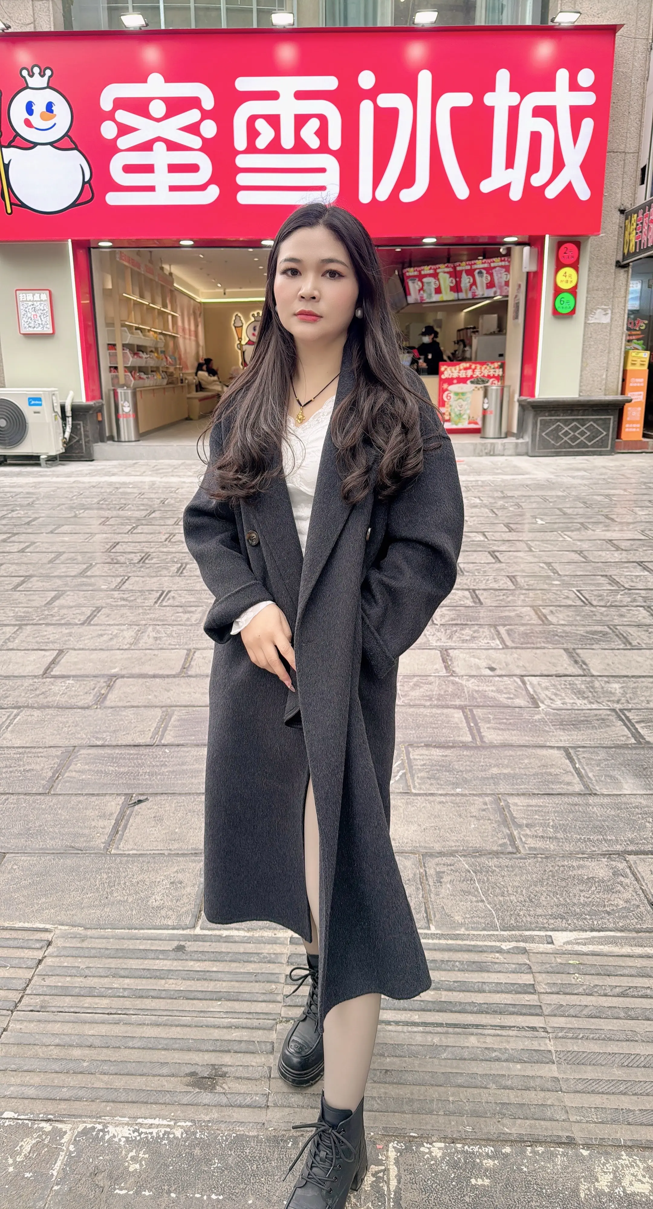 大衣穿搭奶茶店