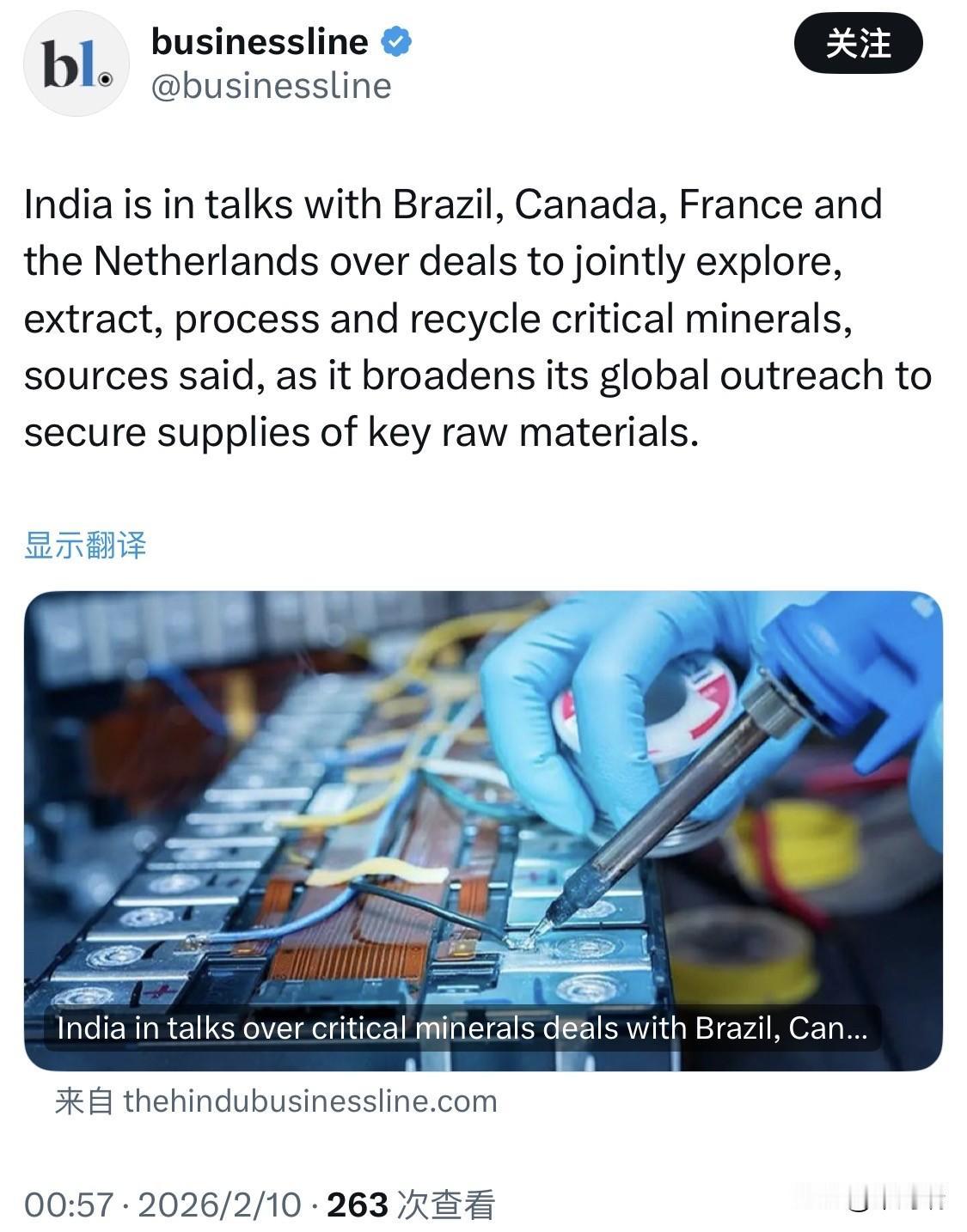 根据2026年2月的最新报道,印度矿业部正与巴西、加拿大、法国和荷兰进行深入谈判,旨在达成关键矿产(Critical Minerals)合作协议。这些谈判旨在效仿印度于2024年1月与德国签署的谅解备忘录(MoU)模式,涵盖联合勘探、开采、加工及回收等全产业链合作。 核心谈判进展 效仿德国模式:印度希望复制与德国协议中的核心内容,包括在两国及第三国共同收购、开发矿产资产,以及在循环经济和回收技术方面的合作。 针对性合作领域: 锂与稀土:谈判的战略重心在于确保锂和稀土元素的稳定供应,以支持印度的能源转型。 加拿大(铀与关键矿产):双方正在积极研拟协议。预计加拿大总理马克·卡尼(Mark Carney)将于2026年3月初访问印度,届时可能签署一项价值约28亿美元、为期10年的铀供应及关键矿产、人工智能等领域的合作协议。 法国(稀土与技术):重点在于获取先进的稀土加工和精炼技术。 荷兰(回收技术):侧重于关键原材料的循环利用和回收技术。 巴西(锂资源):旨在通过联合勘探和开采锁定巴西丰富的锂资源。 战略背景 去风险化:此举是印度减少对中国关键矿产及其加工技术依赖的全球战略的一部分。 能源转型:印度已确定20多种关键矿产,并计划通过建立“稀土走廊”和国际合作,实现其到2047年扩大核电和绿色能源规模的目标。 目前,这些谈判多处于机密或积极审议阶段。随着加拿大总理3月访印,预计会有更具体的官方声明发布。