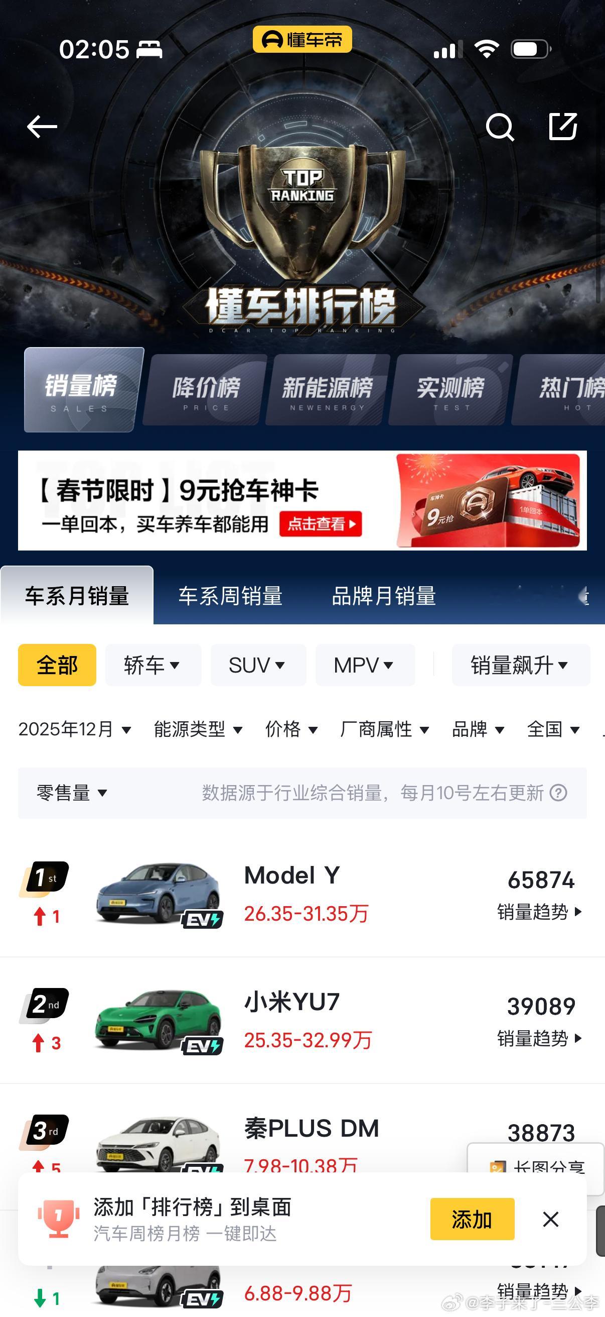 小米YU7一月销量37869台跻身榜首我想问问为什么model y12月份卖6万台1月份卖1万多台降这么多不科学呀