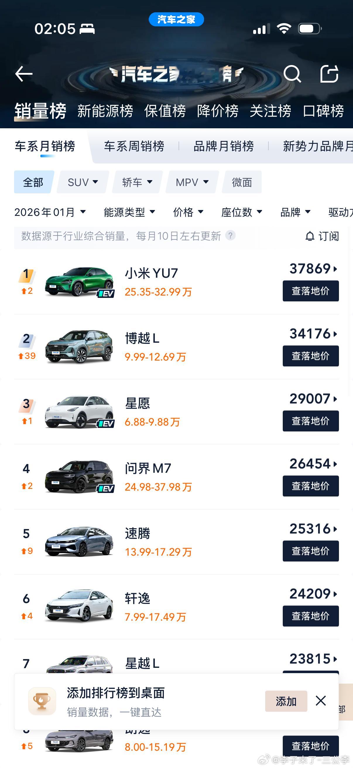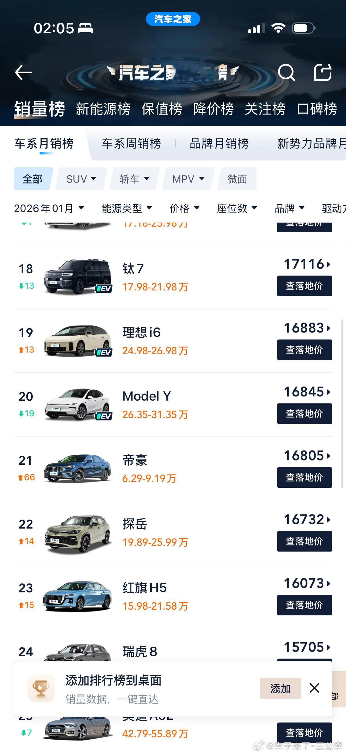 1月份汽车销量排行榜TOP20全品类,无定语前10名,有7台是纯燃油车前15名