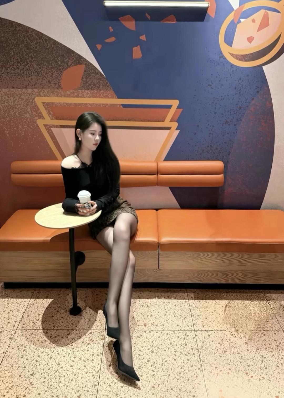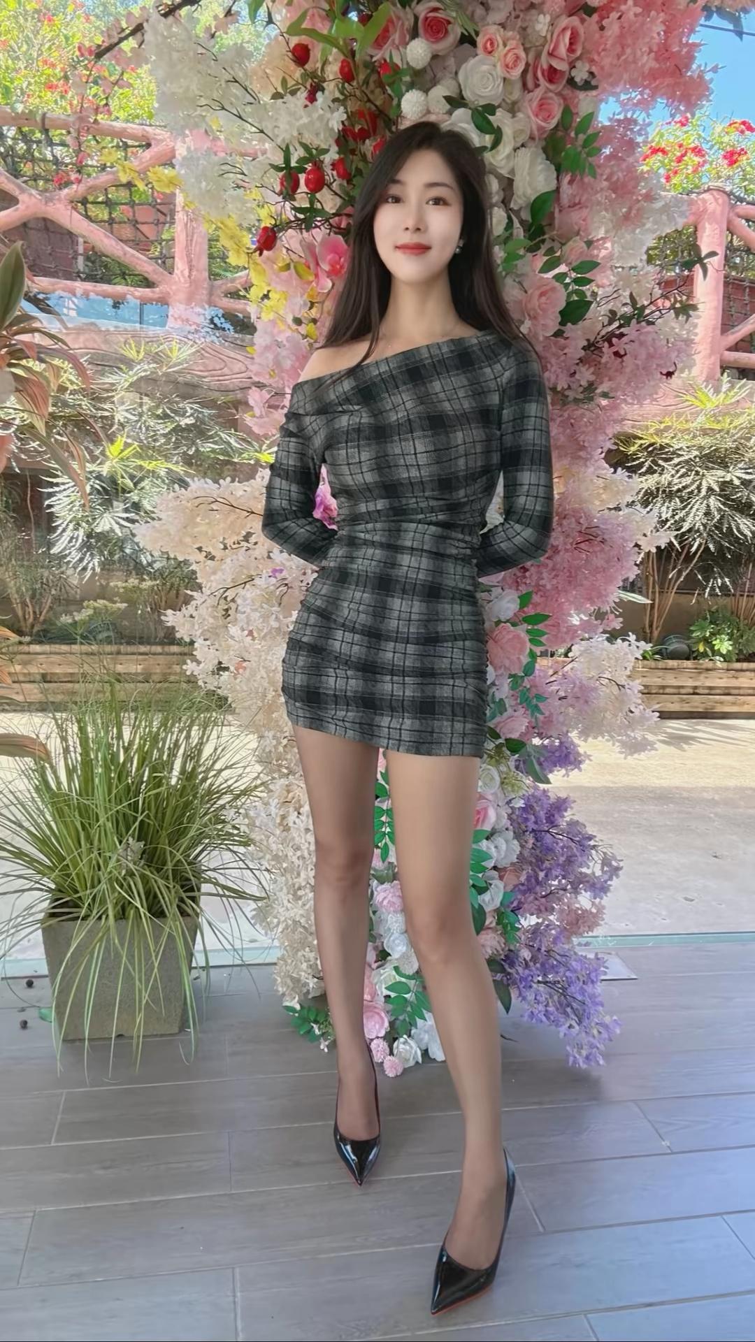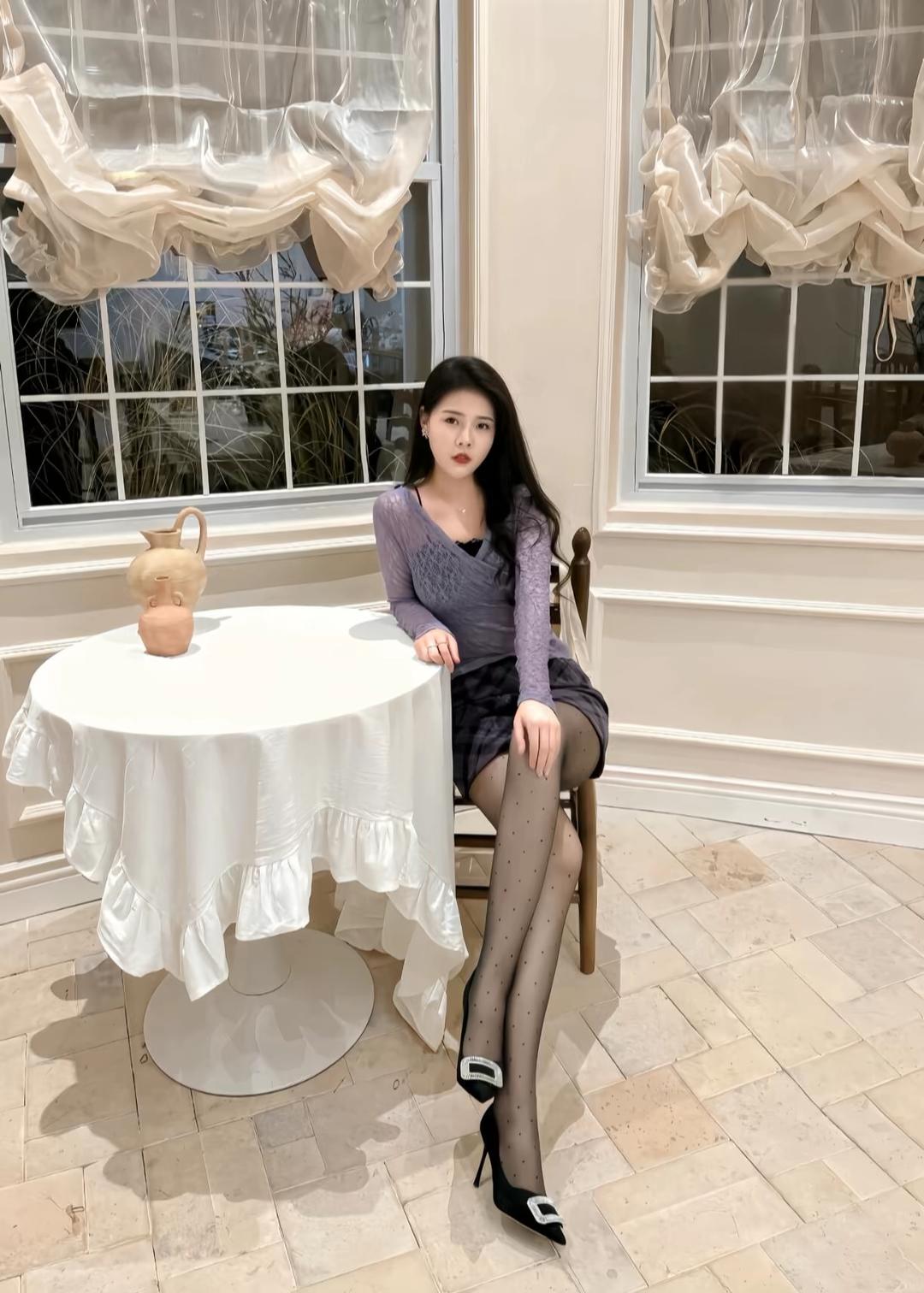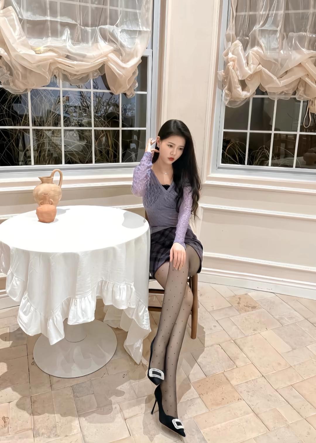 第一组(花墙背景):身着灰黑格纹露肩连衣裙,搭配黑色尖头高跟鞋,站在繁花簇拥的花墙前,姿态优雅自信。背景中粉色、白色与紫色花朵交织,营造出浪漫唯美的氛围,突显女性柔美与时尚感。 第二组(咖啡馆场景):换上黑色蕾丝上衣与豹纹短裙,搭配黑色丝袜与高跟鞋,坐在橙色沙发卡座上,手握咖啡杯,神情从容。背景墙面色彩丰富,充满艺术感,展现出都市女性在休闲时光中的精致与独立。 第三组(室内窗边):身穿淡紫色蕾丝长袖上衣与格纹短裙,搭配波点丝袜与饰有银扣的黑色高跟鞋,坐在白色圆桌旁,背景是柔和的纱帘与窗外绿植,整体氛围温柔雅致,凸显女性细腻与知性的一面。 三组造型风格各异,却统一传递出“时尚不设限,美由我定义”的态度。无论是浪漫花墙前的优雅,咖啡馆里的从容,还是窗边的静谧,都展现了女性在不同场合下自如切换、绽放独特魅力的生活哲学。