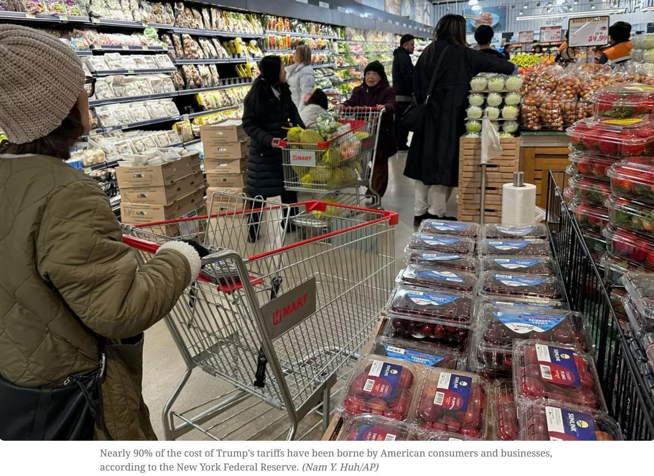 美国官方宣布:支付特朗普关税的是美国人自己 美国纽约联邦储备银行的一份新报告证实了经济学家长期以来的警告:关税的负担完全由实际征收关税的国家人民承担。 美联储部门发现,去年美国企业和消费者支付了2025年近90%的进口税,美国国家经济研究局和国会预算办公室表示也发现了大致相同的结论。 虽然纽约联储报告未详细分析企业与消费者之间的差距,但周三发布的CBO报告估计企业将继续略微缩减利润率以抵消额外成本,同时将大部分税费——70%——转嫁给消费者。而那些出口国,CBO估计他们大约只承担了5%。 根据非党派税务基金会的数据,2025年以实际美元计,特朗普关税使美国家庭平均每户税收增加了1000美元。