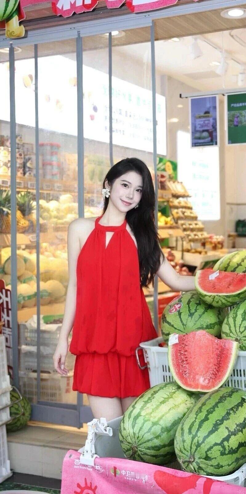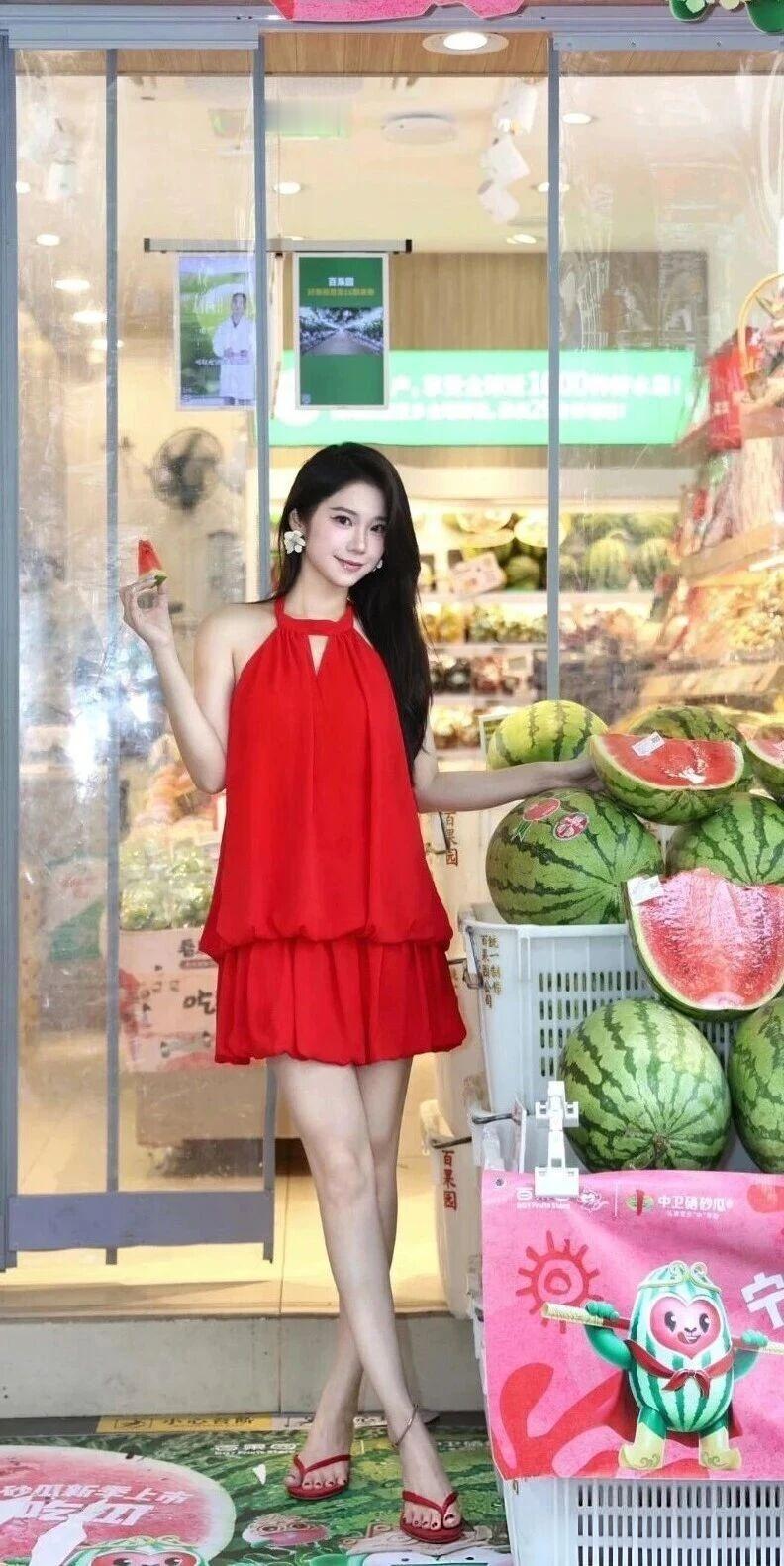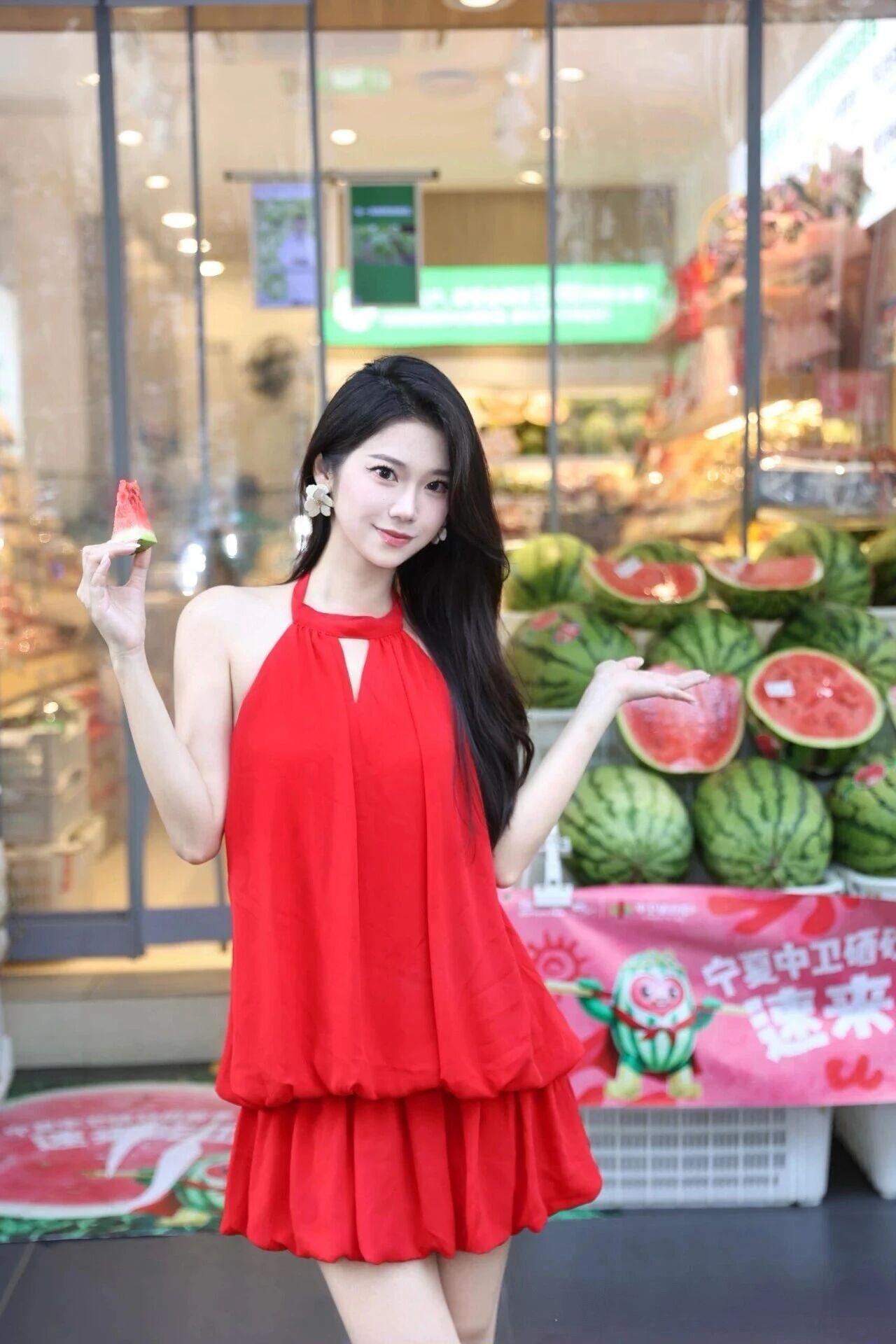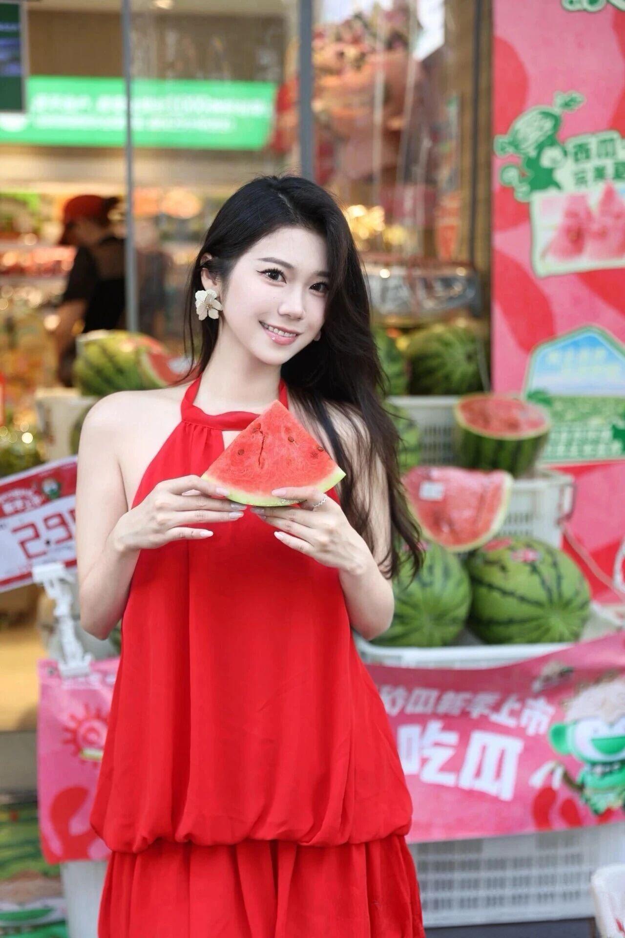 女孩子怎么穿搭既时尚又好看?红裙西瓜夏日清凉解暑