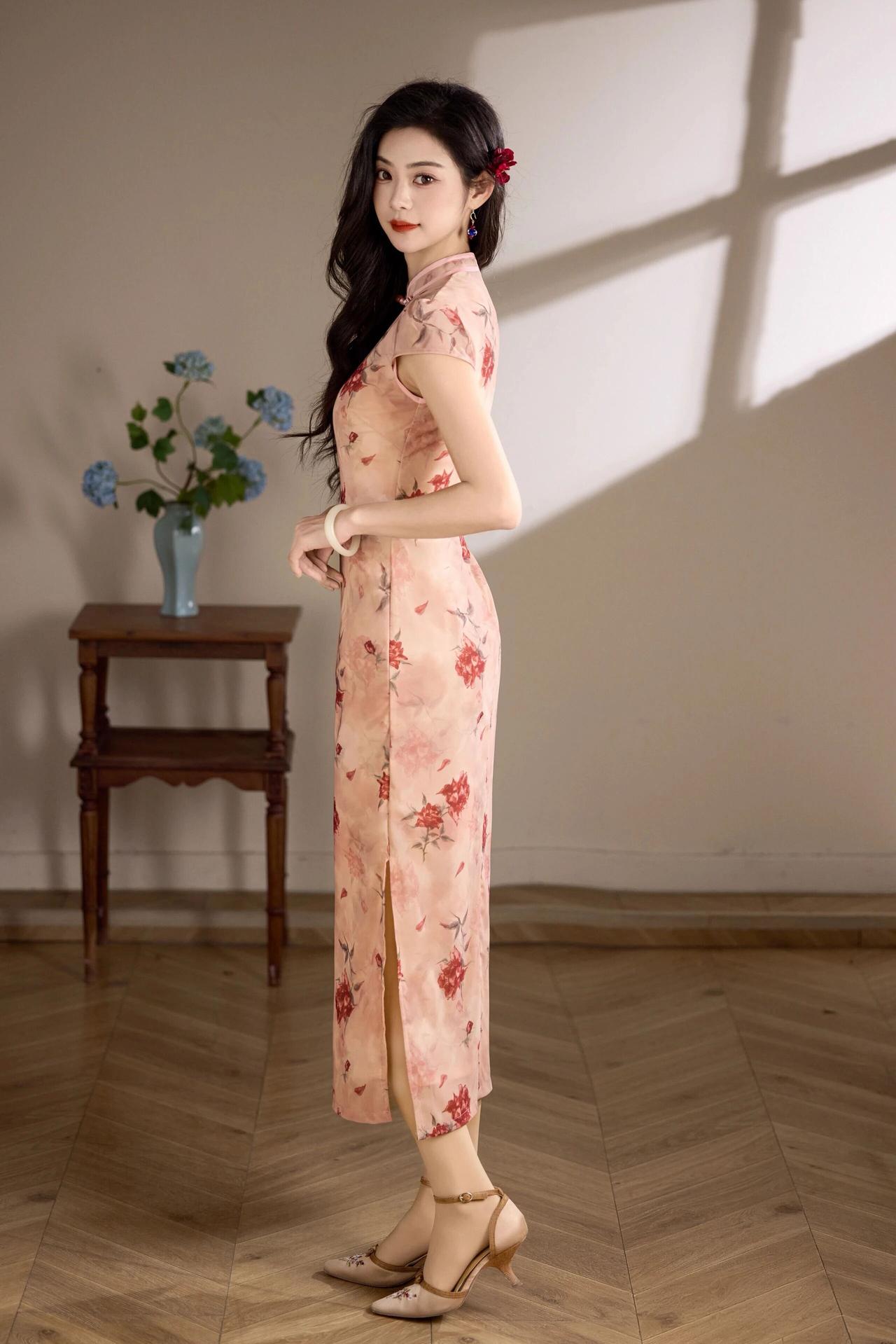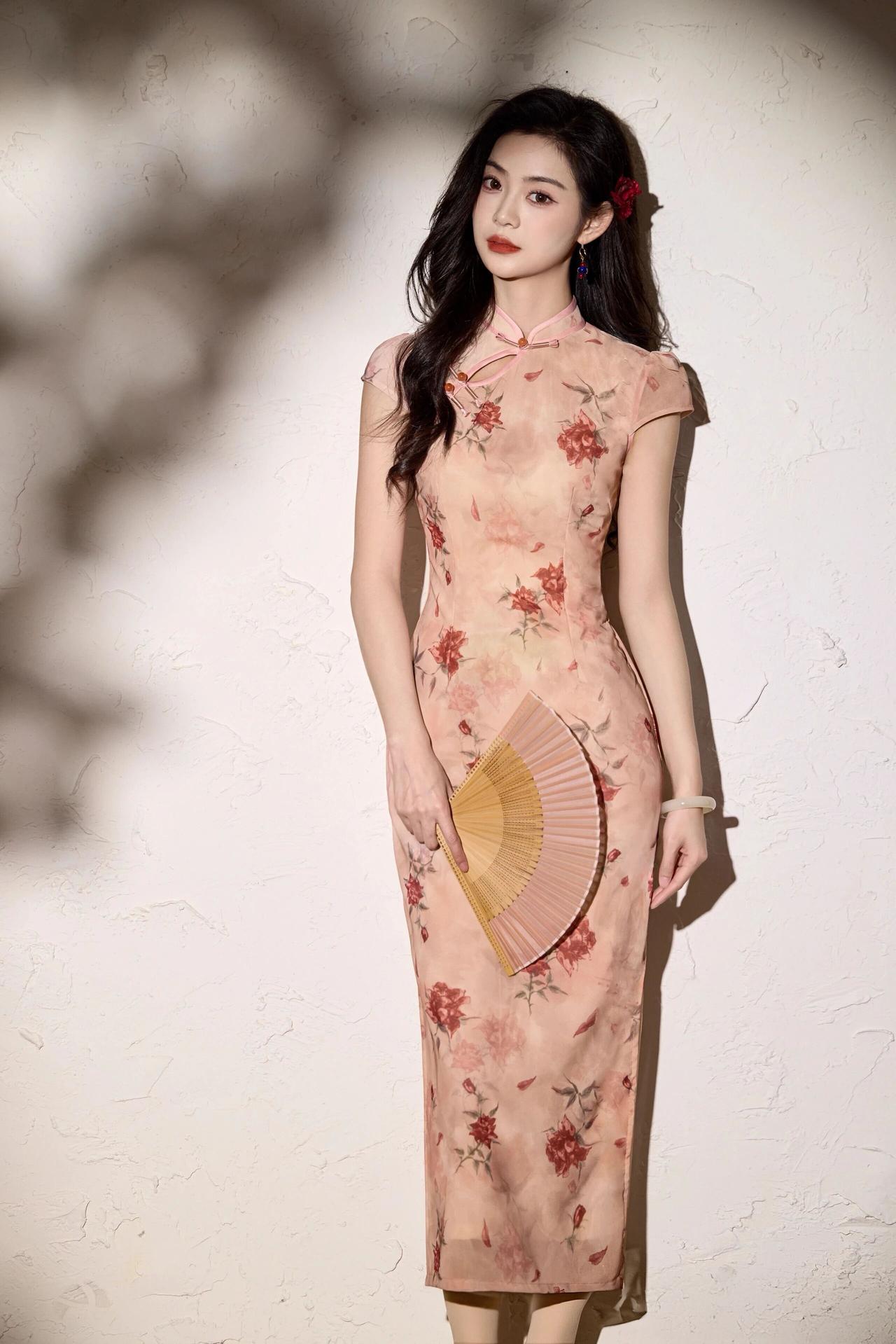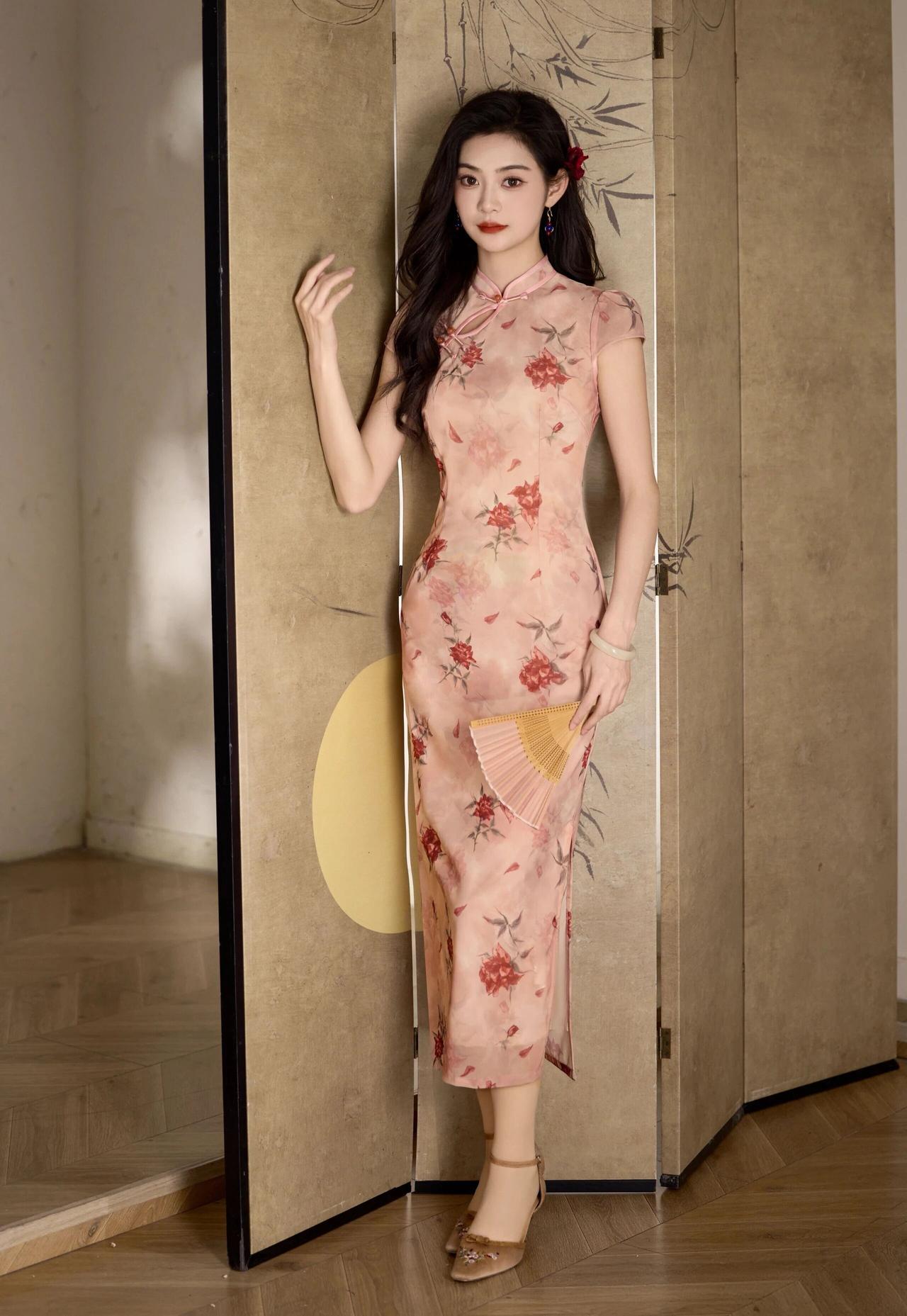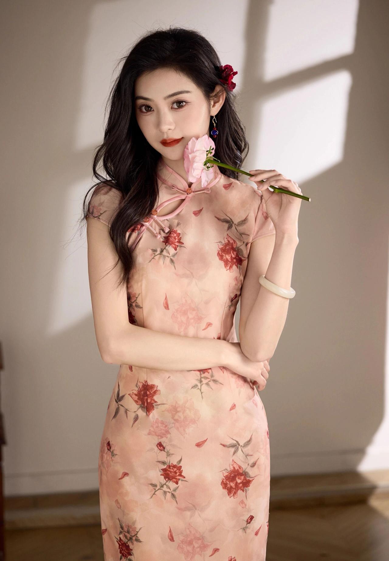 这组照片以“新中式旗袍写真”为主题,通过多场景与多姿态展现了东方女性的温婉与雅致。整体风格融合传统与现代,既有古典韵味,又不失时尚感,适合用于个人形象展示、文化宣传或时尚摄影。 旗袍造型与细节 - 旗袍款式:浅粉色底,饰以红色花卉图案,采用立领、盘扣设计,修身剪裁凸显女性曲线,下摆开叉增添灵动。 - 配饰搭配:发间点缀红色花朵,耳戴精致耳坠,腕戴玉镯,手持折扇或鲜花,细节处尽显东方美学。 - 妆容风格:红唇与自然眉形相得益彰,整体妆容清透温婉,突出女性柔美气质。 场景与氛围 - 背景设计:以素雅墙面、木质家具、古典屏风为背景,搭配柔和光线,营造出静谧而富有文化气息的氛围。 - 姿态表现:或倚墙而立,或持扇轻摇,或低头凝视,姿态优雅自然,展现出“静若处子,动若脱兔”的东方女性神韵。 风格定位与适用场景 这组照片适合用于: - 个人形象展示:展现个人气质与审美品味。 - 文化宣传:传递中国传统服饰之美。 - 时尚摄影:探索传统与现代融合的穿搭风格。 整体而言,这组照片通过细腻的造型与场景设计,成功诠释了“传统与现代共生”的美学理念,让观者感受到东方女性独有的温婉与力量。