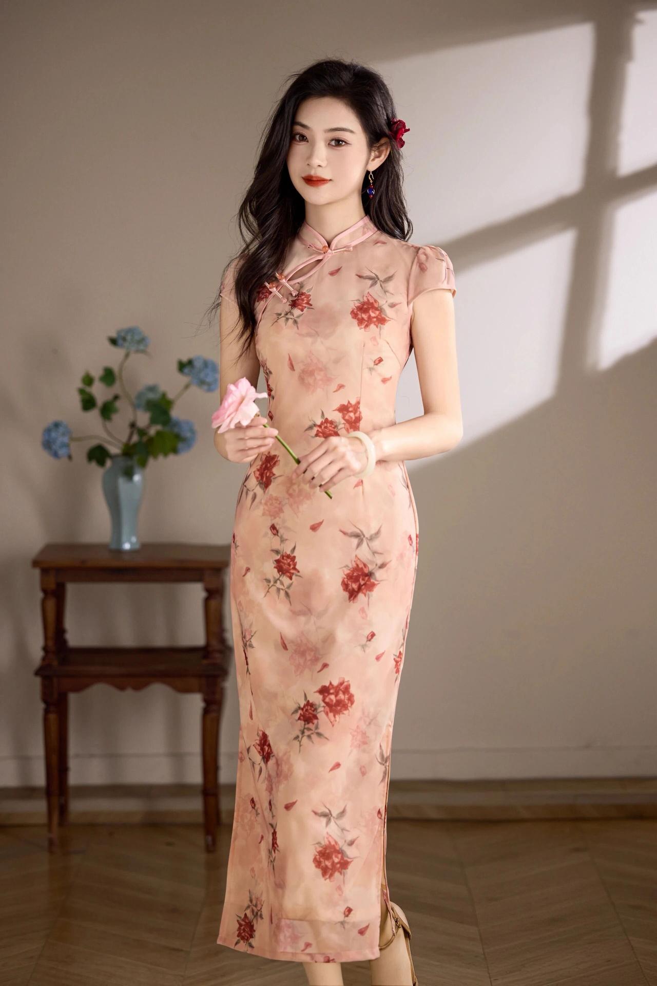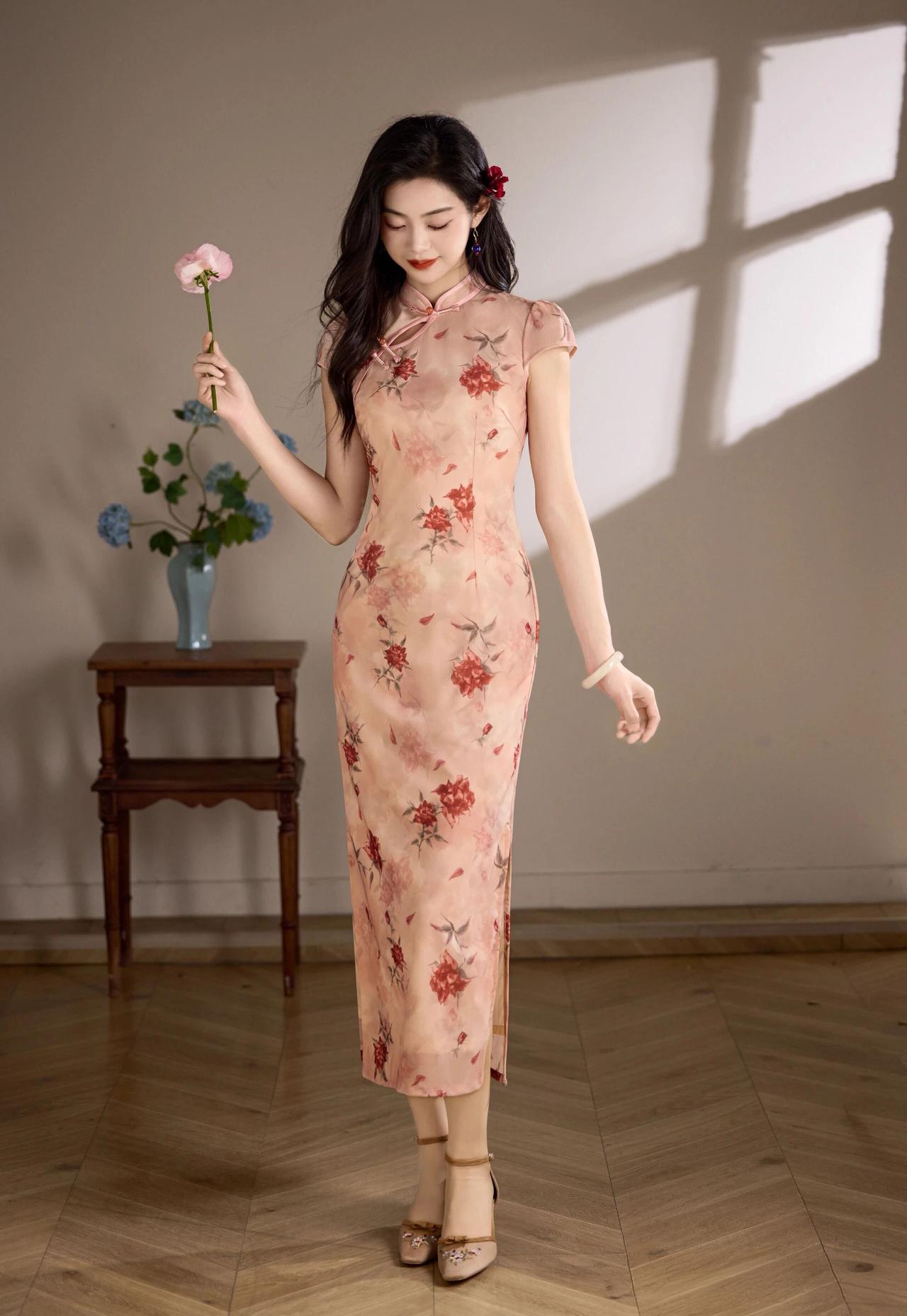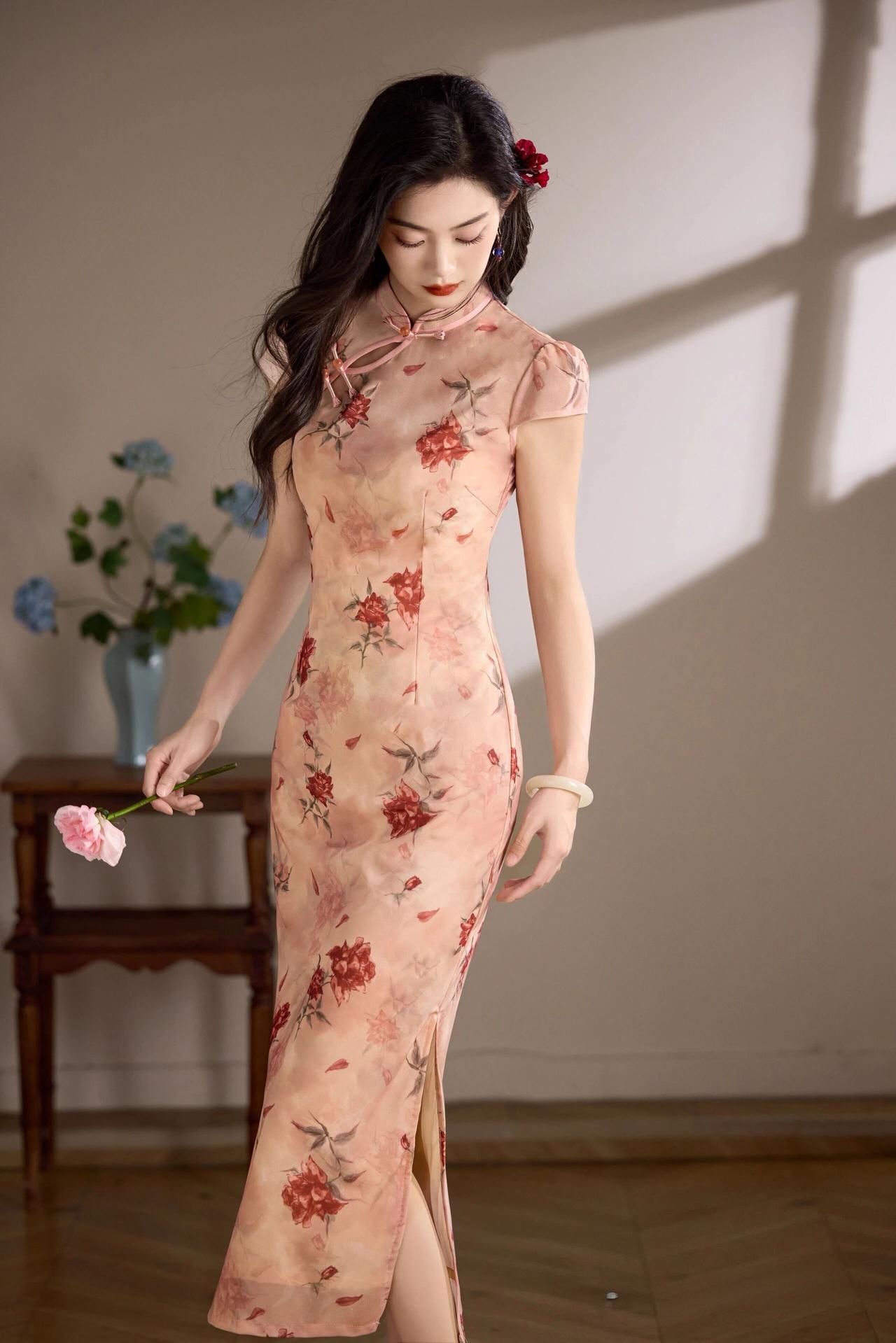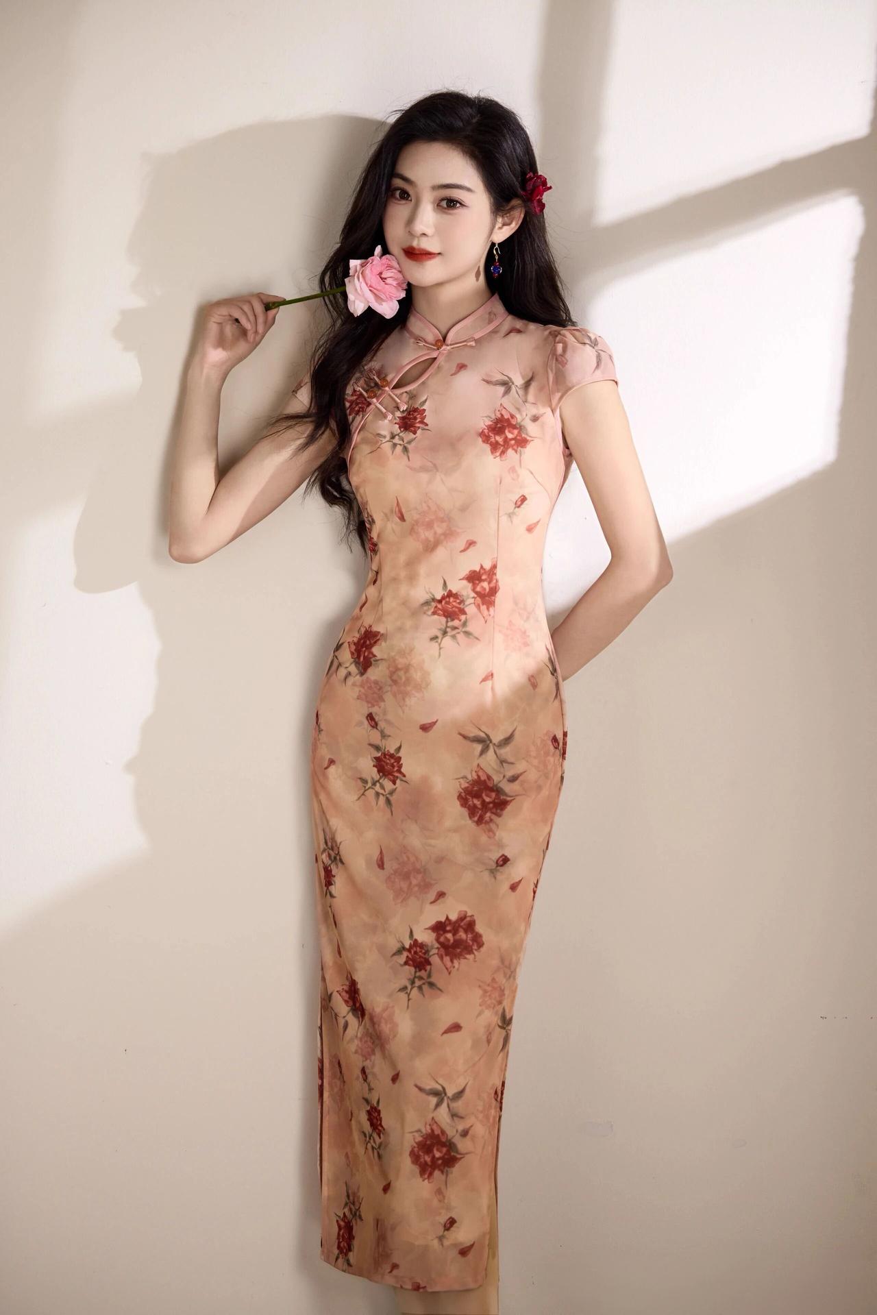 这组照片以“新中式旗袍写真”为主题,通过多场景与多姿态展现了东方女性的温婉与雅致。整体风格融合传统与现代,既有古典韵味,又不失时尚感,适合用于个人形象展示、文化宣传或时尚摄影。 旗袍造型与细节 - 旗袍款式:浅粉色底,饰以红色花卉图案,采用立领、盘扣设计,修身剪裁凸显女性曲线,下摆开叉增添灵动。 - 配饰搭配:发间点缀红色花朵,耳戴精致耳坠,腕戴玉镯,手持折扇或鲜花,细节处尽显东方美学。 - 妆容风格:红唇与自然眉形相得益彰,整体妆容清透温婉,突出女性柔美气质。 场景与氛围 - 背景设计:以素雅墙面、木质家具、古典屏风为背景,搭配柔和光线,营造出静谧而富有文化气息的氛围。 - 姿态表现:或倚墙而立,或持扇轻摇,或低头凝视,姿态优雅自然,展现出“静若处子,动若脱兔”的东方女性神韵。 风格定位与适用场景 这组照片适合用于: - 个人形象展示:展现个人气质与审美品味。 - 文化宣传:传递中国传统服饰之美。 - 时尚摄影:探索传统与现代融合的穿搭风格。 整体而言,这组照片通过细腻的造型与场景设计,成功诠释了“传统与现代共生”的美学理念,让观者感受到东方女性独有的温婉与力量。