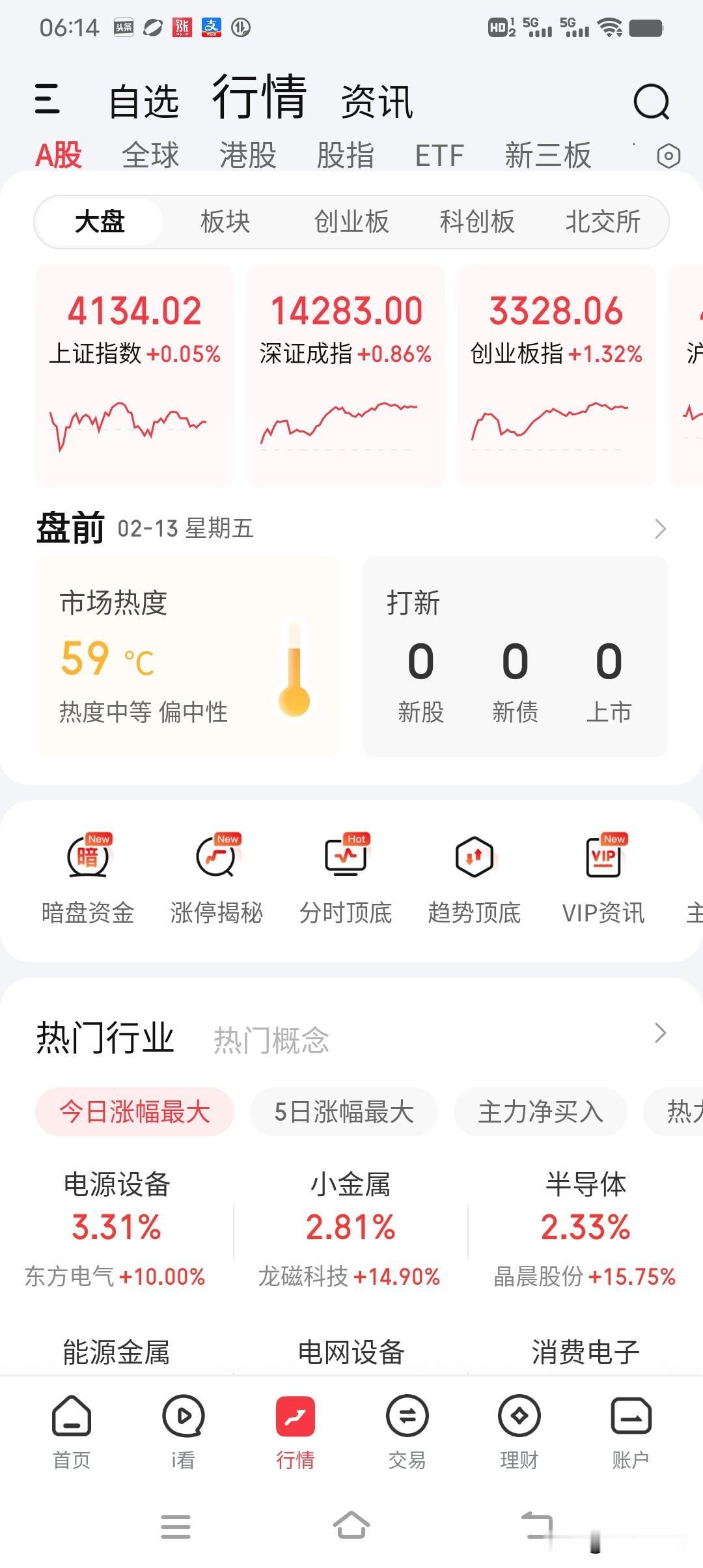 2月13日早评。美股有点麻烦,昨晚三大指数全线大跌,代表科技股的纳斯达克指数大跌2.03%(图1),中概股更是大跌3.30%(图3)。不过大家也不用过份解读,涨多了就要调整一下,A股没涨多少还反复调整呢! A股目前的整体情况是:沪指平均动态市盈率15.99,深成指39.34,创业板指58.6,科创板指高得有点离谱为198.57(图4、5、6、7)。所以科创板的票最好不要去动。 现在A股的市场热度是59℃(图2),温度适中,说明管理层对市场的掌握精准有效。静下心来想一想,有的时候,只要方向正确,慢一点也无所谓。人生不也是如此吗? 今天是蛇年最后一个交易日,估计各大指数是小阴小阳的走势,昨天开始的新一轮15分钟上涨结构中,目前运行到3浪结构,今天可能小幅回调后年初开盘再领红包。 祝大家今日好运,马年腾飞。