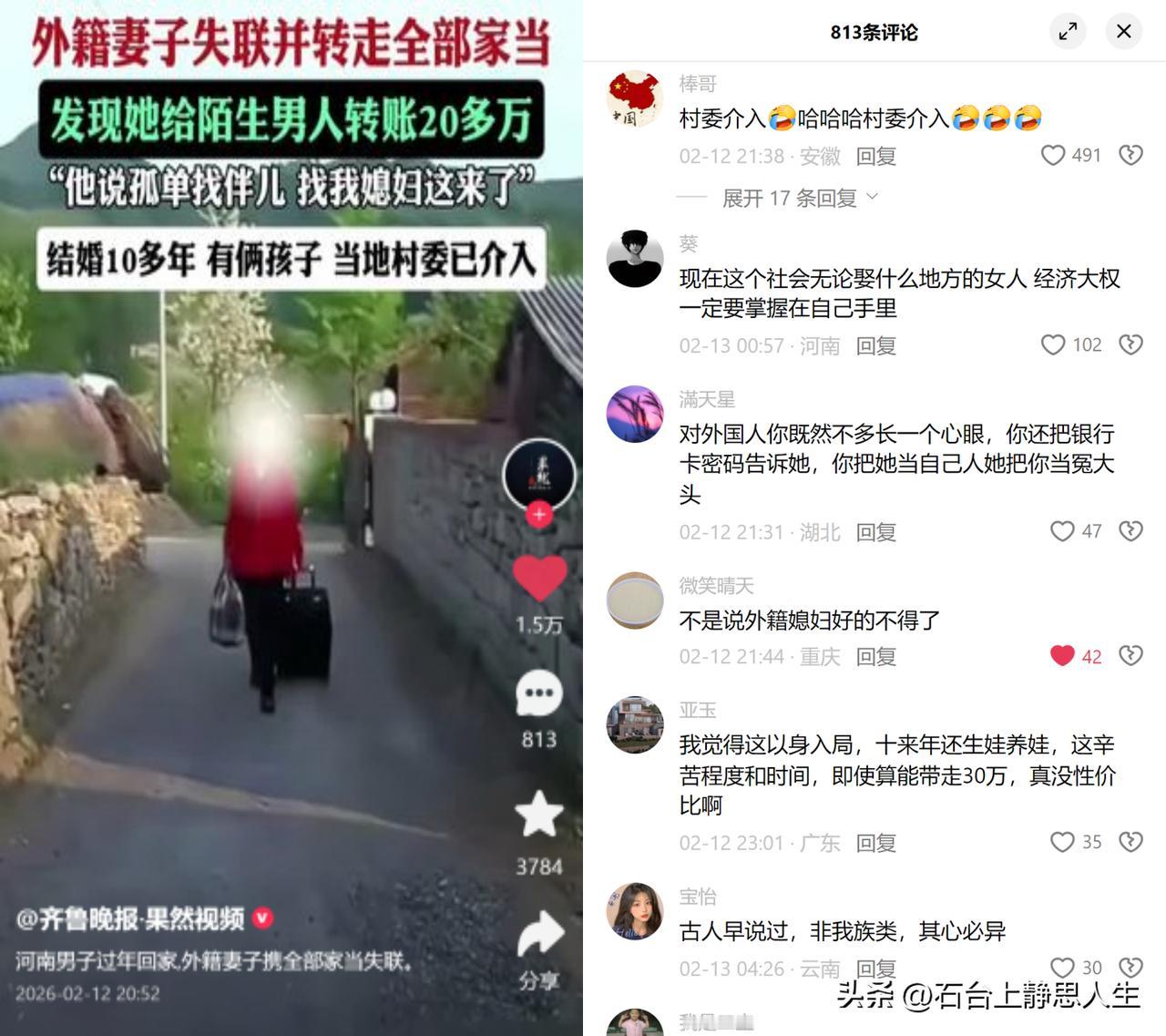 河南男子遭外籍妻子卷款失联 结婚10年育有两子,过年打工返乡,发现外籍妻子携20多万积蓄失联。 翻她微信才看到,钱全转给了陌生男子,对方还和妻子有暧昧聊天,朋友圈甚至有合影。 现在只有当地村委在协调。 好多人喊直接找帽子叔叔啊,可这样做真能拿回钱吗? 这事难就难在规则上,婚内共同财产,一般不算盗窃。想要官方立案,得证明妻子是非法占有加秘密窃取,难度大到离谱。 大概率最后只能走民事离婚分财产,可人都跑没影了,找都找不到,谈什么分割? 村委介入又有啥用?既没强制权力,也没法跨国找人,最多劝两句,根本解决不了实际问题。 最让人唏嘘的就是这点:底层夫妻攒了10年的血汗钱,遇上个背叛,想讨个公道却处处碰壁。 有人说该把钱攥自己手里,有人扯非我族类,可本质是,普通人面对规则壁垒时,连门道都摸不着。 换作是你,碰到这种事,能咋办?