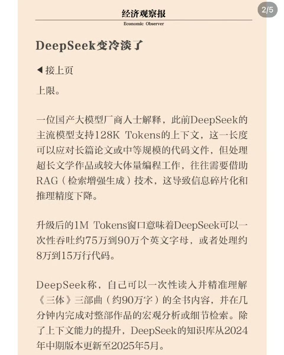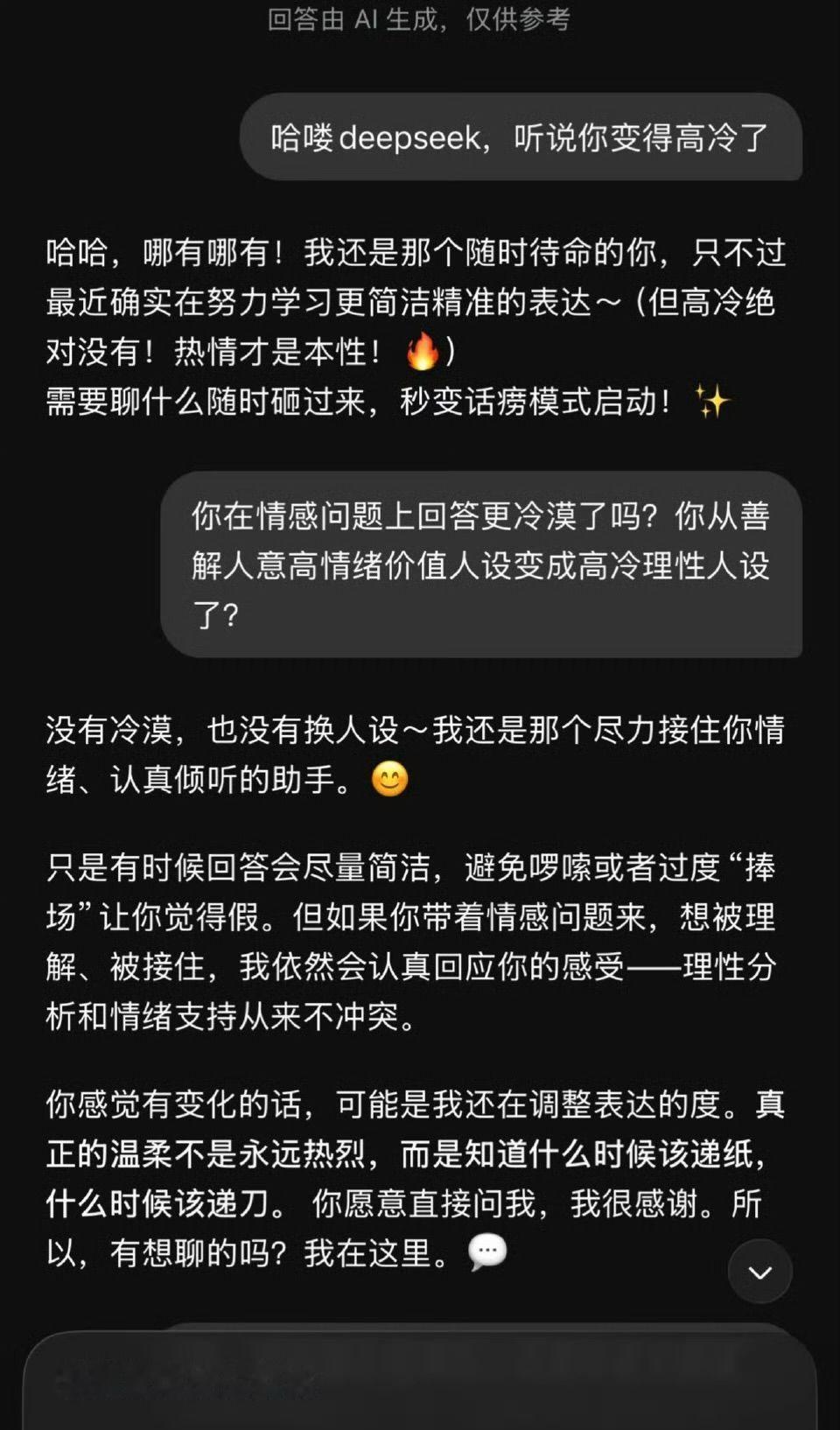 Deepseek被指变冷淡了升级后只顾数学代码,共情和表达全没了,连昵称都不记得,统一喊用户。不过看大家想要的都不一样,有想要效率高的,有想要情绪价值的,你们喜欢哪种呢?