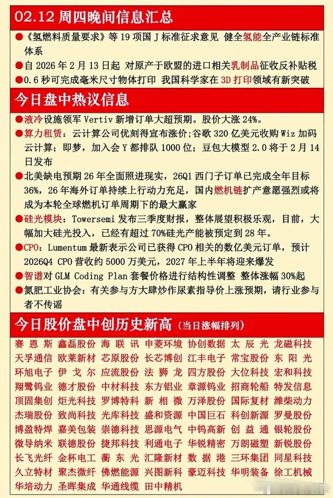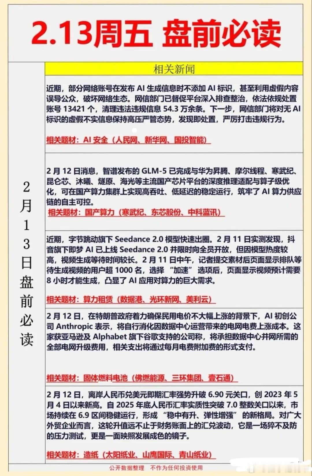 2月13日周五盘前必读出炉!节前最后一个交易日,八大热点赛道龙头名单出炉,万亿流动性加持,红盘收官稳了?首先说一个重大利好,央行放大招2月13日将开展10000亿元买断式逆回购操作,期限6个月!万亿流动性“精准滴灌”,节前最后一个交易日流动性宽松预期拉满……再分享一下12日晚间重磅利好:氢能标准完善、3D打印技术突破、对欧盟乳制品征税等政策密集落地…节前最后一个交易日,主线明确,红盘可期。