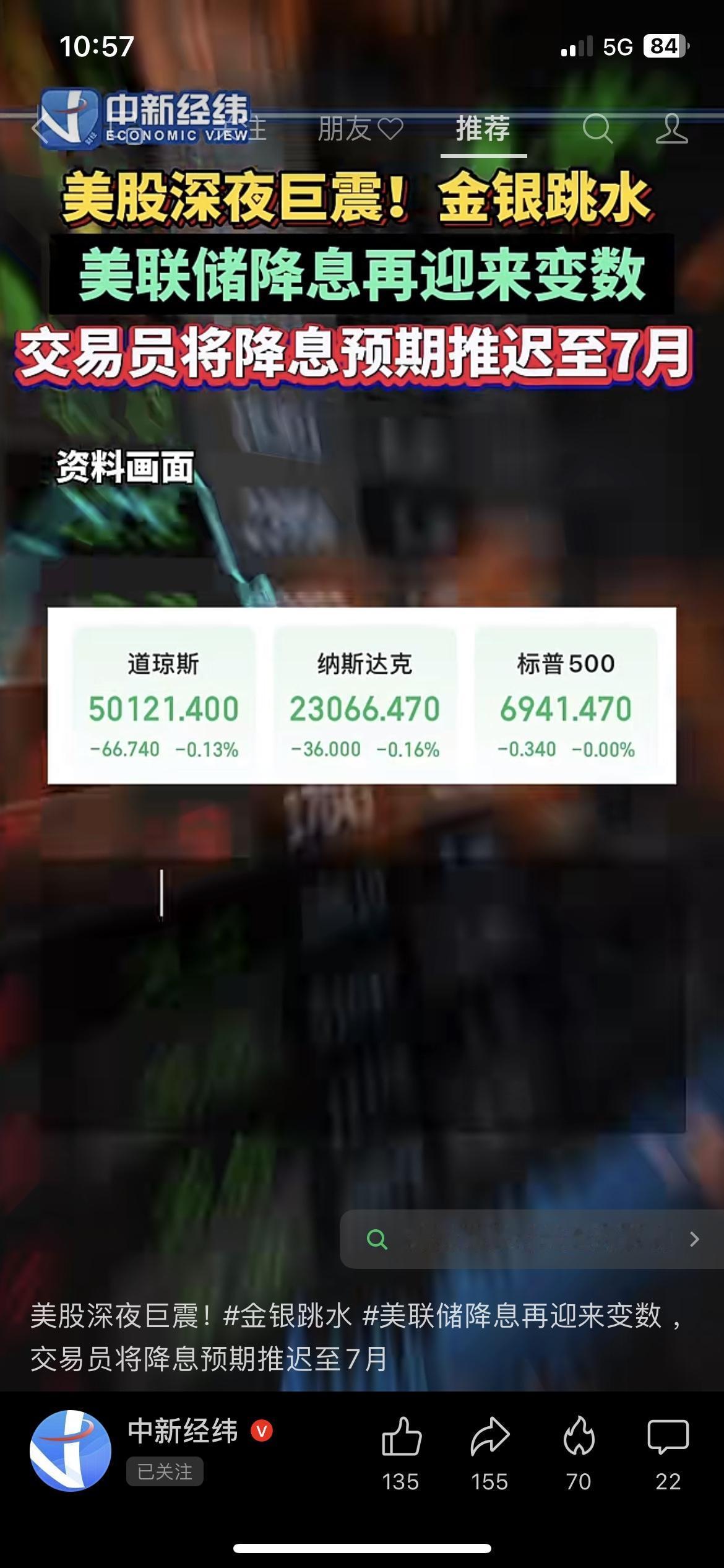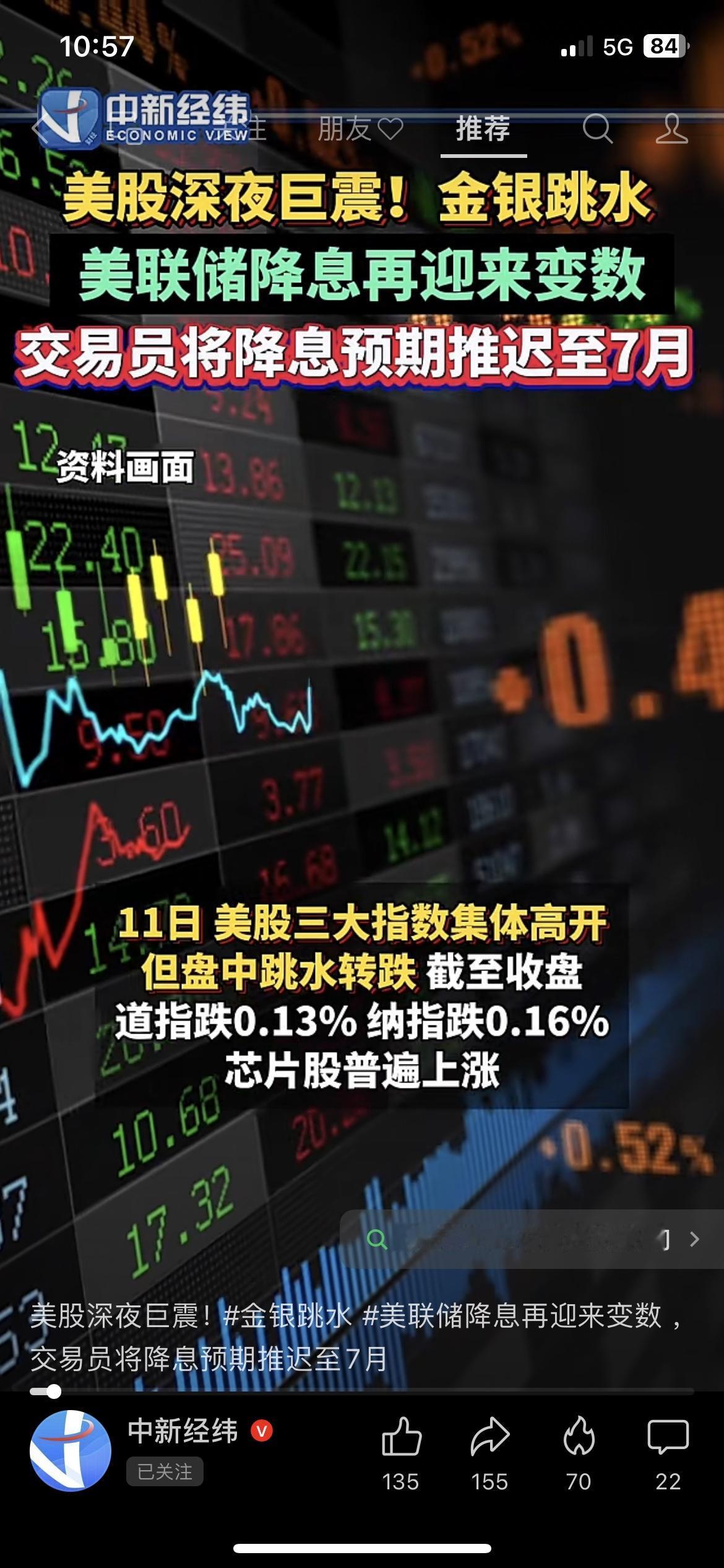 美联储降息预期再度调整!交易员将时间窗口从6月推迟至6—7月,美股深夜巨震转跌,金银短线跳水。这是全球市场最关键的政策信号,意味着货币宽松节奏放缓。普通人不用频繁操作,但一定要看懂:预期变了,市场节奏也会跟着变。 市场有风险,投资需谨慎。 你会因降息预期调整投资策略吗? 美联储降息预期 美股巨震 金银跳水