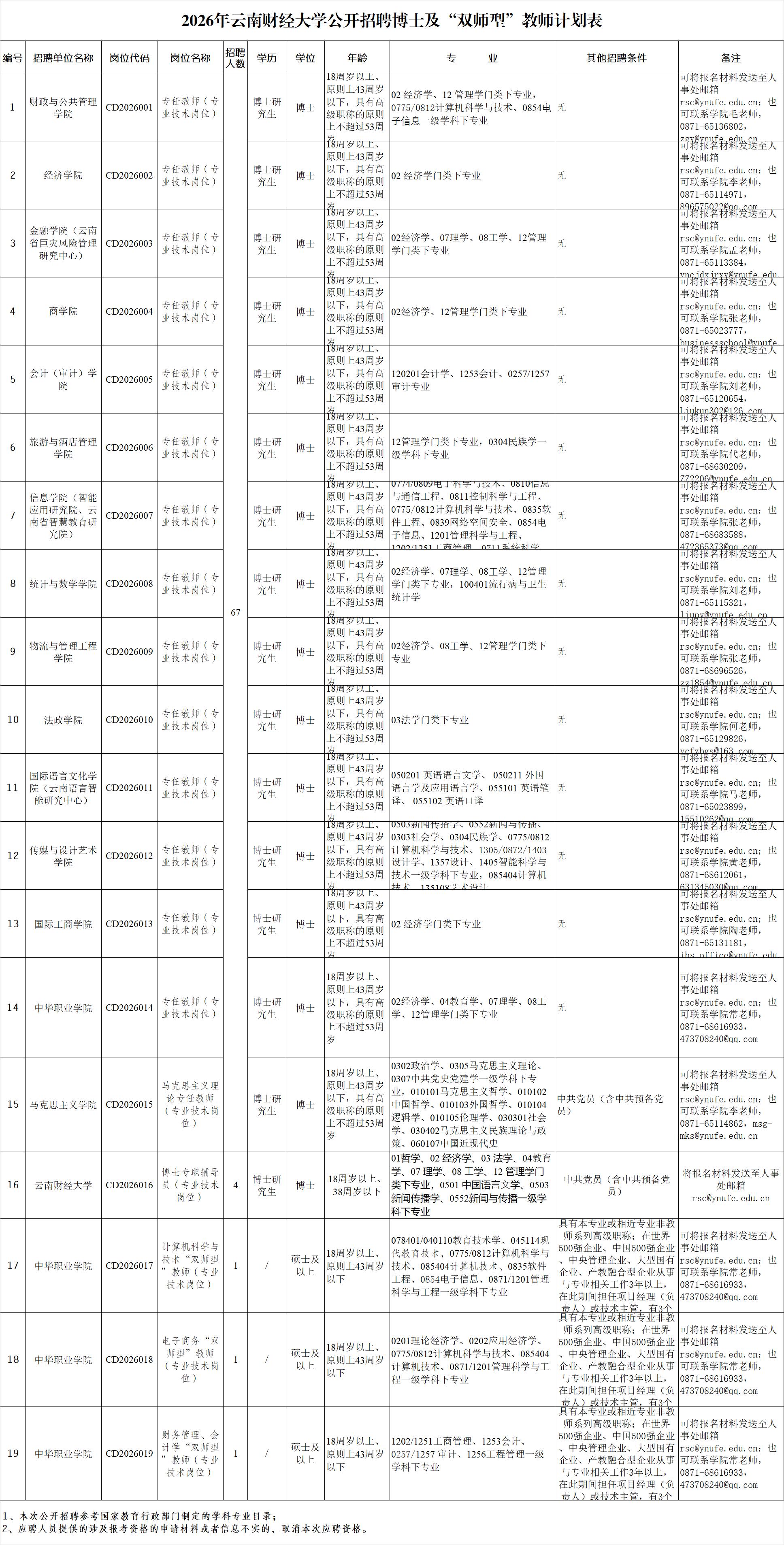 云南财经大学2026招聘博士及双师74名。按照《事业单位公开招聘人员暂行规定》(人事部令第6号)《云南省事业单位公开招聘工作人员办法》(云人社发〔2016〕182号)等法律法规,根据工作需要,经省教育厅审核同意报云南省人力资源和社会保障厅核准,2026年云南财经大学面向社会公开招聘博士及“双师型”教师74名,现将有关事项公告如下: 符合相关岗位条件要求和本公告其他要求的人员均可报名。具体招聘范围和条件,详见《2026年云南财经大学公开招聘博士及“双师型”教师计划表》。博士专任教师(代码CD2026001至C
