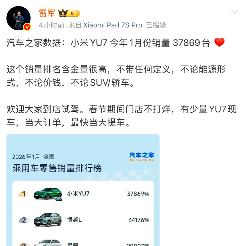 从1月乘用车零售销量数据来看,小米YU7销量最高,接近3.8万辆,拿下全品类、无定语的销量冠军,远超特斯、吉利、大众、日产等热门车型,成为全品类、无定语销量冠军,这一成绩含金量十足。雷军4小时前发博透露,汽车之家这个销量排行不区分能源类型、价格区间与车型品类,小米YU7作为20万元以上高客单价的纯电车型实现全品类登顶,具有重要意义,标志着高端智能电动车已获主流市场高度认可。