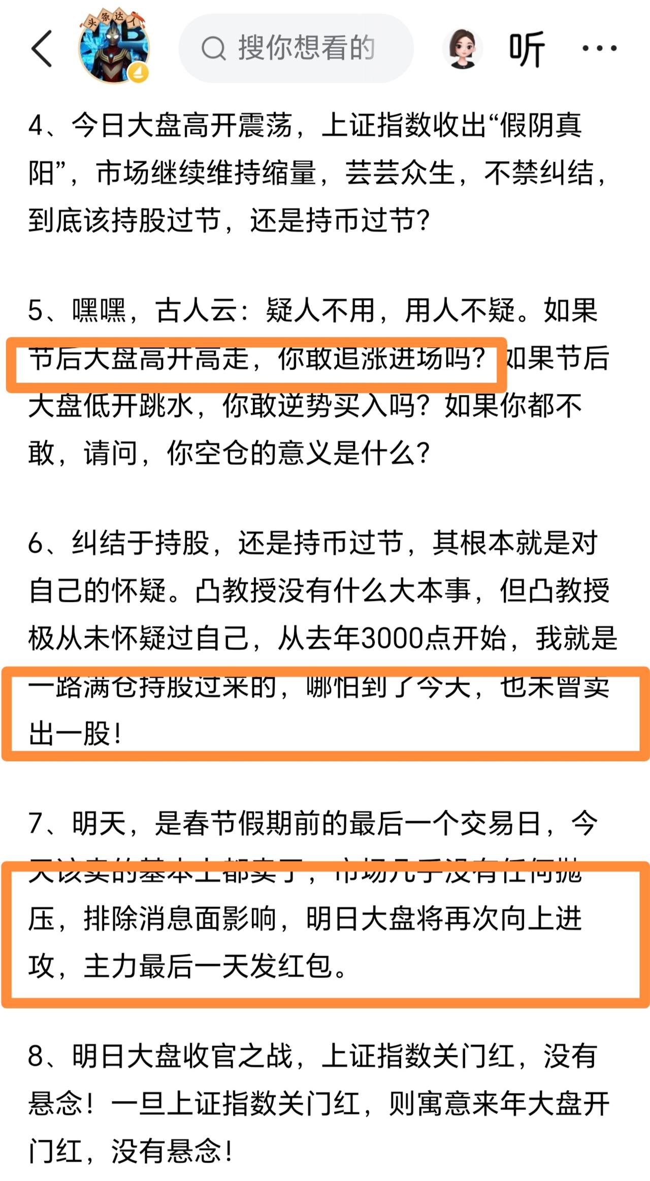 假阴真阳!凸教授深夜发文?最后一个交易日收阳,完成“闭门红”。凸教授预言,春节后市场将高开高走,建议投资者持股过节,耐心等待市场反弹。凸教授期待闭门红和春节后的开门红,凸教授用的词语是“毫无悬念”,他也是满仓待涨之中!