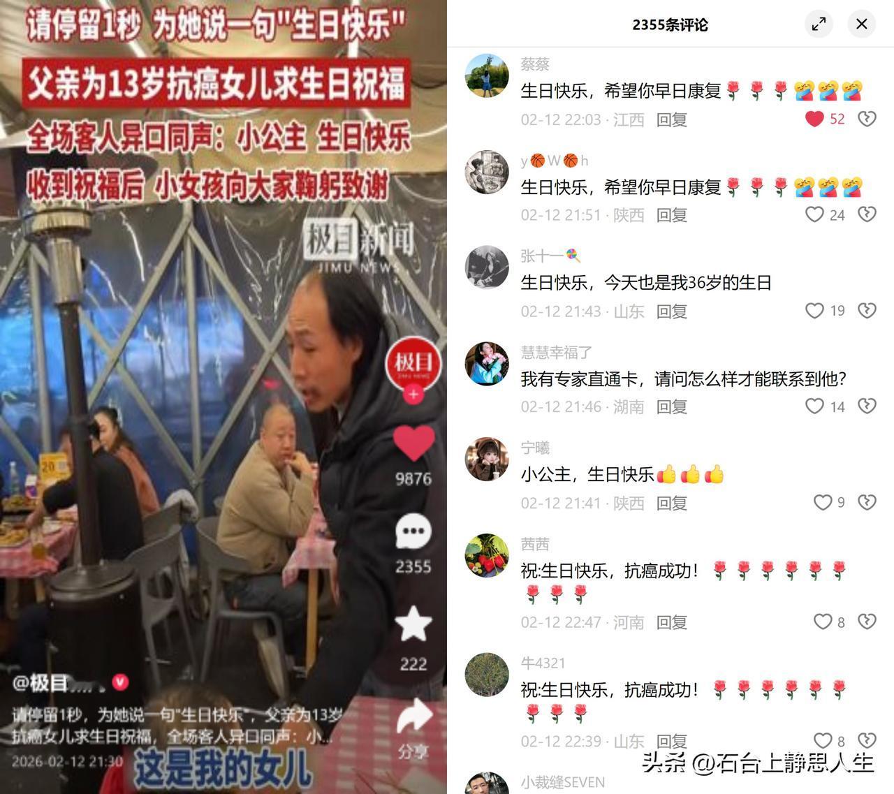 成都餐馆,满场人为抗癌女孩庆生! 13岁抗癌女孩的爸爸,攥着衣角红着眼,声音发颤地求大家给女儿补个生日祝福。 客人们愣了短短一秒,紧接着异口同声喊:“小公主,生日快乐!”女孩睫毛挂着泪,却笑着鞠躬道谢。 这年头谁不是行色匆匆? 连跟邻桌搭话都觉得尬,居然一群陌生人愿意放下防备,同步喊出祝福! 这哪是一句生日祝福啊,是给这对父女硬生生续的人间热望! 比起那些贵得离谱的礼物,这满场的善意,才是能扛过化疗的最硬底气! 留言里还有人主动说有专家直通卡,要帮忙联系医疗援助,你看,善意从来都不止一点点,它更是能燎原的光! 对了,四川的家长们记一下:儿童急性淋巴细胞白血病化疗药全额报销! 还有这些慈善渠道能申请救助: 四川省医药爱心基金会携手抗白、成都予爱公益的儿童白血病救助计划,打028-83336261找同心慈善基金会的守护小天使项目也行。 多转一次,就多给抗癌家庭一份盼头!