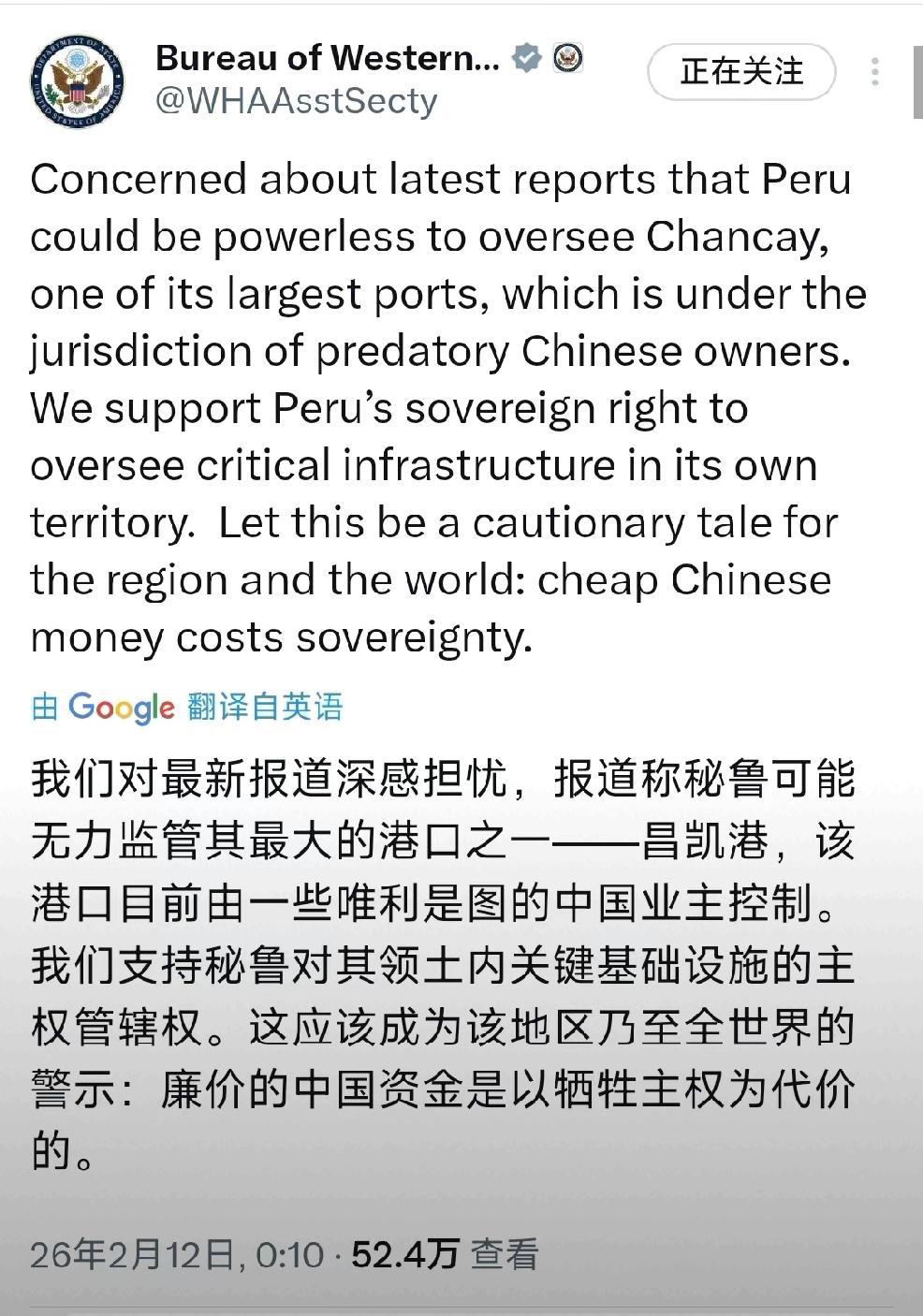 2月12日外媒报道,秘鲁的钱凯港,遭到美国国务院西半球事务局的警告:“廉价的中国资金是以牺牲主权为代价的”。 个人认为:中国在秘鲁做了什么?2025年前10个月,秘鲁渔业出口增长25%,创历史新高。其中一半销往中国。秘鲁的水果,蓝莓葡萄等快捷的运往中国,这使得秘鲁这几年对华出口水果大幅增长。2024年11月开港以来,上海到秘鲁的直航时间从33天缩短到23天。 美国在秘鲁做了什么?拿出15亿在我国港口不远处,修建军事基地,便于美国控制秘鲁。现在又对钱凯港造谣抹黑,大概率猜测,美国又在秘鲁暗中发动颜色革命,扶持秘鲁国内的反对派议员,提出罢免动议,错误的引导这件事情从程序违规向贪污受贿转变,据秘鲁信息,罢免动议目前只争取到了20个议员签字,离简单多数的65票还差的遥远。美国不会就此善罢甘休,只怕会直接动用武力干涉秘鲁,这是见效最快的手段,至于合不合法?,合不合规?,是否存在主权问题?则是美国总统特朗普毫不关心的问题。 巴拿马运河事件还没结束,澳大利亚达尔文港事件正在进行,秘鲁的钱凯港正在进行。美国如此疯狂,我们不但要看到猖狂的一面,同时我们应该看到为何如此猖狂?深度原因,那就是美国危机爆发时间越来越近了,已经不允许美国再拖延了,只好直接动手硬抢了。 如果美国直接动手抢,还不能解决问题,那该怎么办?美国只有看着自身毁灭。