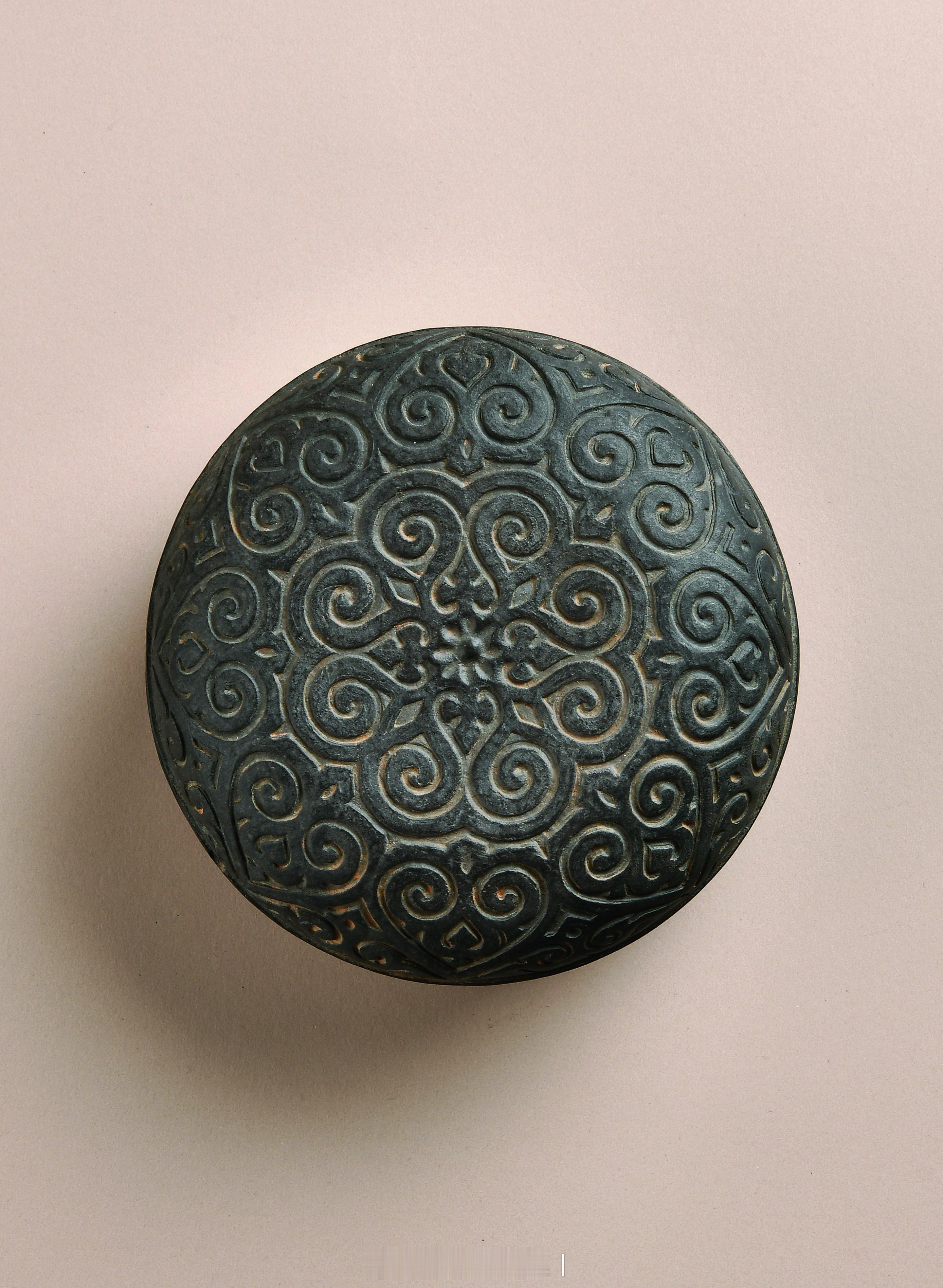 器作圆形扁盒状,陶胎仿剔犀而制,整体由盒盖盒身两部分组成,口缘间设企口可盖合。盖面及盒身外壁以剔刻手法表现卷云纹,纹饰剔刻爽利浅显,线条流畅柔和,具有宋代文人用器简约特点。下承浅圈足,足内底面平整。通体呈相熟旧,包浆老道,小巧可人。