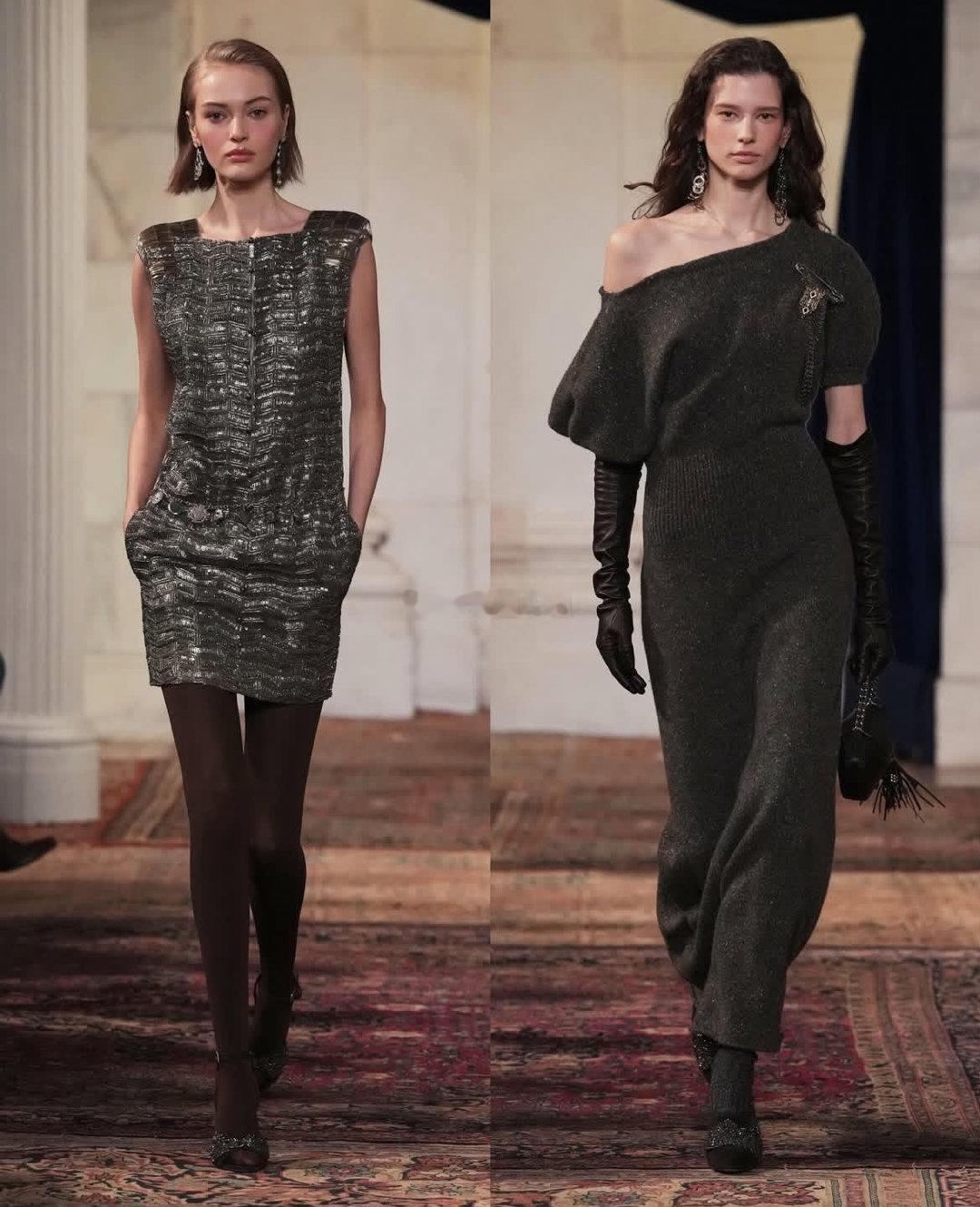 吉吉·哈迪德双造型开场压轴:粗花呢束身衣飒气开场,丝绒挂脖裙锁子甲袖笼闭场,又美又韧🖤