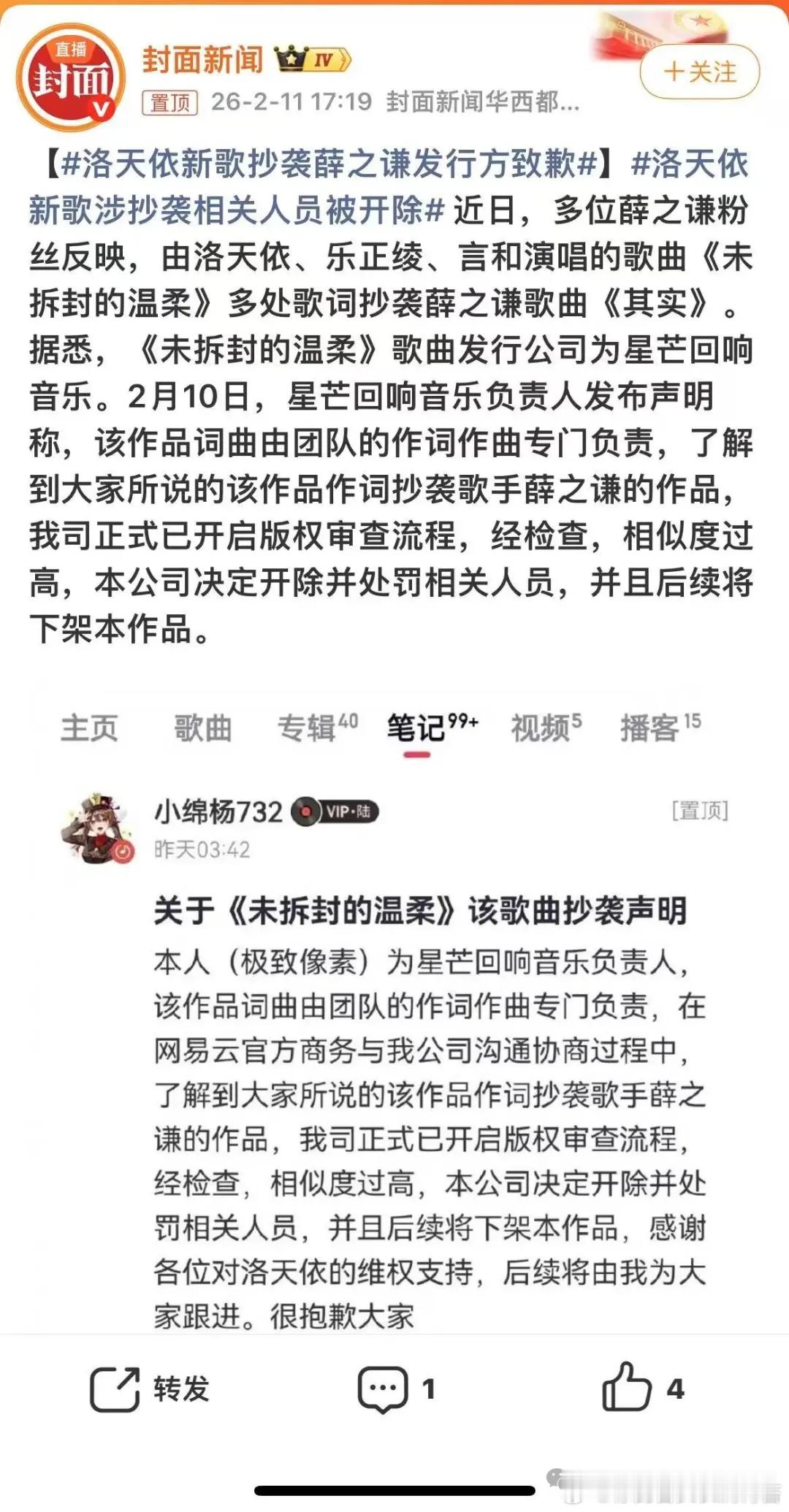洛天依新歌涉抄袭相关人员被开除 事情很简单:多位薛之谦歌迷发现,这首标注由洛天依演唱的新歌,歌词大面积复制粘贴了薛之谦2013年的代表作《其实》。