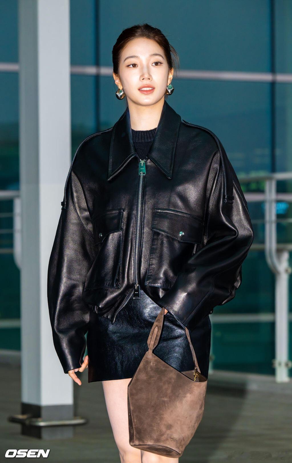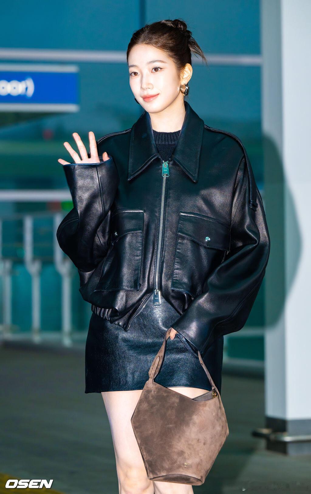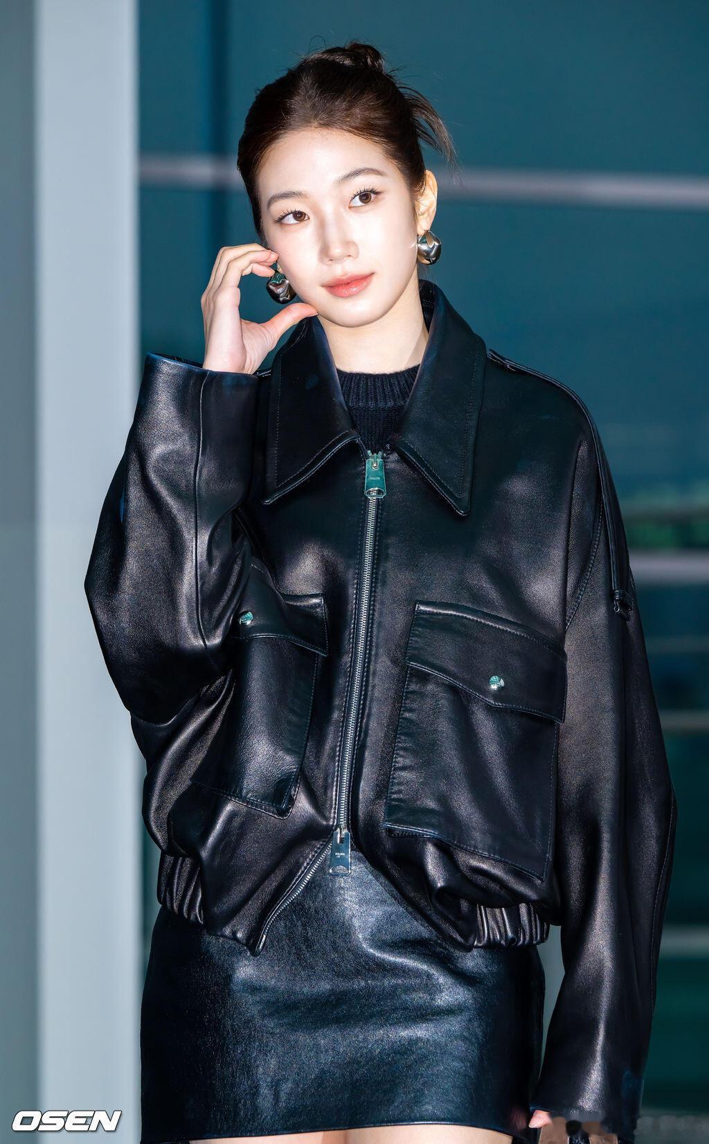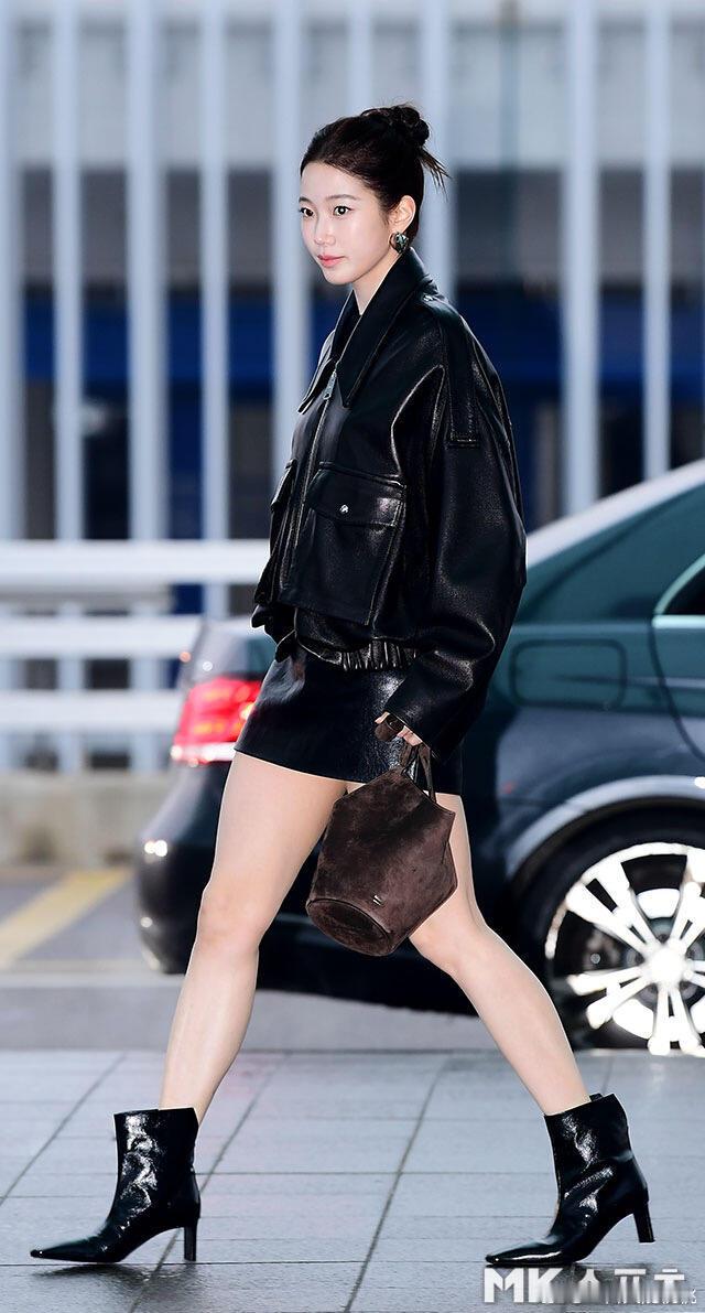中村一叶出发纽约机场启程时装周✈️ ,廓形黑色皮衣皮裙搭配短靴,简单时髦。她即将出席品牌khaite秋冬时装秀纽约时装周