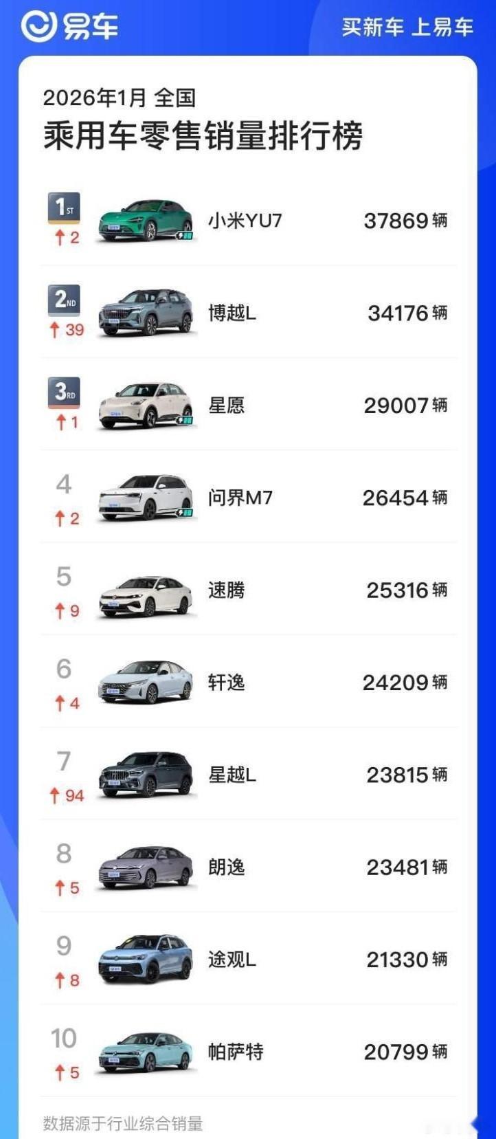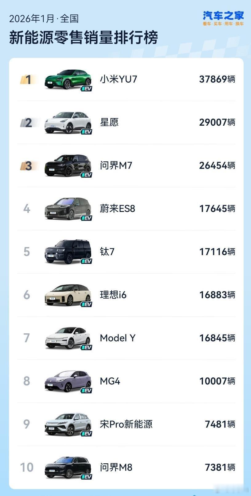 这个是真的没想到,一月份“不加定语”的销冠居然是小米YU7,没有价格限定、没有车型限定,销量达到了37869辆,超过了问界M7、特斯拉Model Y等等核心对手,也比日产轩逸、大众速腾、吉利星越与博越更热卖。我觉得,销量就是实力的最好证明,大家在街头看到的小米YU7也是越来越多,这都反映了用户对小米汽车的认可。至于那些时不时出现的黑料,相信明白人自然会有自己的判断,有多少是被某友商带了节奏的,大家心里都懂!小米汽车逆袭登顶新能源榜首小米YU7一月销量37869辆 小米YU7