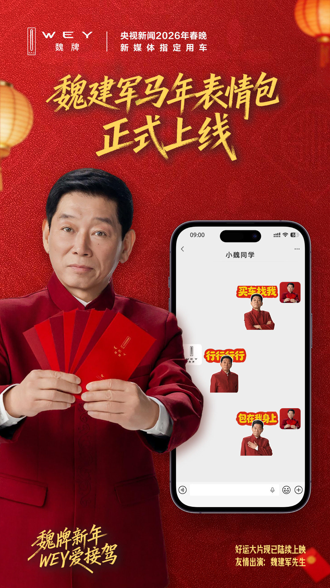 比如今天上线的新年表情包,在微信“我”-“表情”-“魏建军马年表情包”三步,即可免费使用,大家可以通过表情包的“接接接接接接好运” 魏建军表情包开魏牌接好运