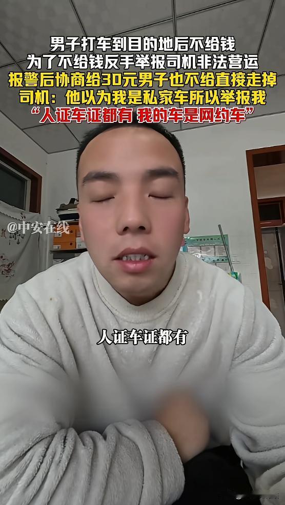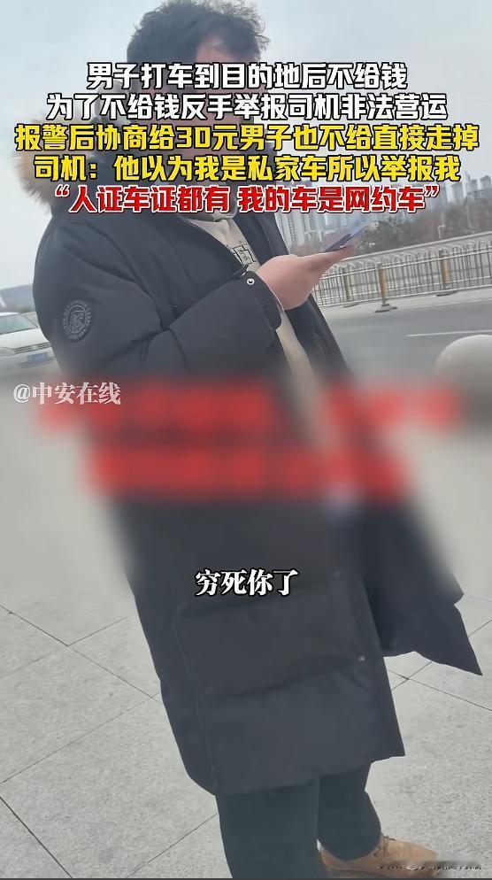 “脸都不要了!”2月9日,陕西,一男子打车,到目的地后不给钱,为了白嫖,还反手举报司机非法运营,气得司机找他理论,见沟通无果,司机只能报警,报警后协商给30元,没想到男子依然不肯,直接走掉了!网友:活不起了? 山西晋城的这个故事,发生在2月9日那个寒冷的街头,它把“老实人吃亏”这句话,演绎得淋漓尽致,甚至让人感到一丝寒意。 事情的起因,简单到不能再简单,网约车司机老张接了个长途单,从阳城县一路跑到晋城东站,里程表实打实地跑了70多公里。 为了赶时间,老张在路上还自掏腰包垫付了20块钱的高速过路费,到了目的地,他对这位男乘客报出的车费总共只要50元。 稍微懂点行的人,哪怕心算一下都知道,这50块钱里扣掉20块过路费,再刨去70公里的油钱和车辆磨损,老张这一趟基本是在做义务劳动,赚的也就是个辛苦钱。 可让人没想到的是,这位乘客下车后的一连串操作,简直是教科书级别的“赖账”,他既没有掏现金,也没有扫码付款,而是当着老张的面,极其淡定地掏出手机,拨打了交通运输服务监督电话。 这显然不是什么正当维权,而是一种恶毒的博弈,这位乘客心里的小算盘打得精:他认定老张开的是私家车,八成没有营运资格。 只要当面举报,司机为了怕那动辄上万的非法营运罚款,肯定会吓得屁滚尿流,这50块钱自然也就不敢要了,他试图把行政监管手段,变成自己逃单的免费筹码。 但他这次算是踢到了铁板上,老张并不是那种跑黑车的司机,面对威胁,他二话没说,直接亮出了“双证”——《网络预约出租汽车运输证》和《网络预约出租汽车驾驶员证》,手续齐全,合规合法。 眼看“举报讹诈”这招失灵了,这位乘客瞬间撕下了伪装,从“虚假维权”无缝切换到了“地痞无赖”模式,他的态度很明确:既然吓唬不住你,那我就硬赖,反正我就是不给钱。 老张气不过,只能选择报警,民警赶到现场后,面对这种金额极小的经济纠纷,其实也很难办,为了尽快解决问题,民警提出了一个极其无奈的折中方案:让乘客只付30元。 这个数字意味着什么?意味着老张连那20块钱过路费和油钱都很难收回,纯粹是为了止损,在寒风中耗了40多分钟,老张为了不耽误后续拉活,咬牙同意了这个“亏本”方案。 可荒诞的一幕发生了,即便价格已经压低到了尘埃里,这名男子依然油盐不进,坚持“一分钱不给”,最后,趁着现场人员交涉的空档,他竟混入车站的人流,消失得无影无踪。 留给老张的,只有一肚子的委屈和一张合法的证件,他遵纪守法,垫付了路费,耗费了油钱和时间,最后得到的却是负收益。 而那个恶意逃单的人,仅仅凭着厚脸皮和一通虚假的举报电话,就白嫖了一次几十公里的专车服务,还能全身而退。 这件事最让人心寒的地方,不在于那几十块钱,而在于它暴露出的某种逻辑漏洞:一个守规矩的劳动者想要自证清白,成本如此高昂;而一个毫无底线的人想要破坏规则,成本却低得几乎为零。 这名男子为了省下那,甚至不够吃顿像样饭的30块钱,当众透支了自己作为成年人的全部体面,这笔道德账,他是彻底破产了。