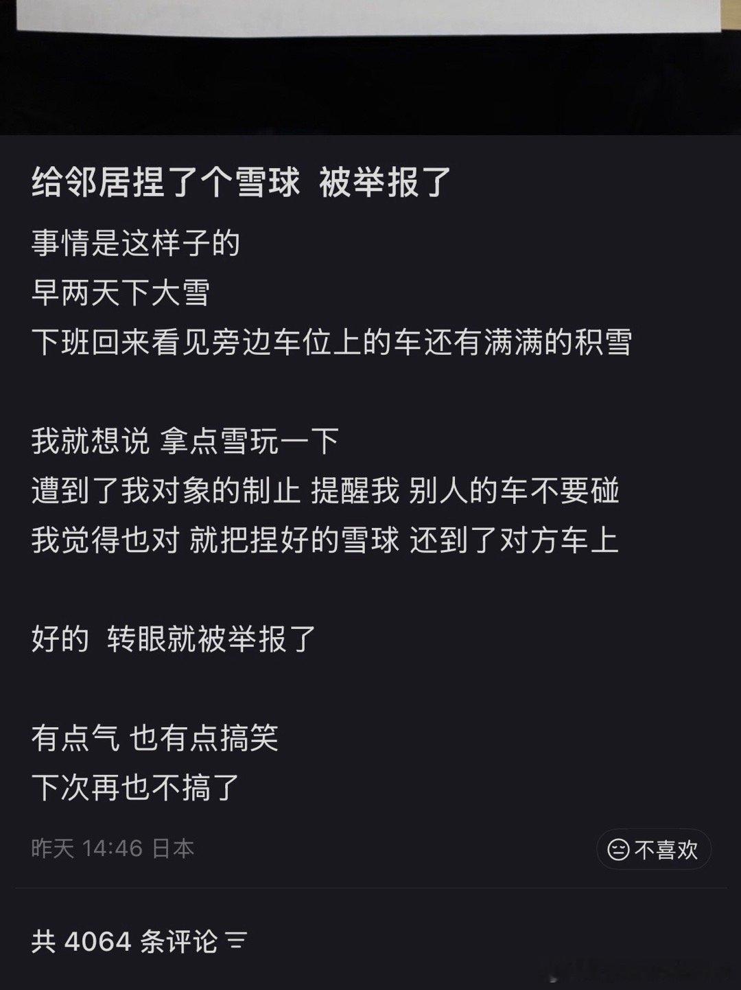 在日博主:“用日本邻居车上的积雪捏了个雪球被投诉举报了”