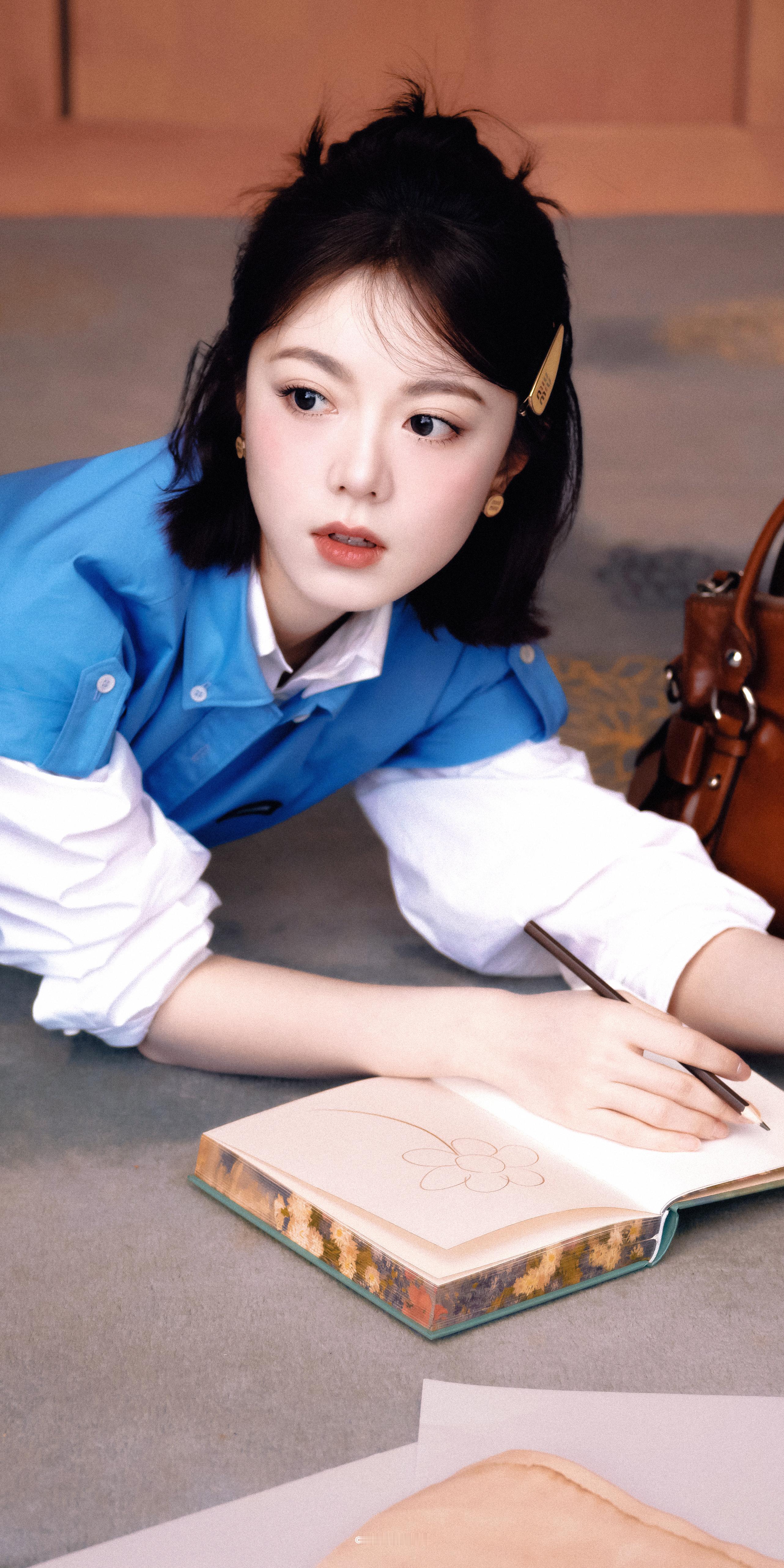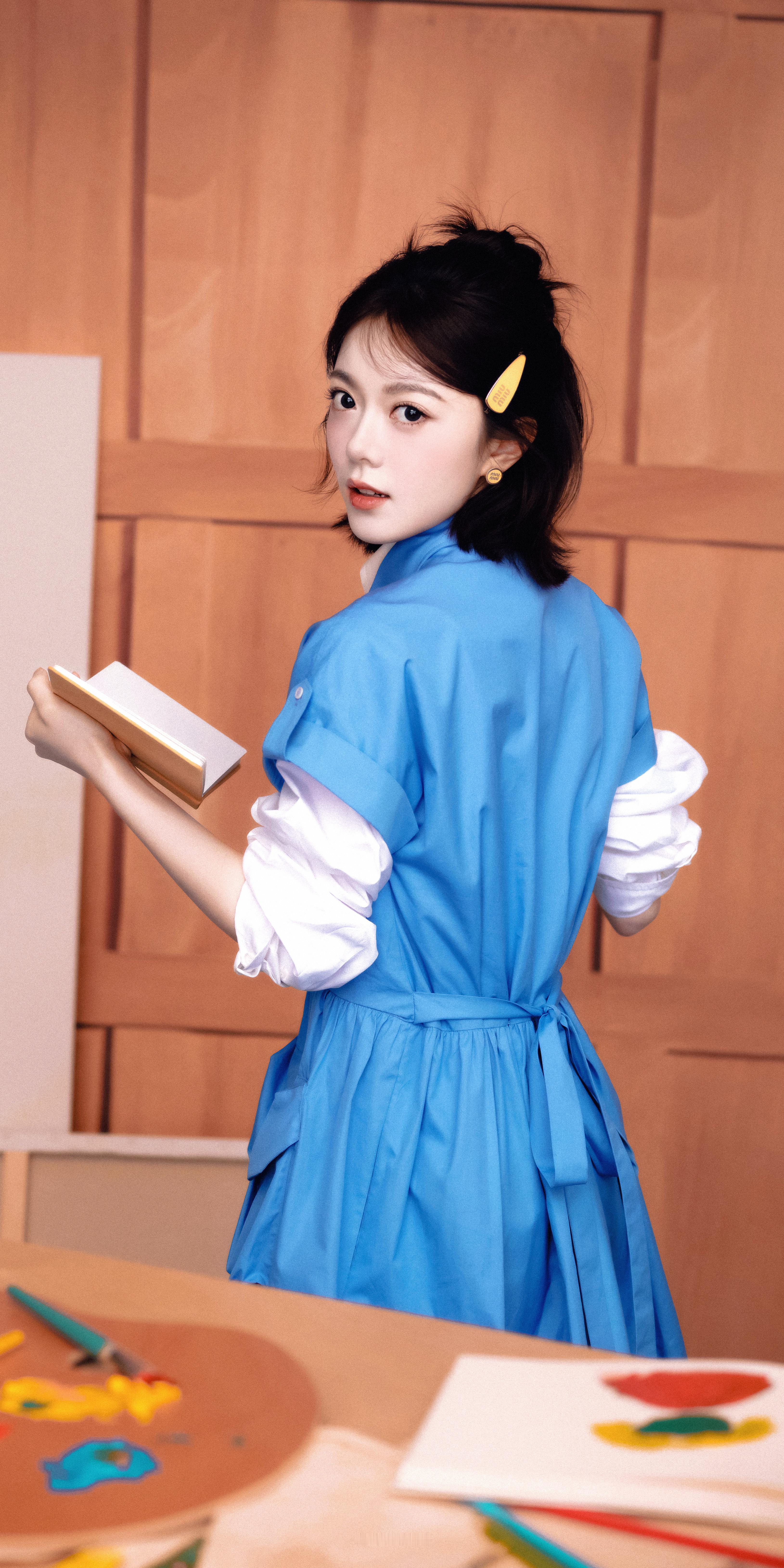 蓝色连衣裙造型,文艺清新感溢出屏幕,半丸子头可可爱爱,温柔靠谱学姐本人没错了。