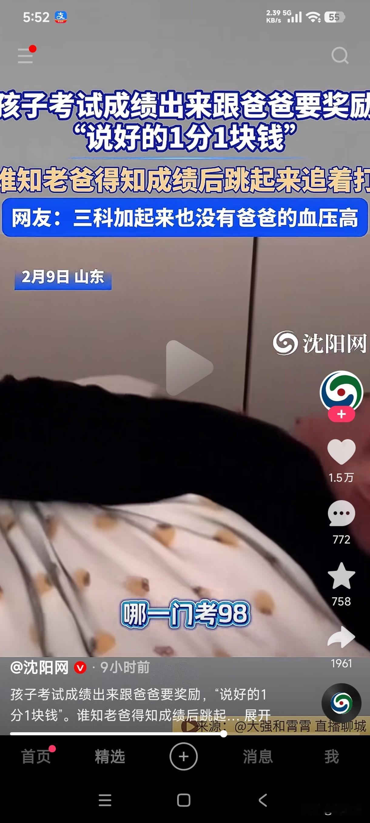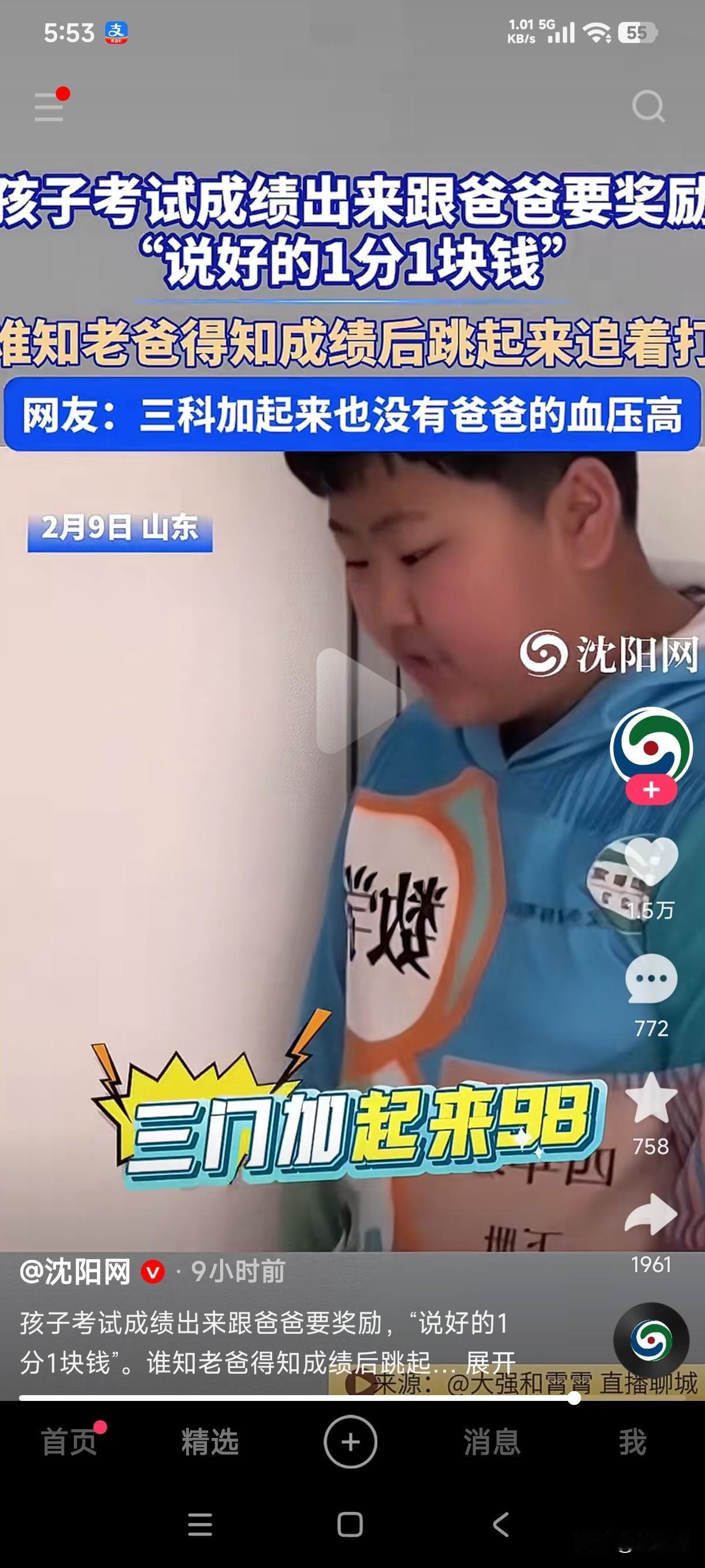 孩子期末考试成绩出来后跟爸爸要奖励,说好的1分1块钱,孩子只说98分,爸爸问哪一门考了98分,结果孩子说三门加起来98,得知三门加起来考了98,睡觉的爸爸立即跳起来追着孩子打。 这究竟是爸爸当初给孩子没有说明白,还是这孩子天生胆子就大,三门加起来98也敢跟爸爸要奖励,有可能是当爹的当初给孩子没有说明白,就说一分一块钱,也没说清楚是总分或者单科成绩,所以孩子三门加起来考98去跟爸爸要奖励也没毛病吧?三门加起来还没有爸爸的血压高,这孩子也敢要奖励,这奖励没要到,肯定奖励一顿揍!
