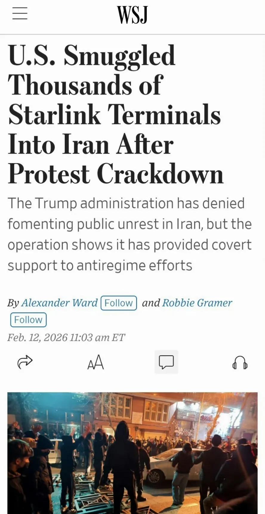 美国《华尔街日报》报道称,在今年1月的伊朗动乱期间,美国政府向伊朗境内走私了至少6000台“星链”接收终端,清楚地表明美国在为伊朗动乱推波助澜,试图颠覆伊朗现政权,但是未能得逞。 恼羞成怒之下,美国如今又试图以武力来颠覆伊朗现政权。 当然,也有很多分析认为,美国总统老特被爱泼斯坦事件搞得很狼狈,所以就拼命搞事儿,不管是声称要吞并格陵兰岛,还是摆出打击伊朗的架势,都是为了转移美国民众和舆论的视线。