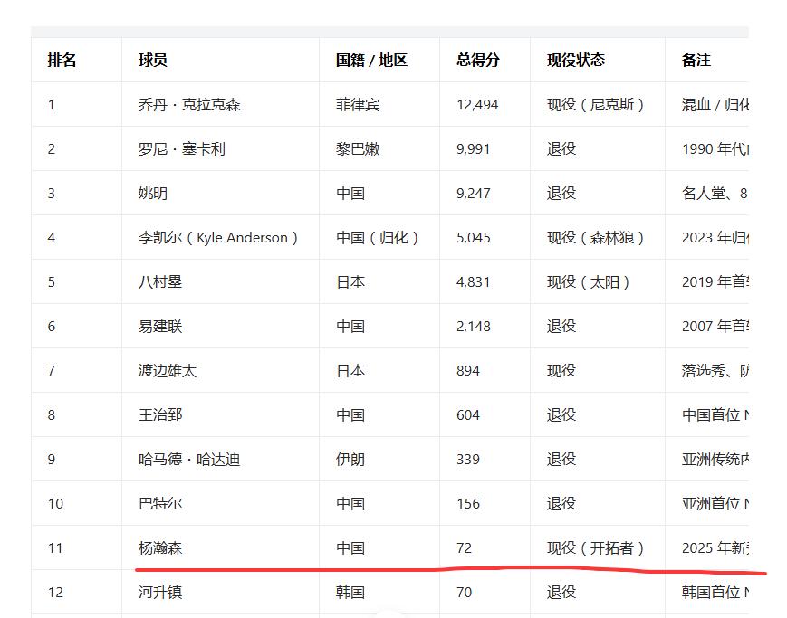 上场就得分,杨瀚森NBA总得分来到72分,独享亚洲球员得分榜第11名! 现在是越来越好了,虽然出场时间不多,但是只要在NBA就有进步。 他的好兄弟马鲁阿奇也有斩获,昨天替补出场12分钟,拿下6分6板1盖帽。 除了得分,还有隐形贡献,瀚森掩护1挡2,一次进攻中亨德森突破,借助小杨掩护,空篮轻松上进(见动态图)。 小杨的爸爸近期接受采访也说,他心态很轻松,也很努力。 接下来我们就看他全明星新秀赛的表现了。[呲牙]